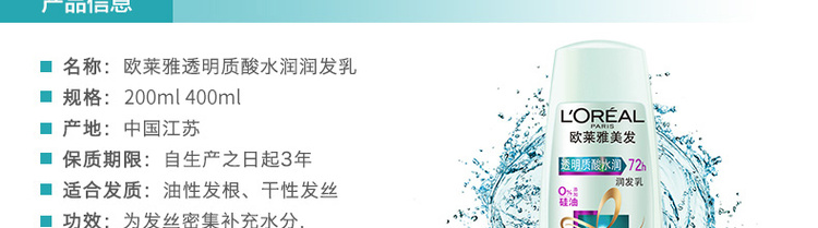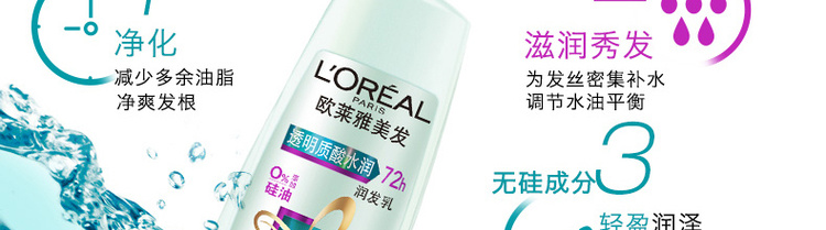 【秒杀】欧莱雅透明质酸水润润发乳400ml