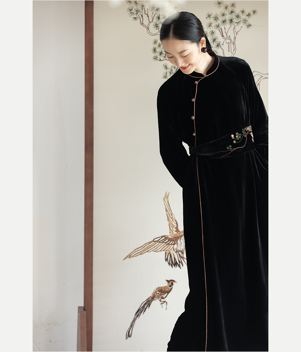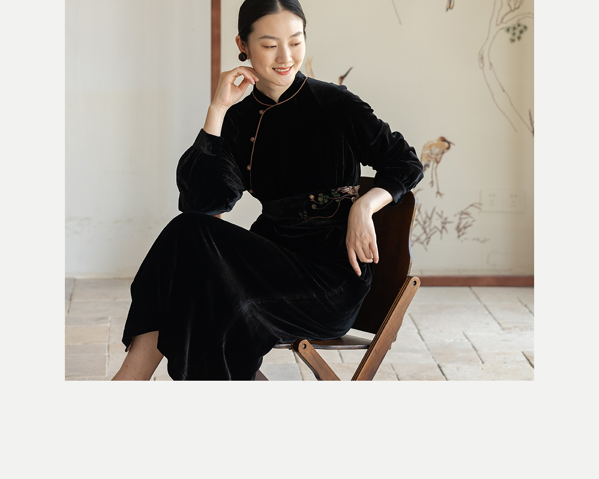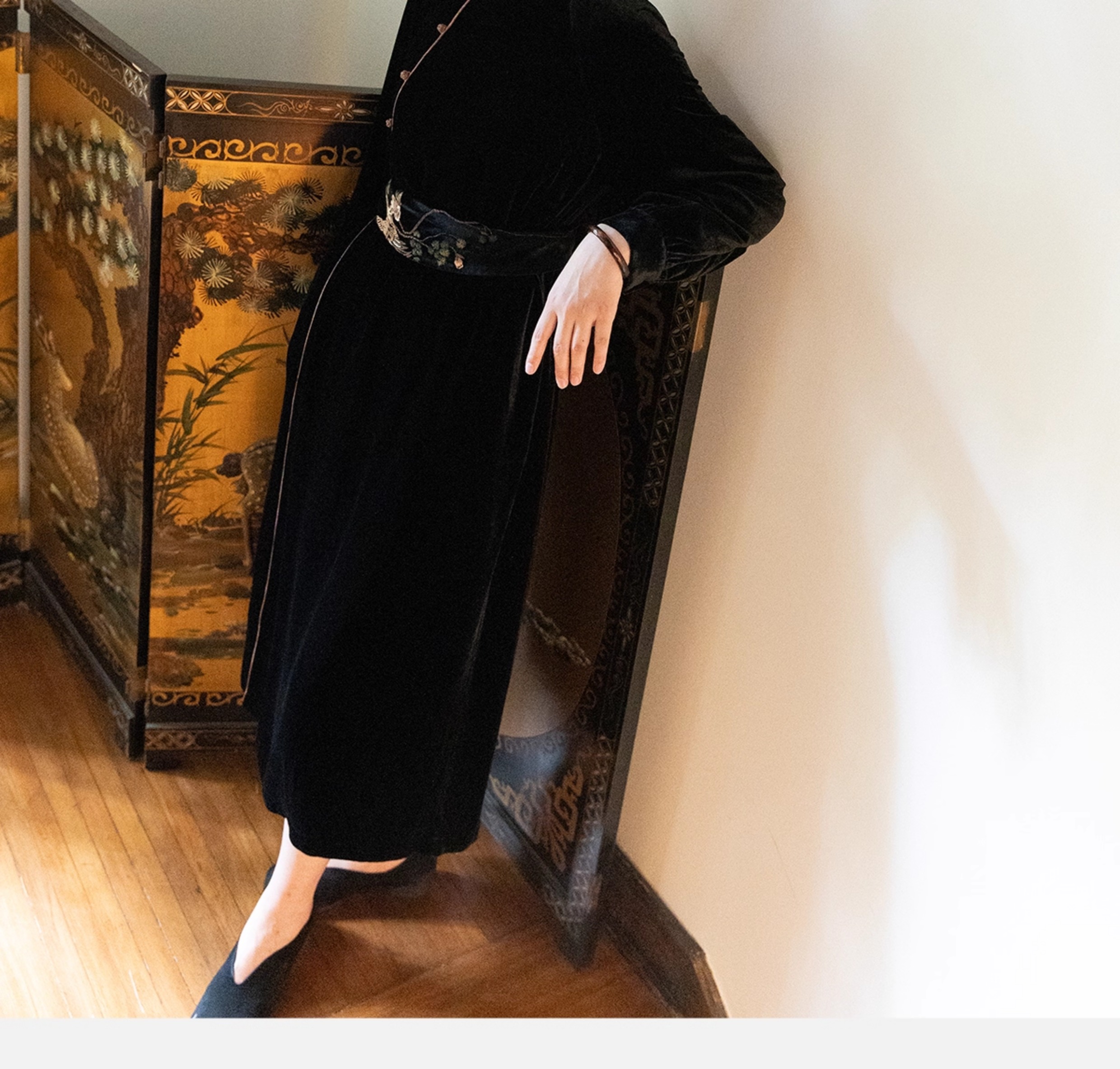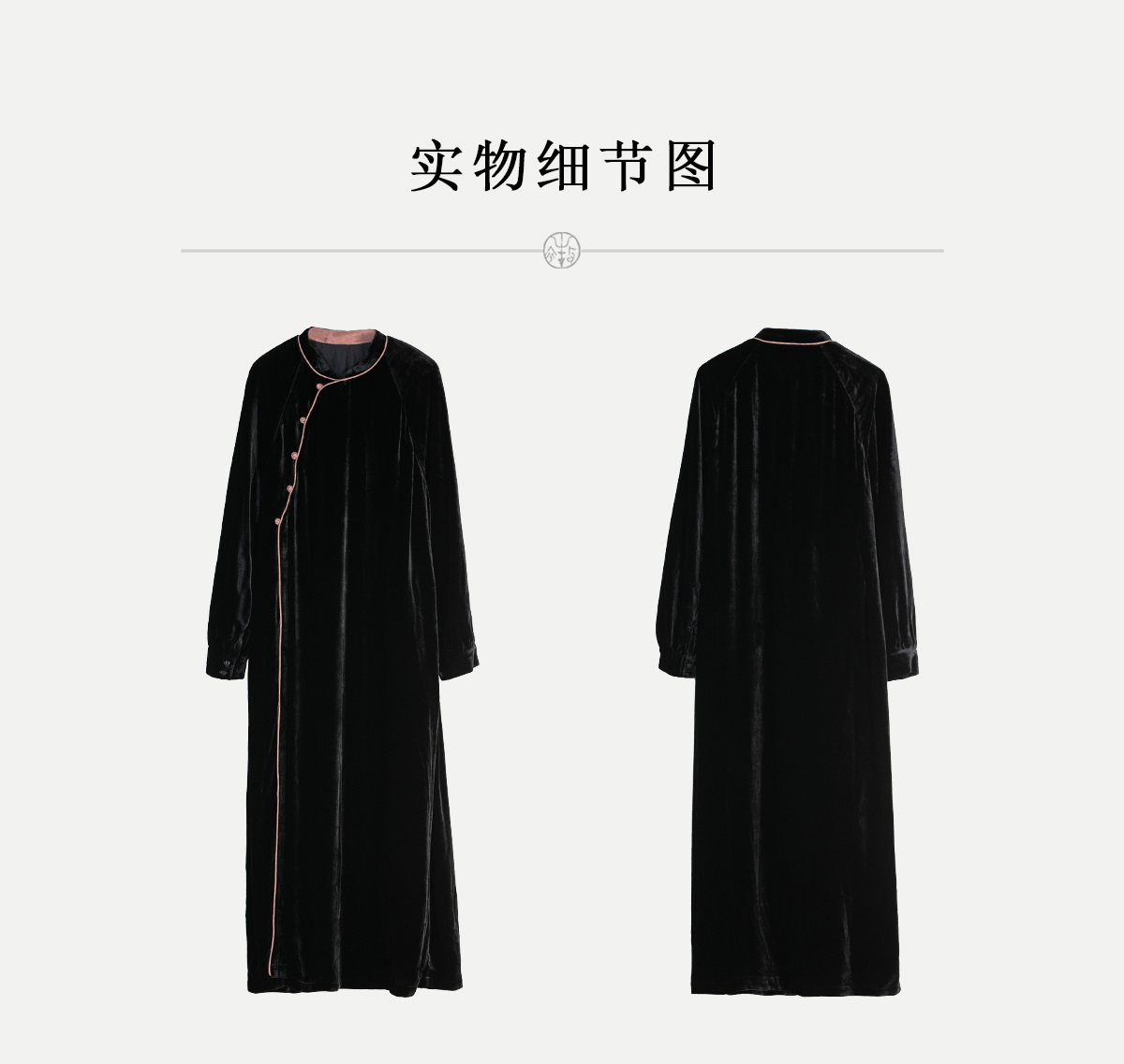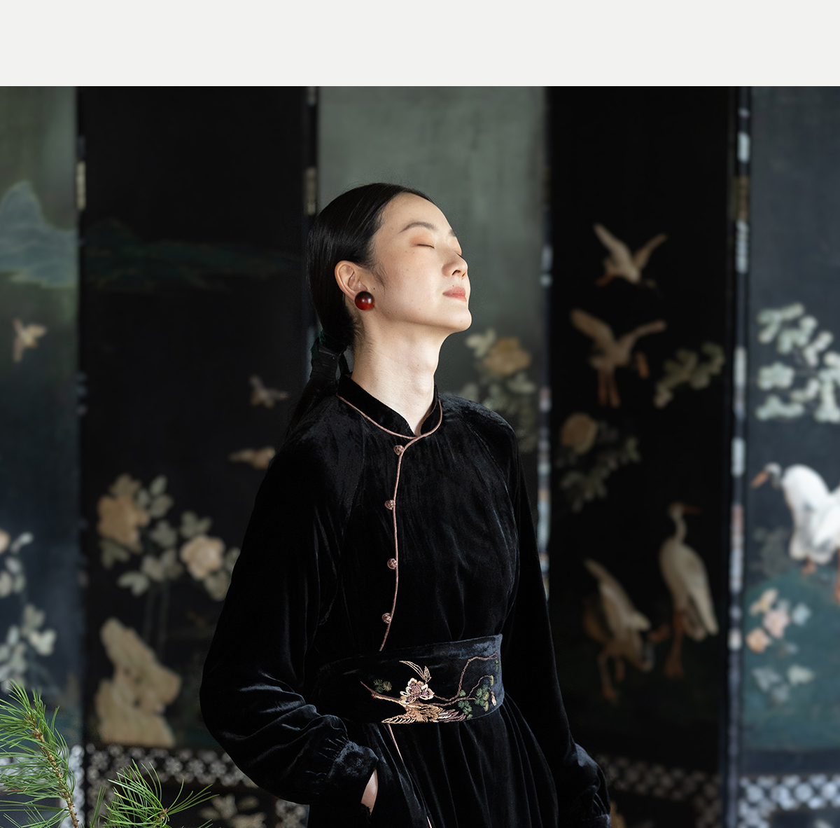 牧衣游原创 丝绒净色连衣裙秋季新款复古立领气质新中式长裙 庭雨