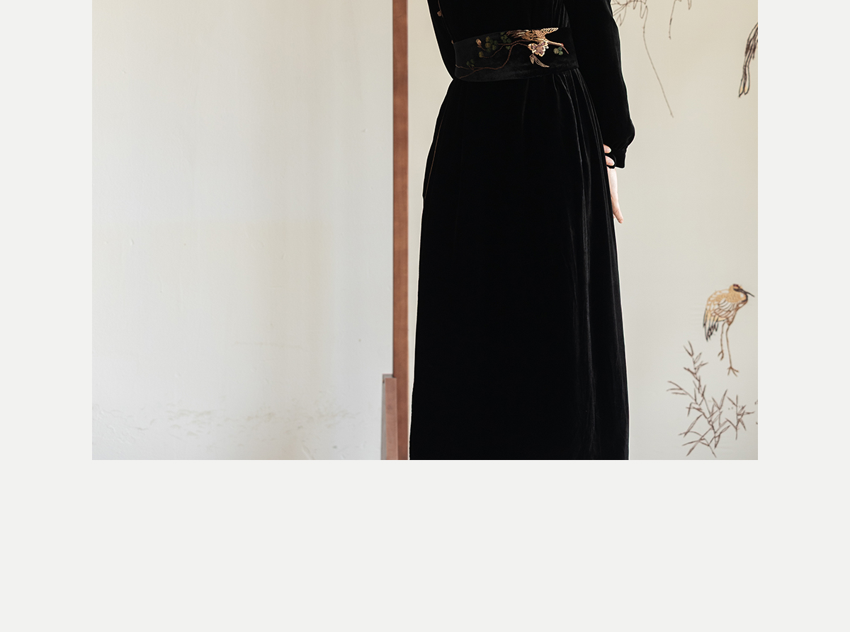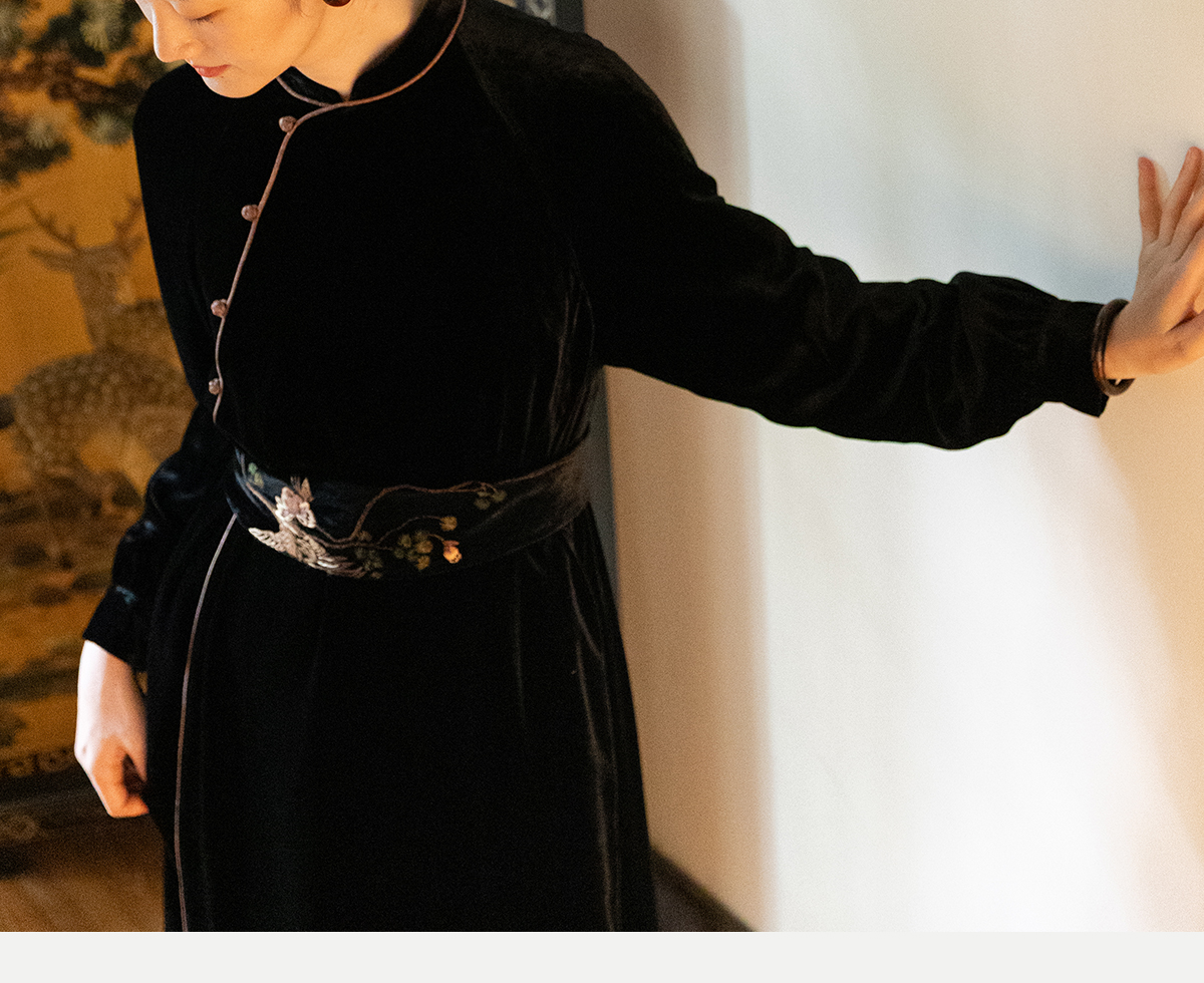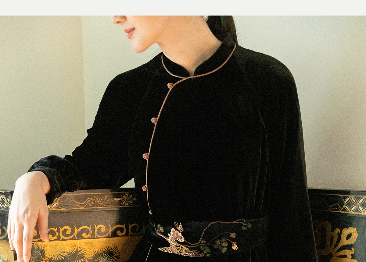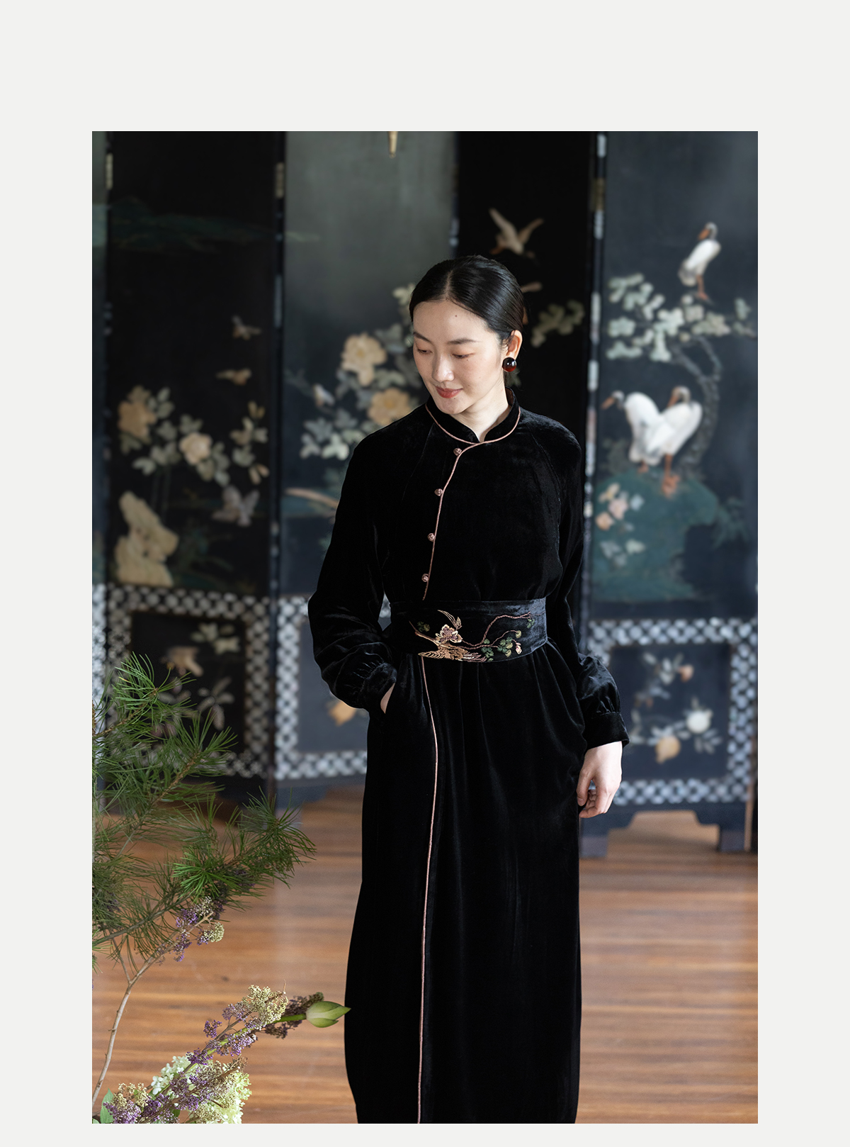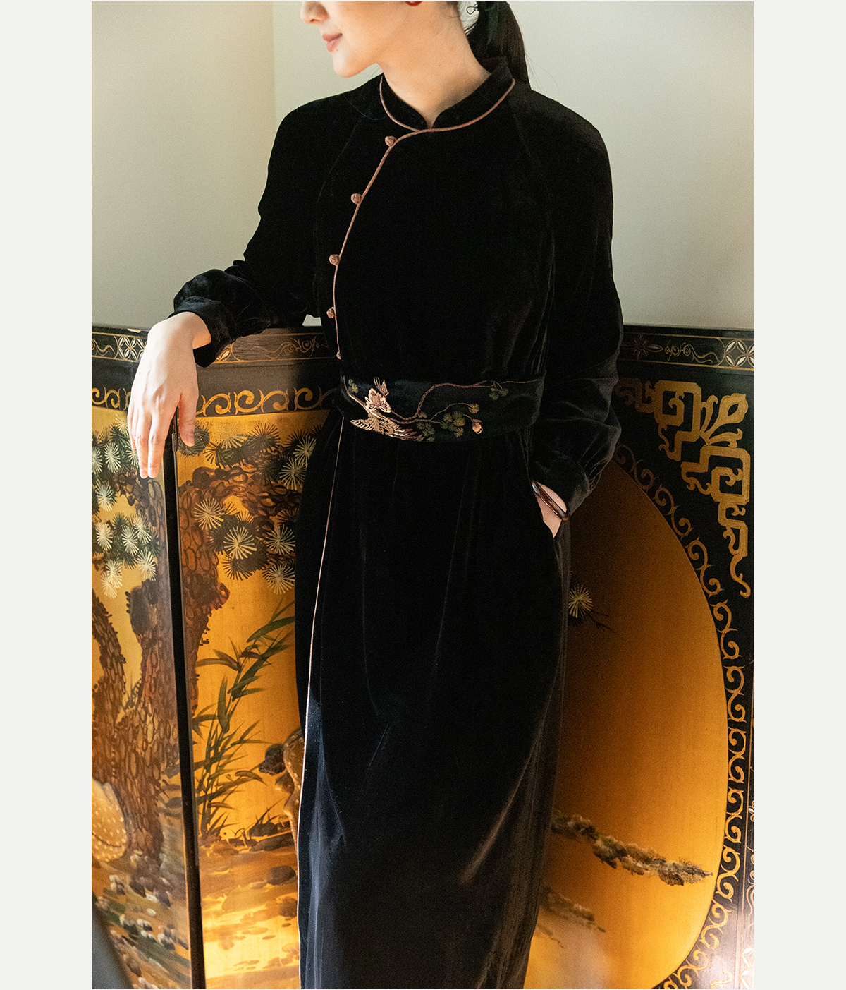 牧衣游原创 丝绒净色连衣裙秋季新款复古立领气质新中式长裙 庭雨