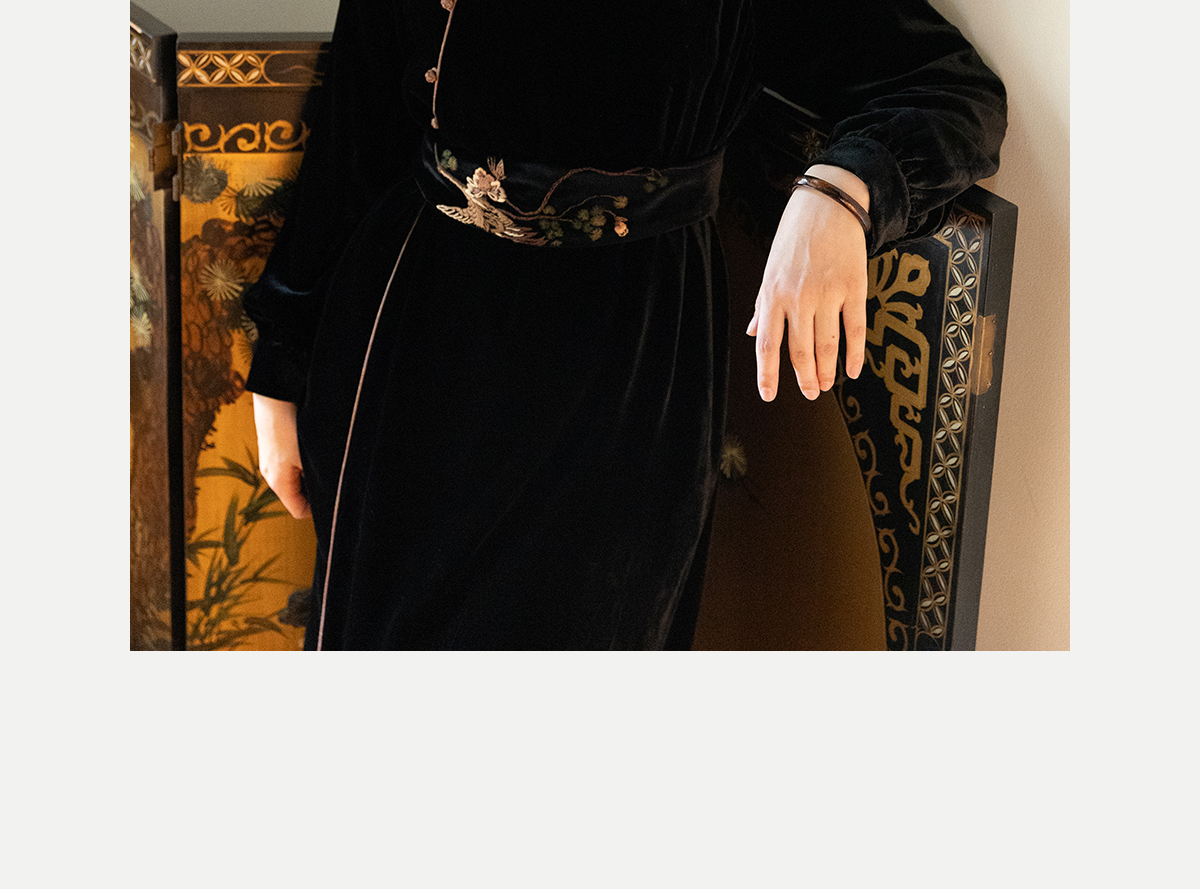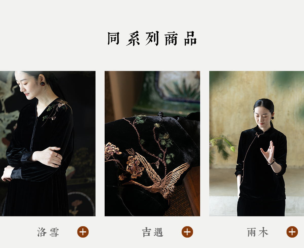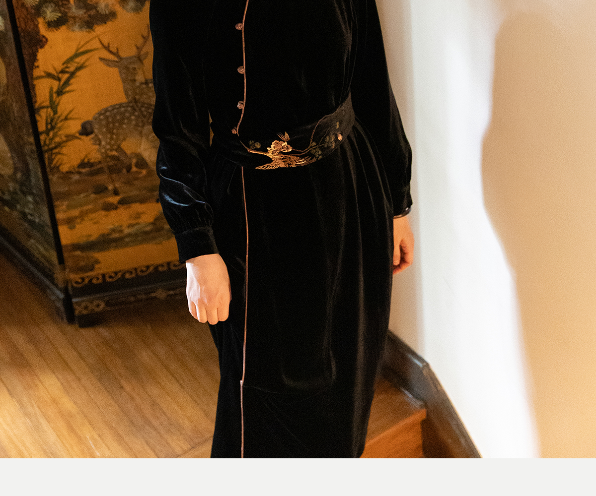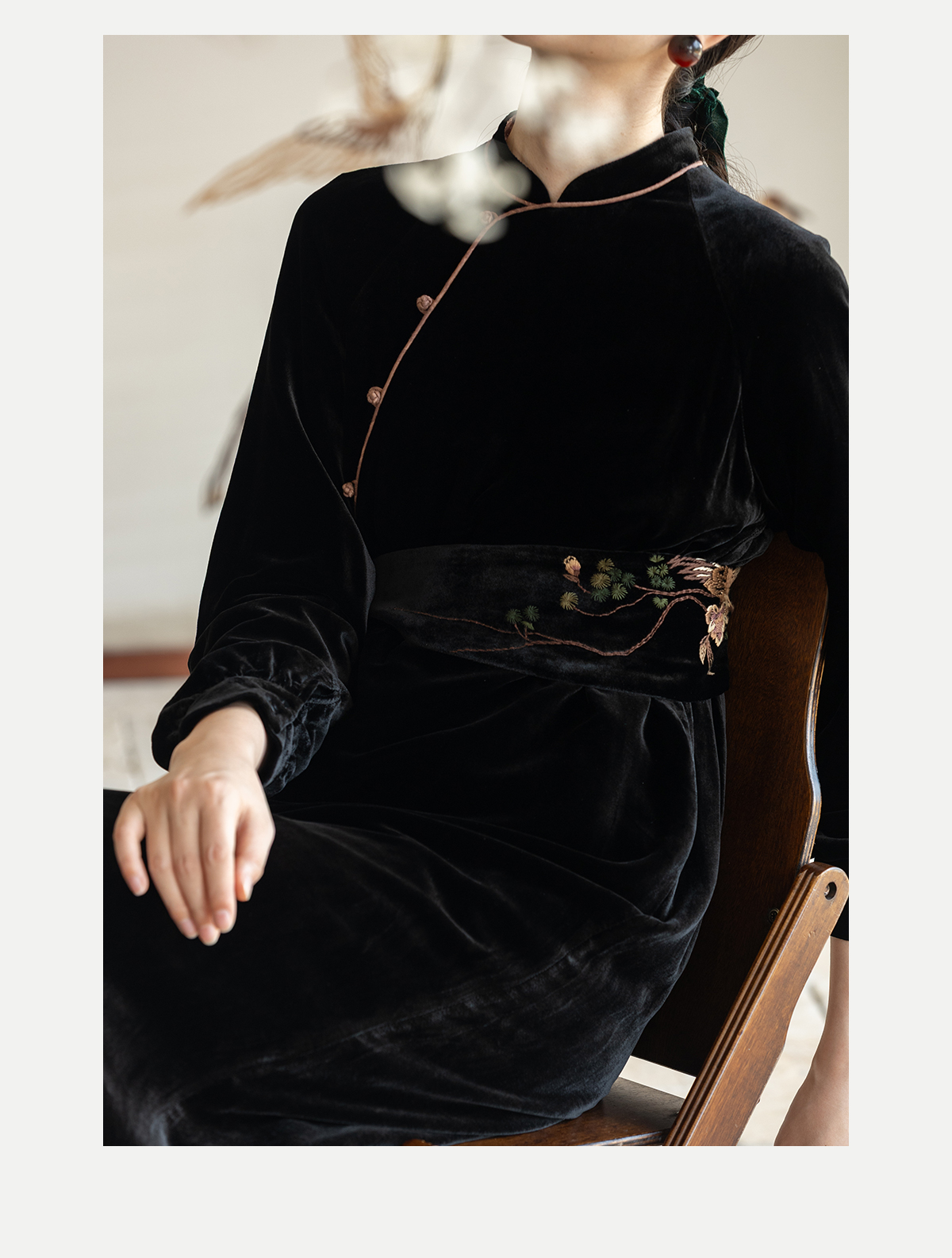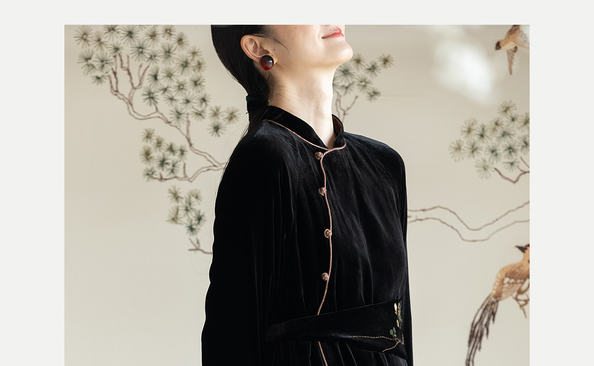 牧衣游原创 丝绒净色连衣裙秋季新款复古立领气质新中式长裙 庭雨