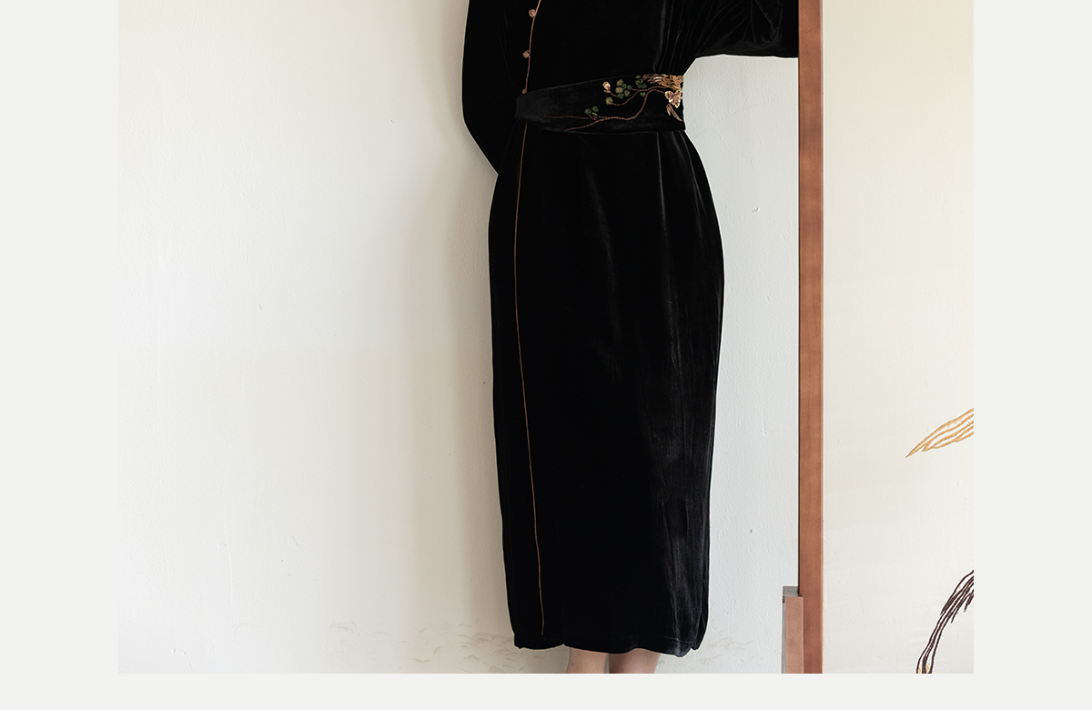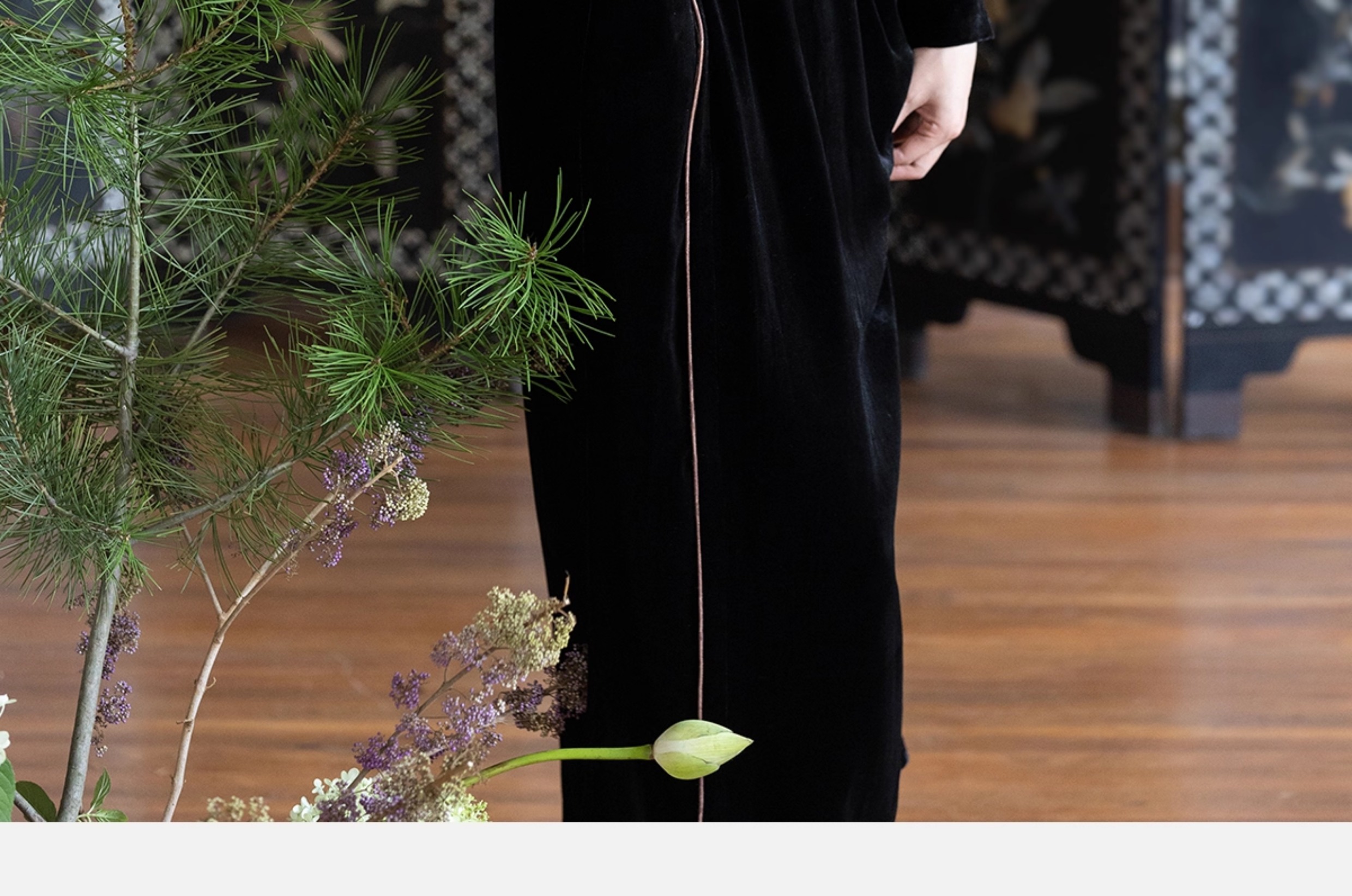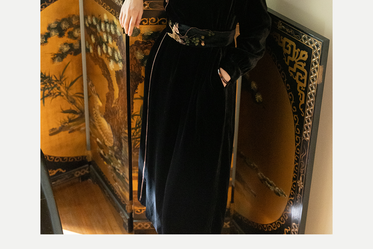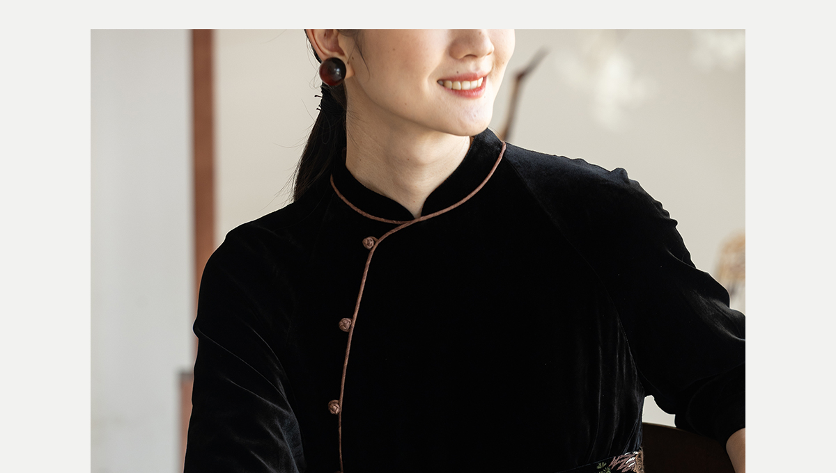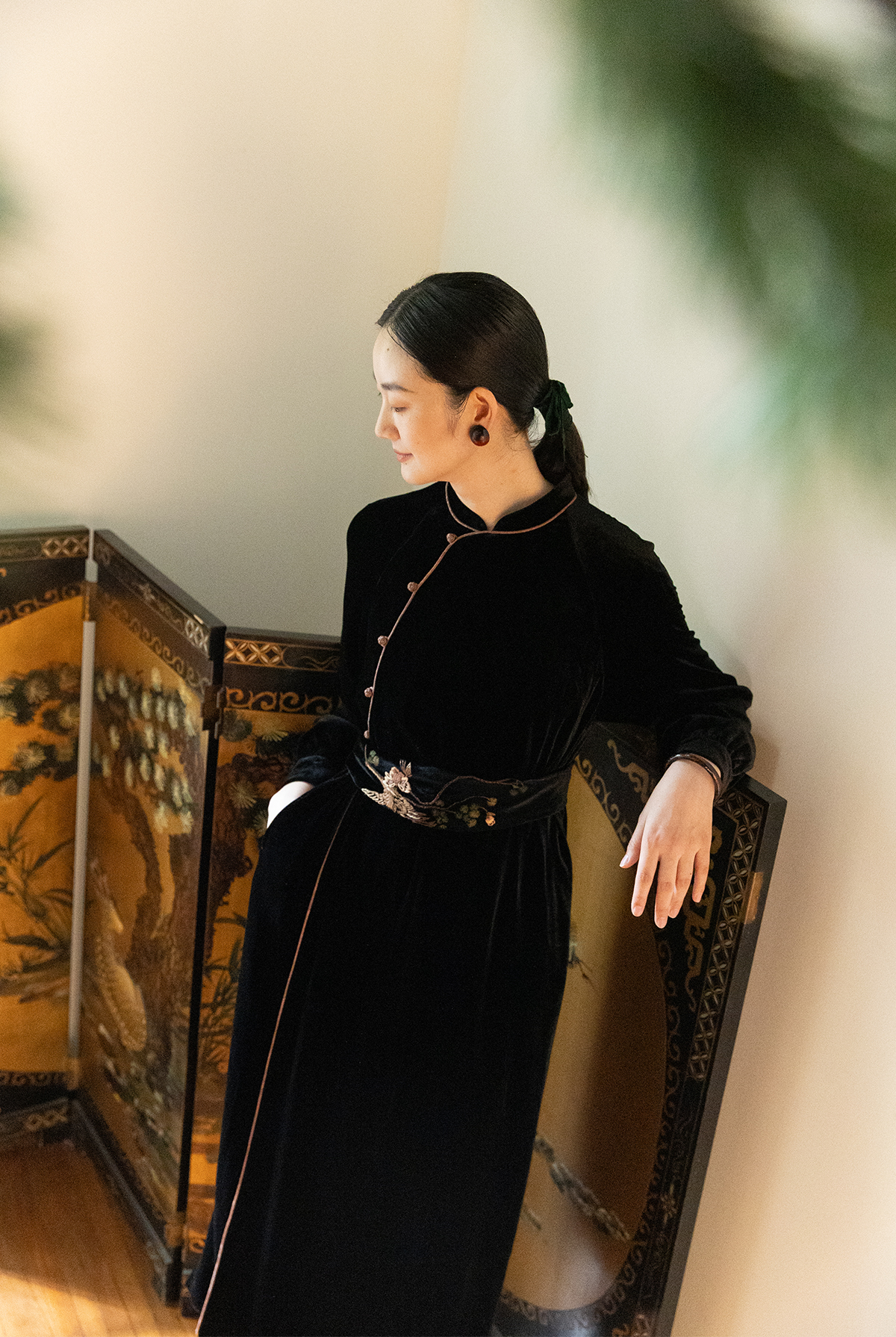 牧衣游原创 丝绒净色连衣裙秋季新款复古立领气质新中式长裙 庭雨