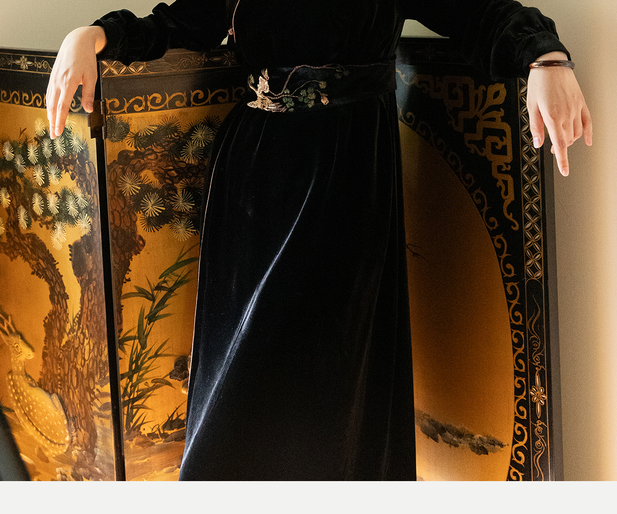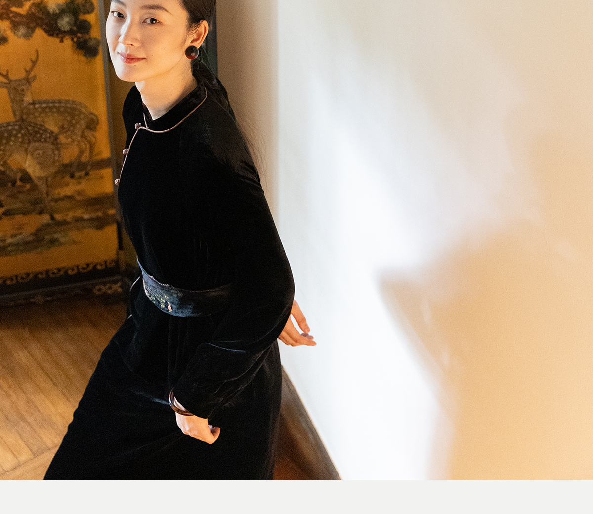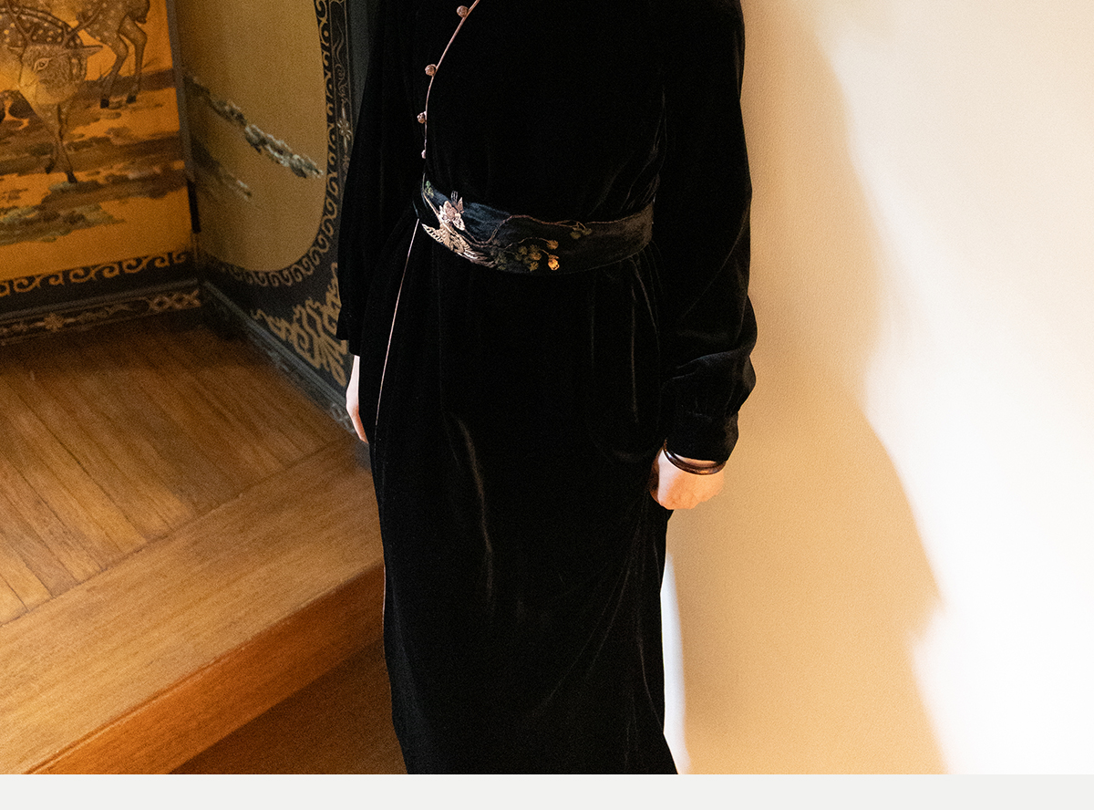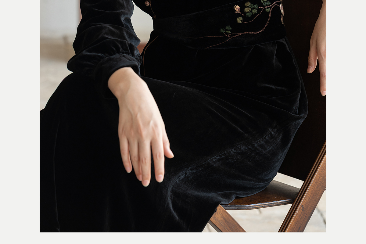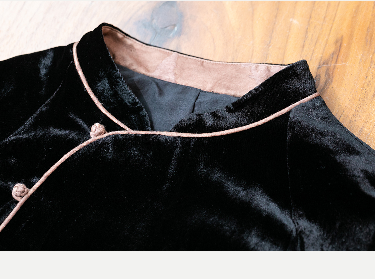 牧衣游原创 丝绒净色连衣裙秋季新款复古立领气质新中式长裙 庭雨