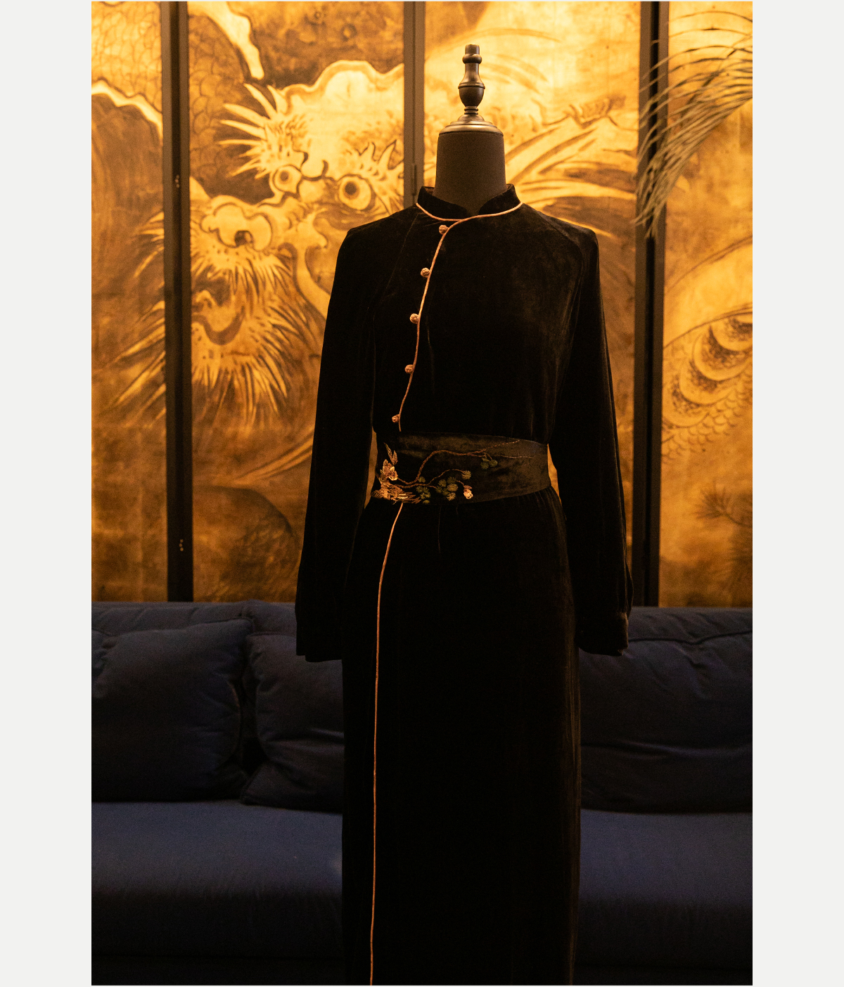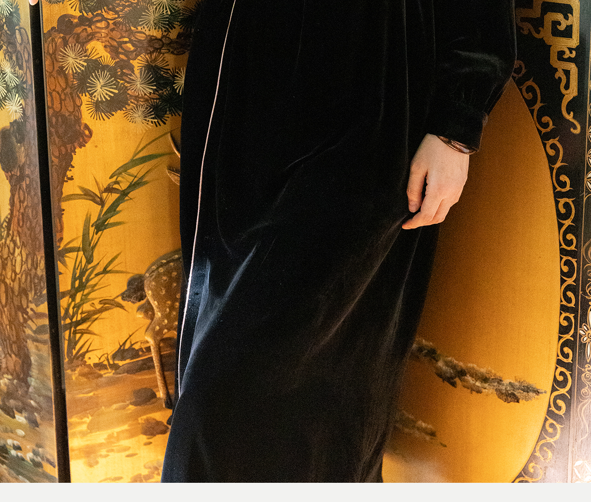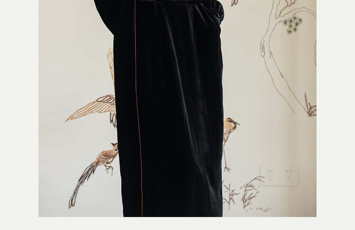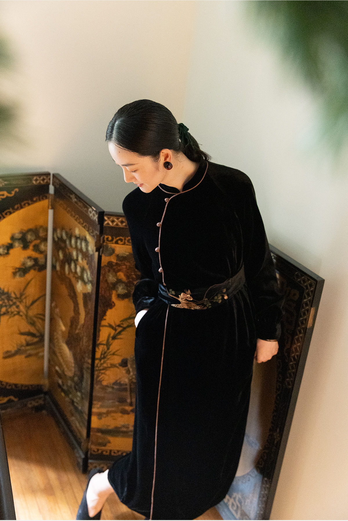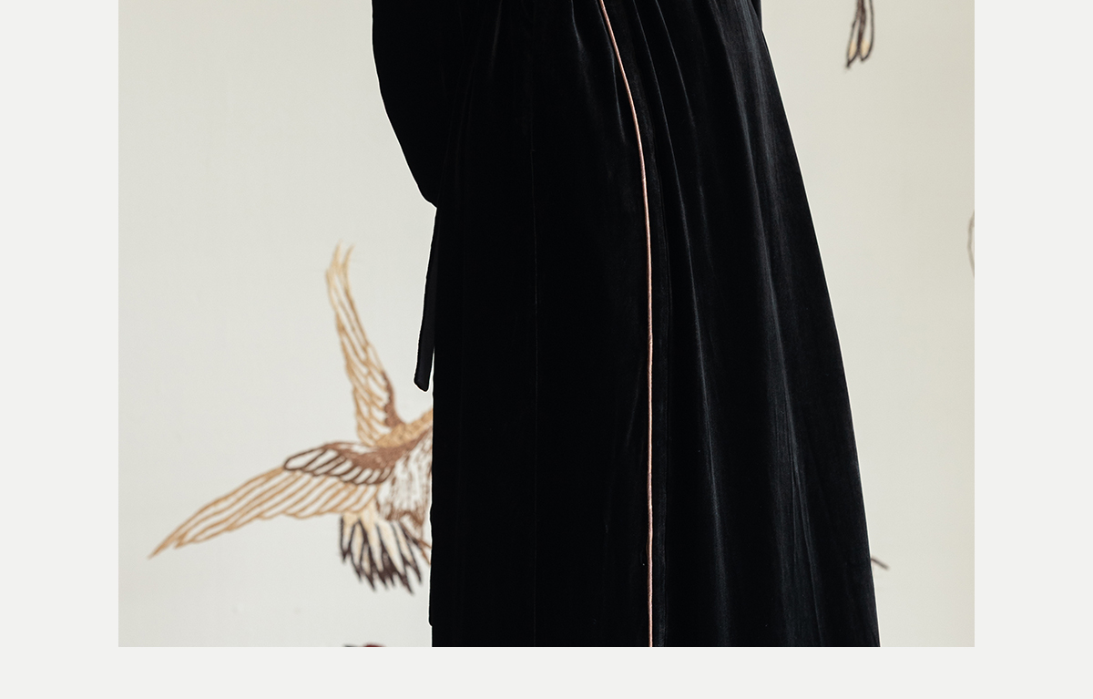 牧衣游原创 丝绒净色连衣裙秋季新款复古立领气质新中式长裙 庭雨