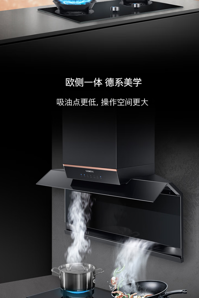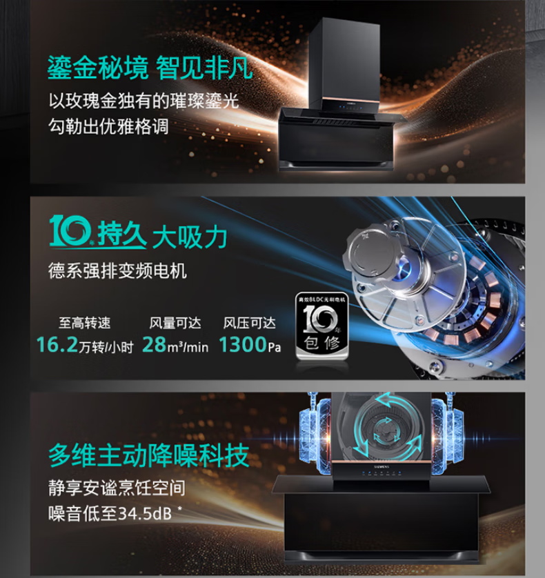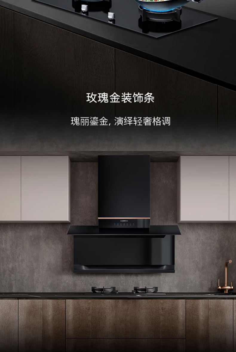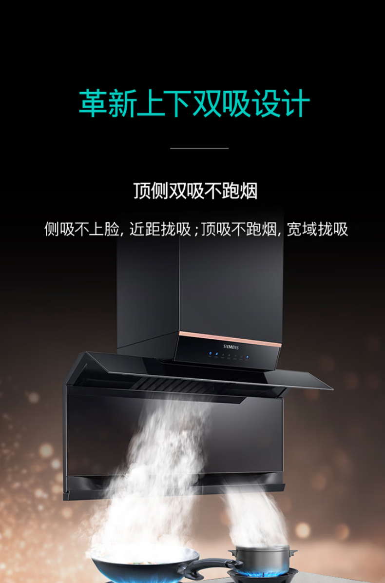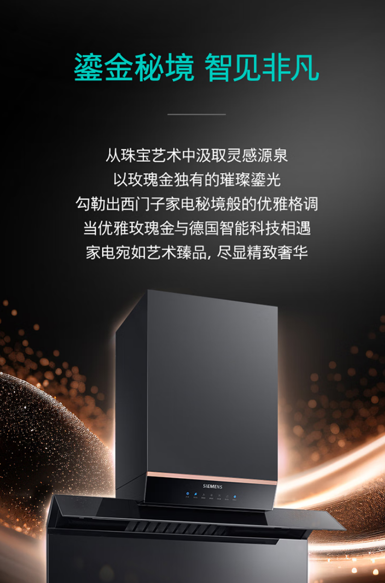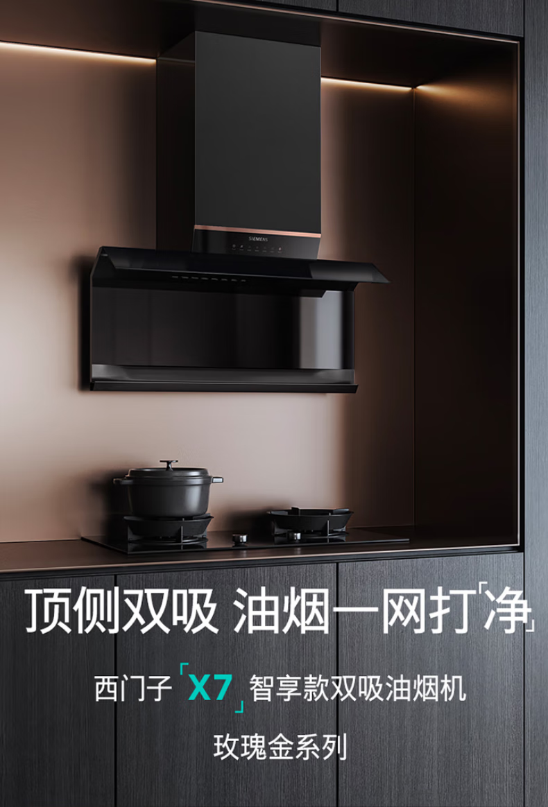 西门子(SIEMENS)【新品上市】玫瑰金顶侧双吸油烟机 28立方大吸力 智能风速调节 智能自清洁 德系变频电机 LS63V8MR9W