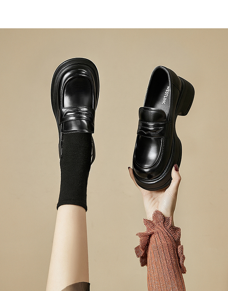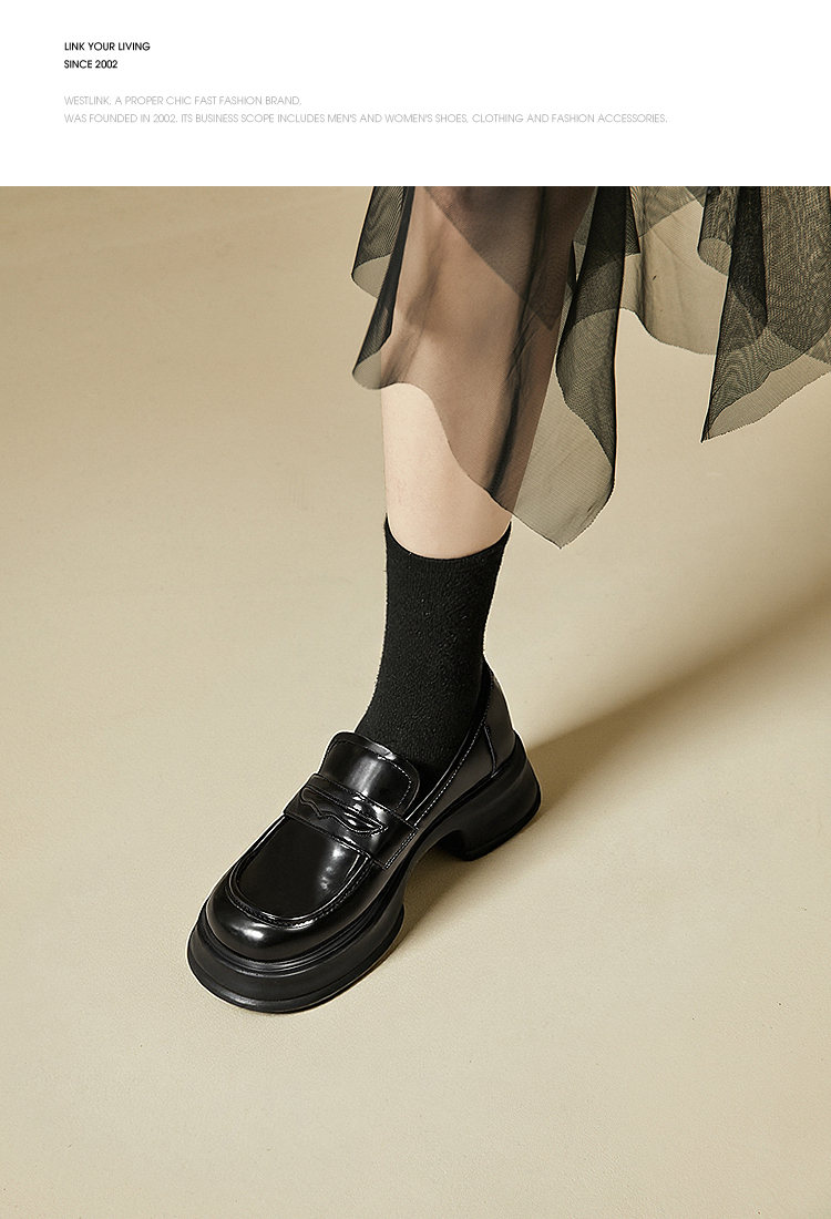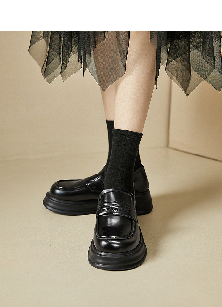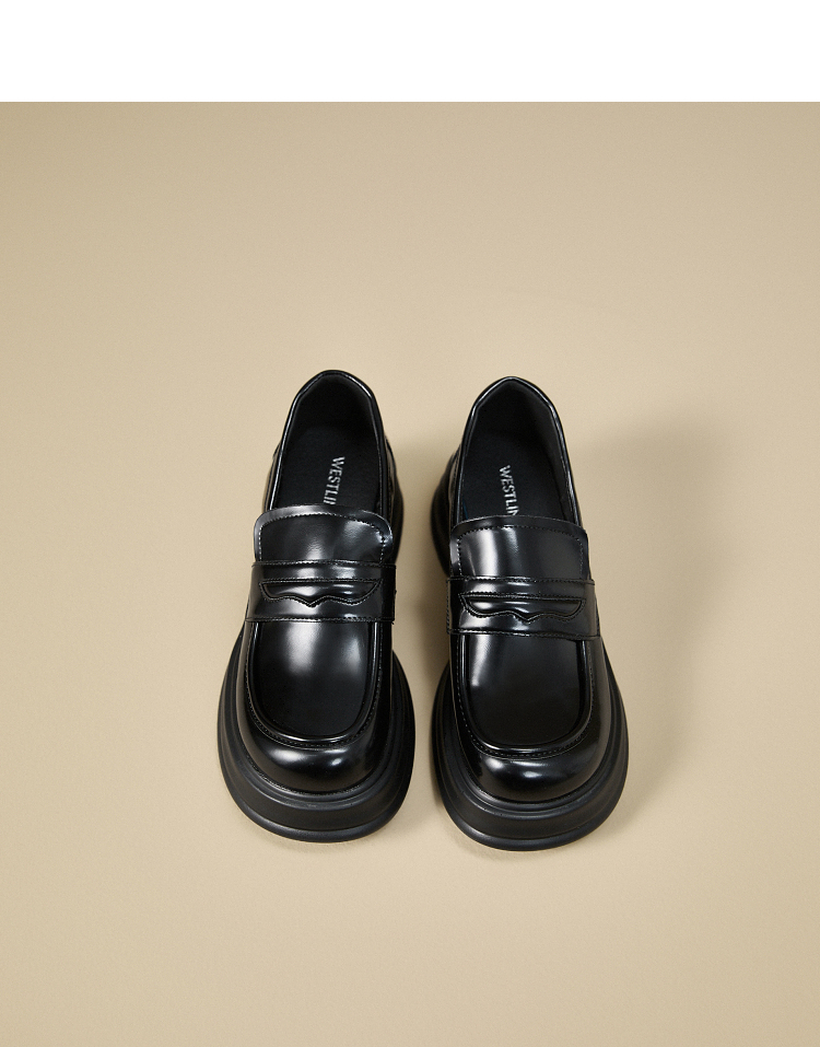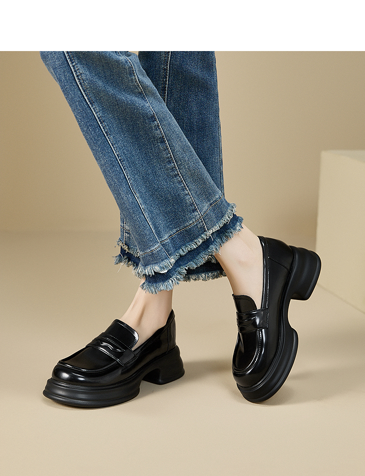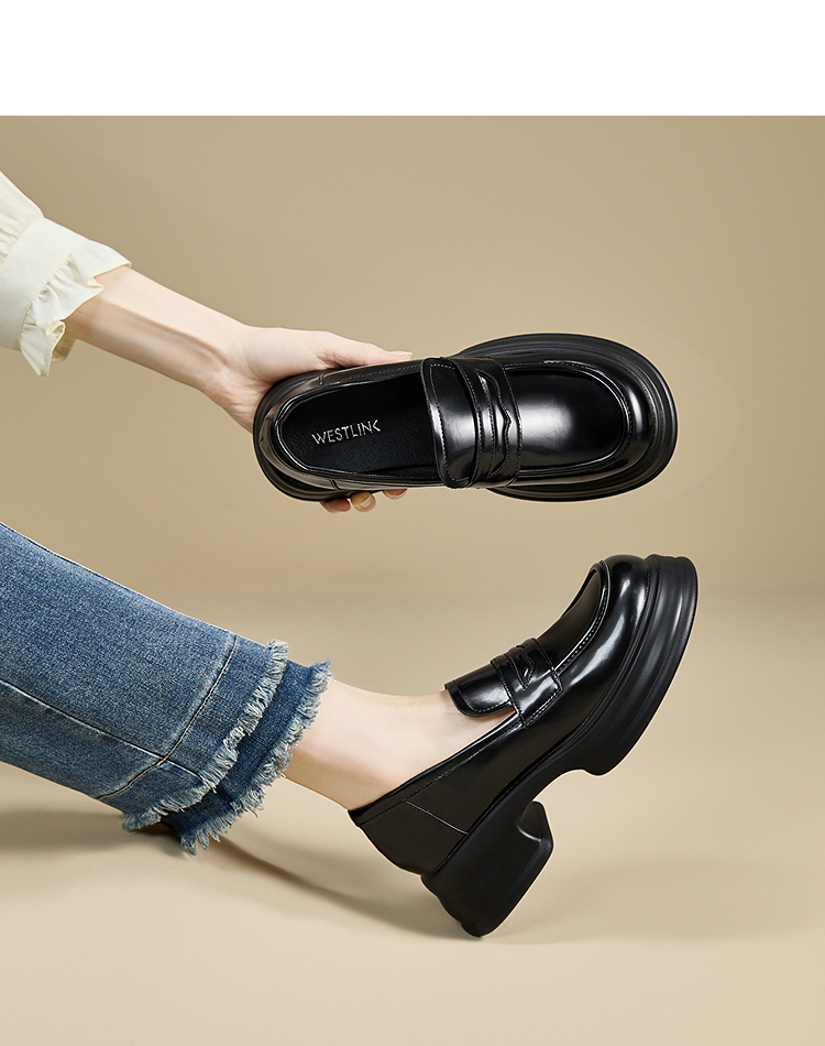 西遇增高厚底乐福鞋女新款秋季法式简约一脚蹬单鞋黑色小皮鞋D0333052