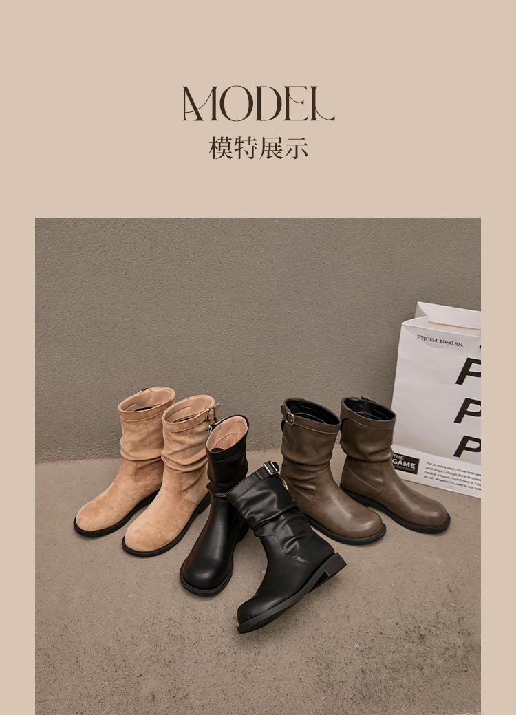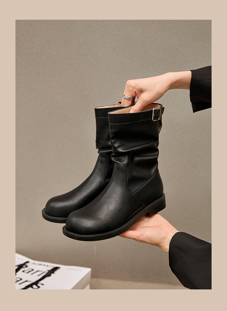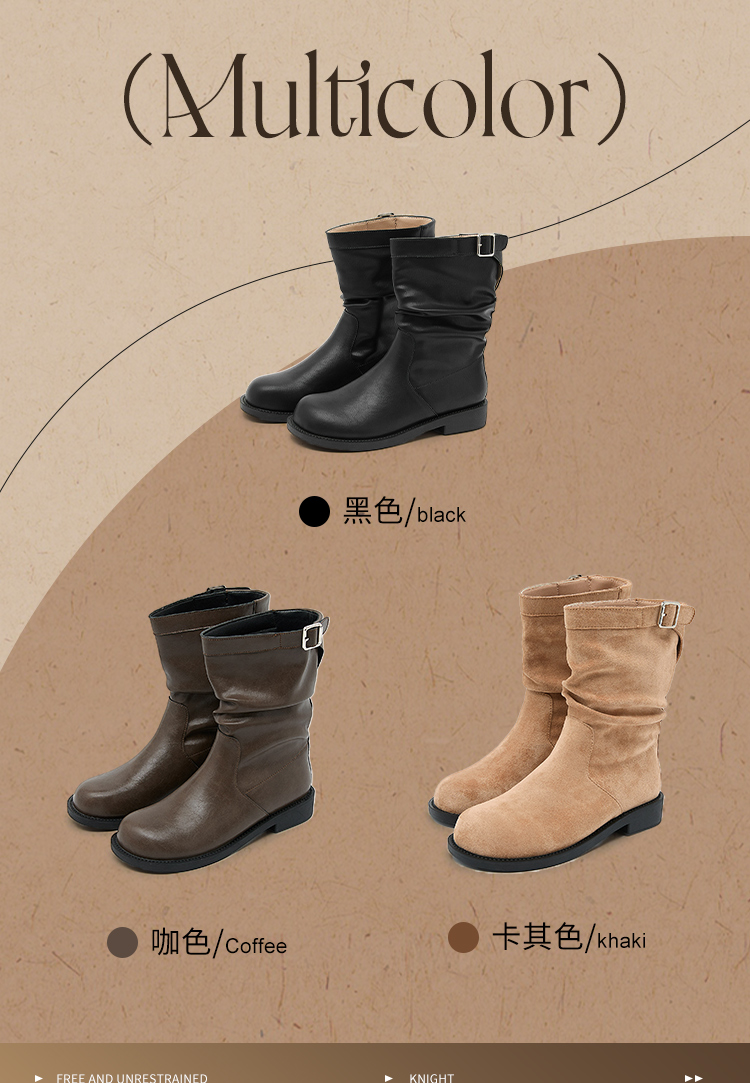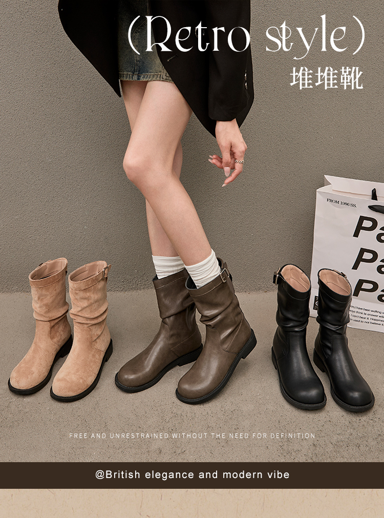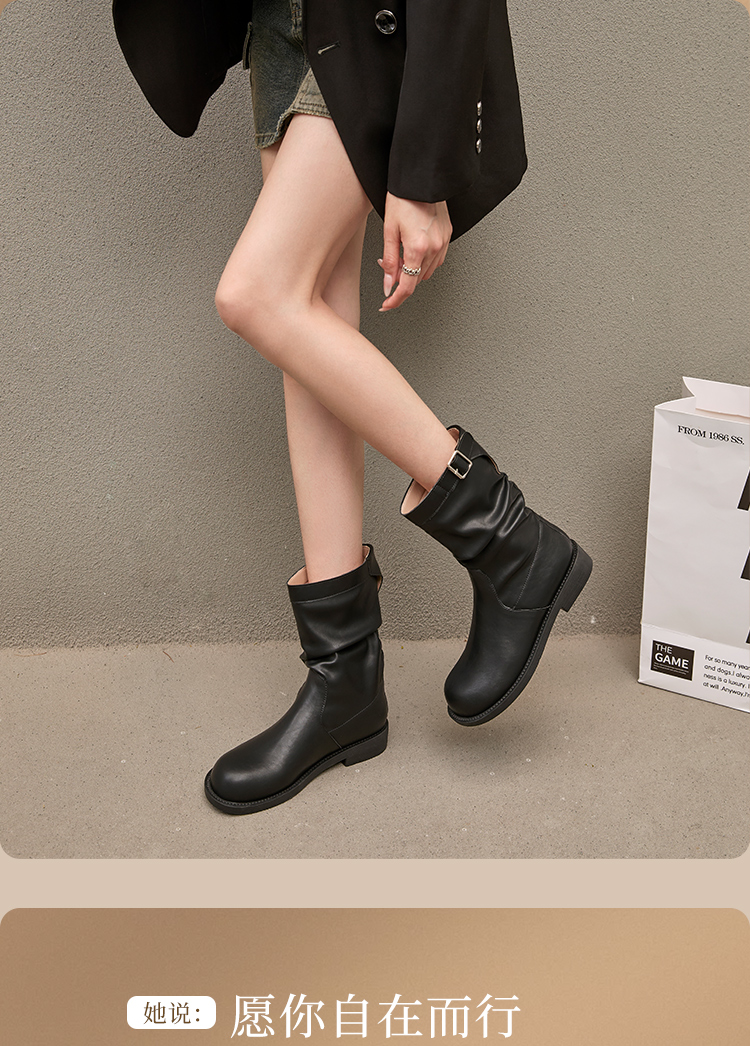 西遇复古中筒骑士靴女新款秋季英伦风圆头褶皱堆堆靴黑色短靴D0047434