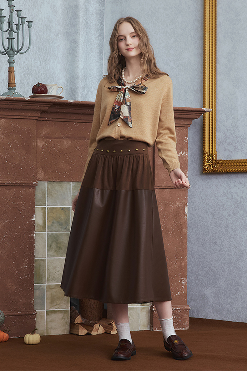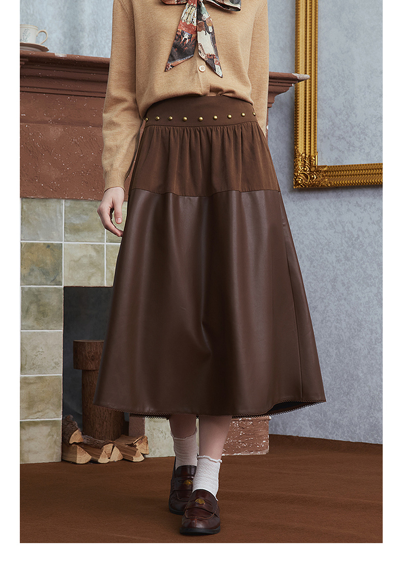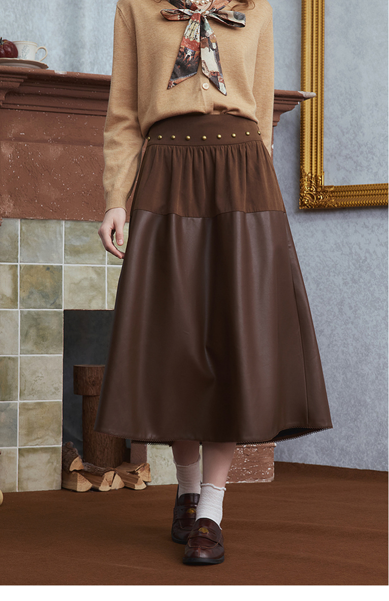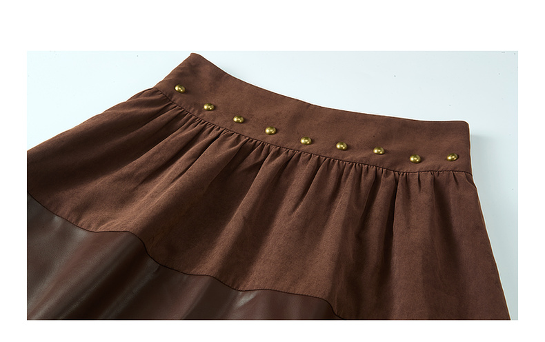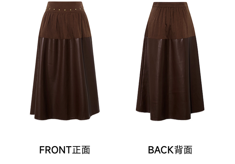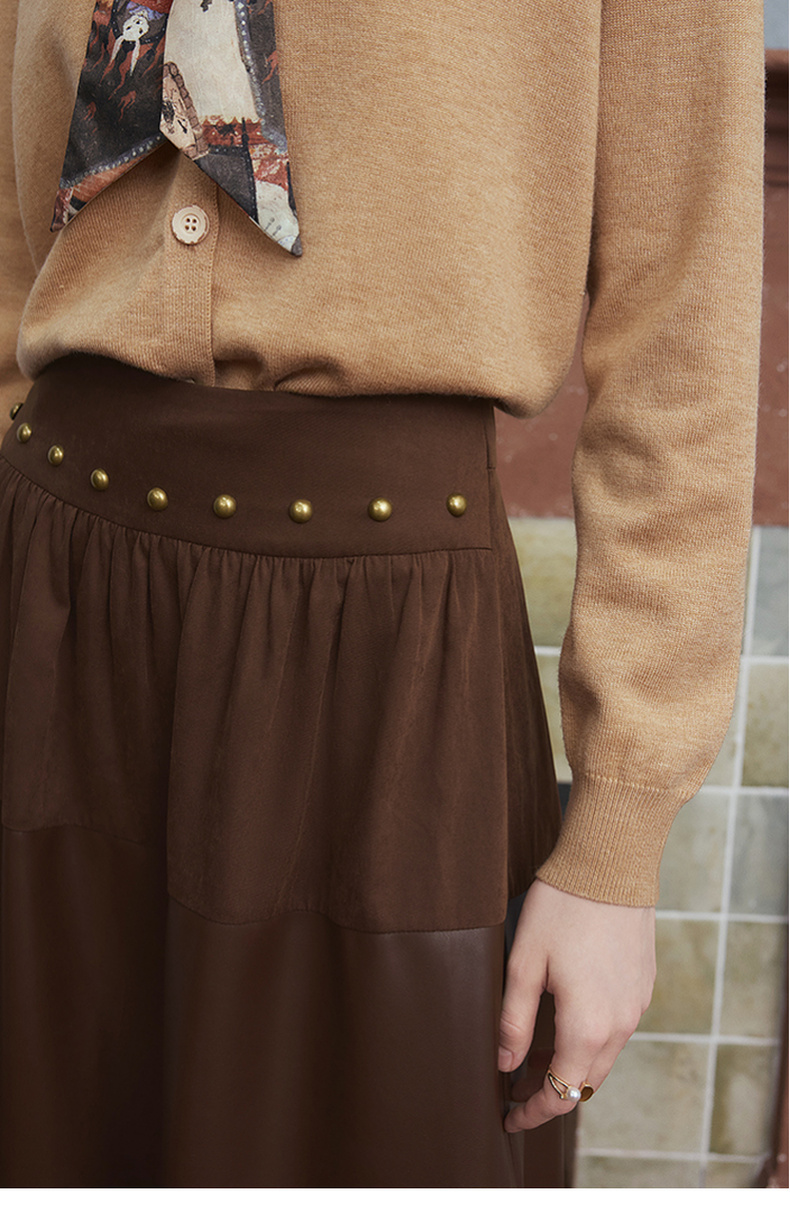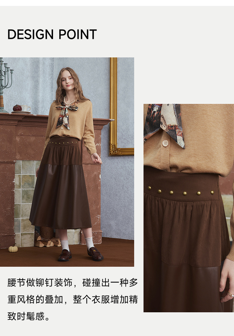 两三事 风起雅丹 2025秋季新品时尚铆钉绒面拼皮a字半身裙