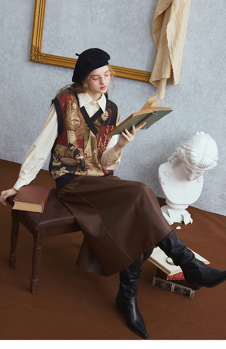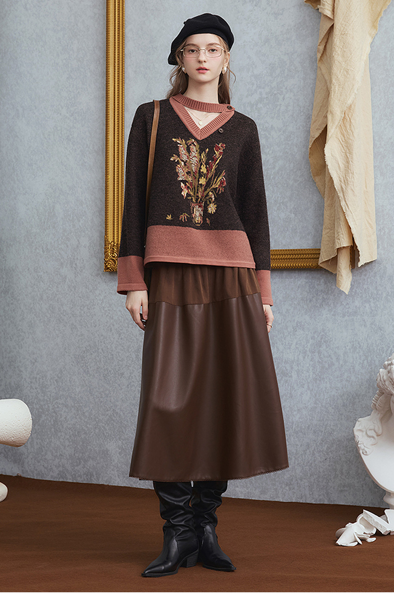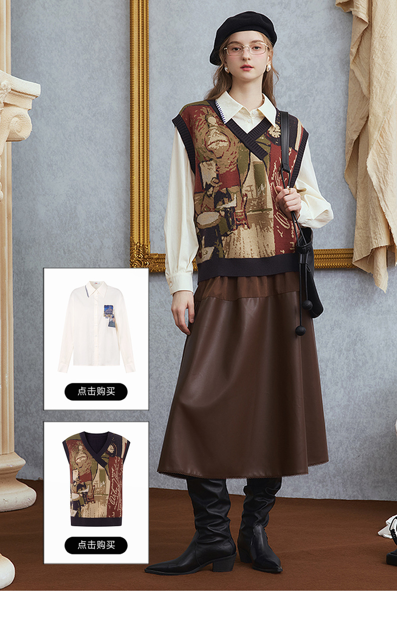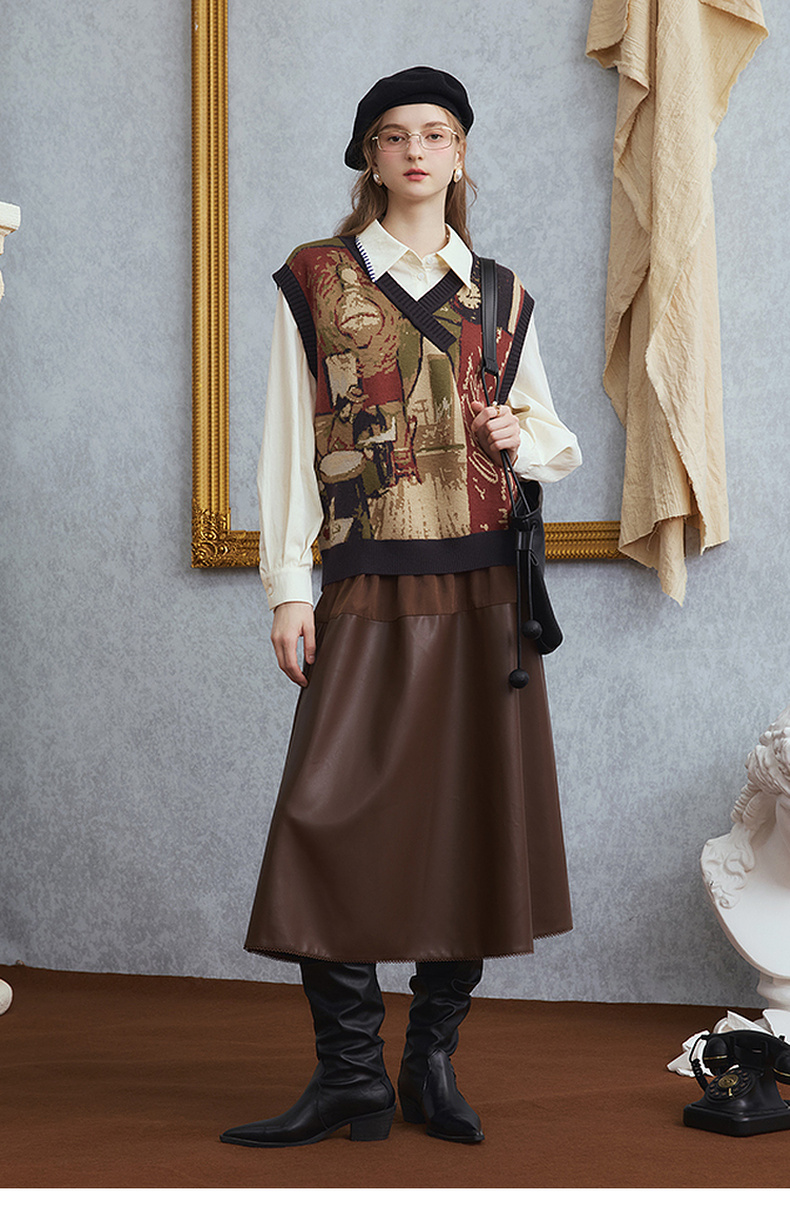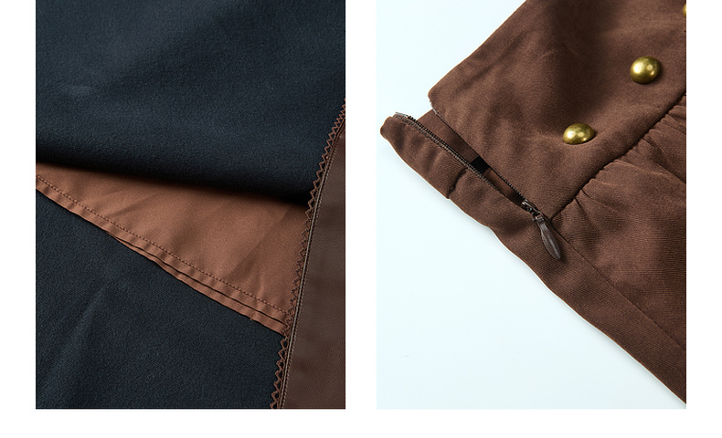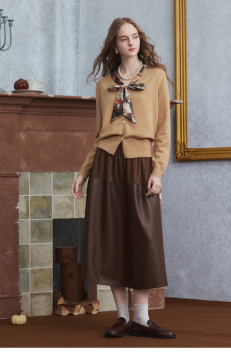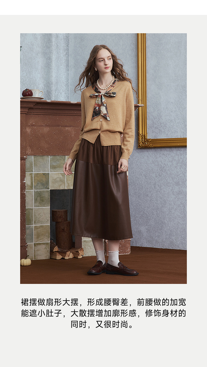 两三事 风起雅丹 2025秋季新品时尚铆钉绒面拼皮a字半身裙