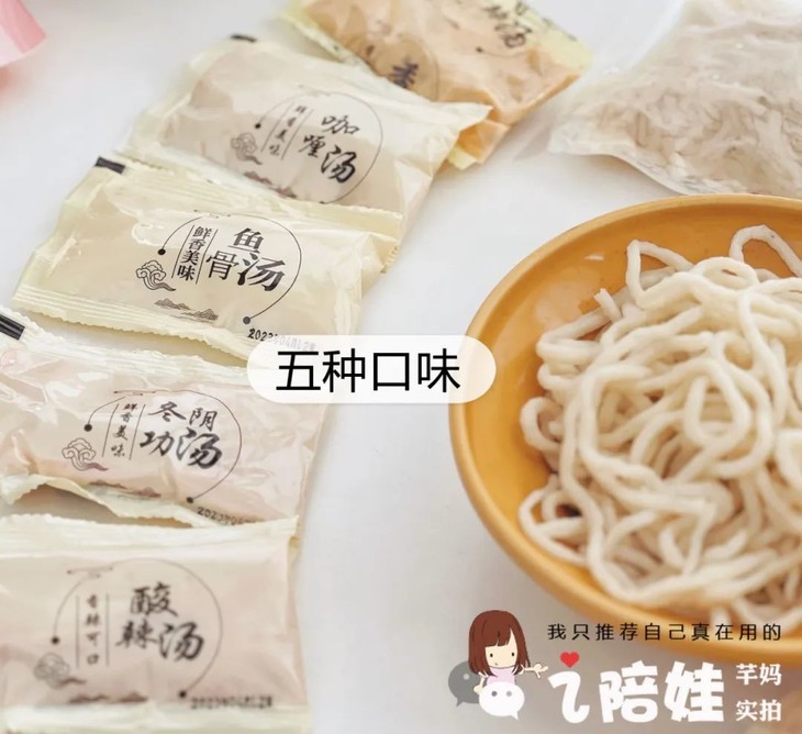 带汤料,一共5个口味。1个鱼骨汤的,还有4个辣味开胃的,不吃辣可以不放料。