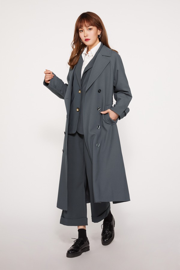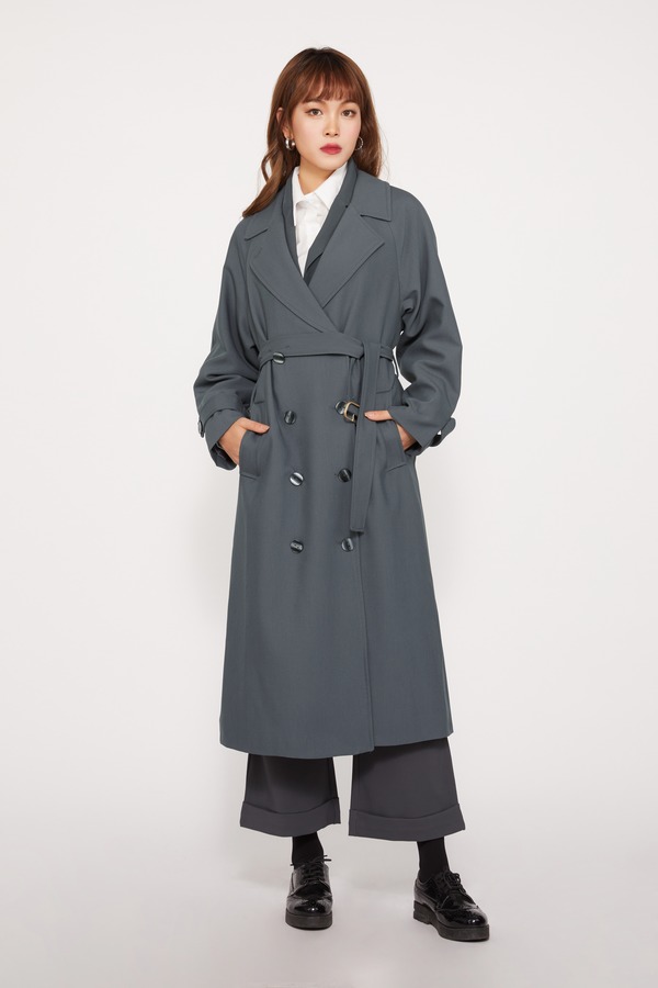 ESTELLICA 雾霾蓝束腰过膝风衣外套 10393
