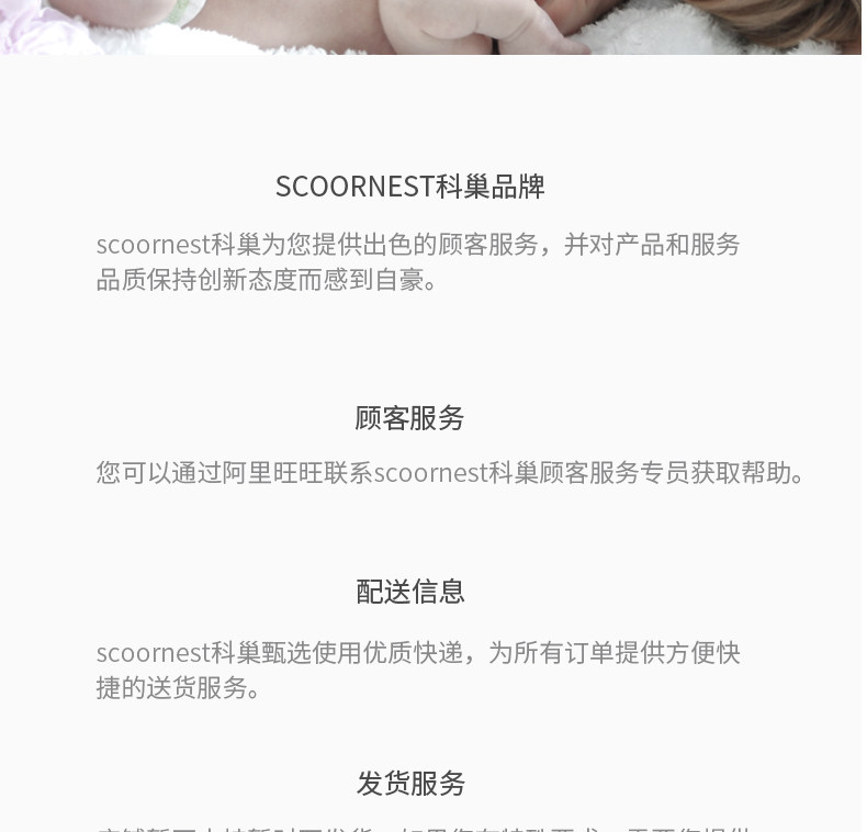 - Scoornest始终秉承给每一位宝宝送去科学的、关心的、创新的成长体验,通过提供商品和服务,使顾客形成守护、发展、巩固这种弥足珍贵的亲情的爱。