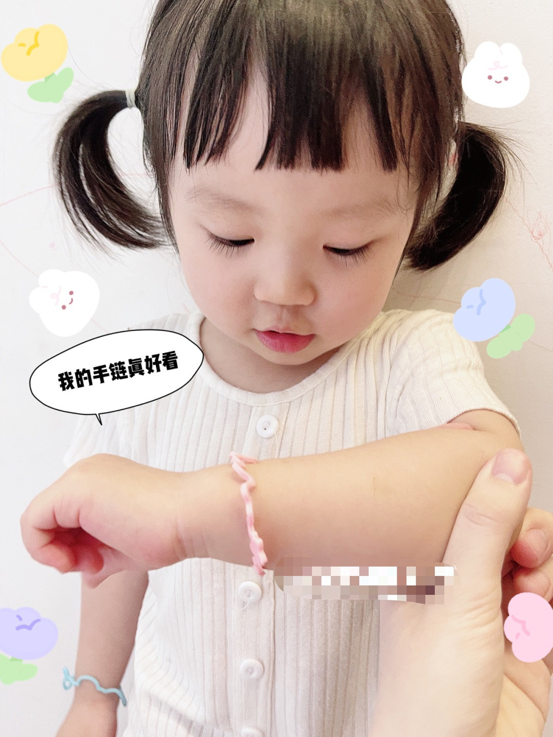 🏻 戴手腕/脚腕:手环其实直径比较小,因为是儿童款的,对于大朋友们(比如我)只能戴手腕上,小朋友戴脚腕上完全没问题,必要不勒肉就可以。