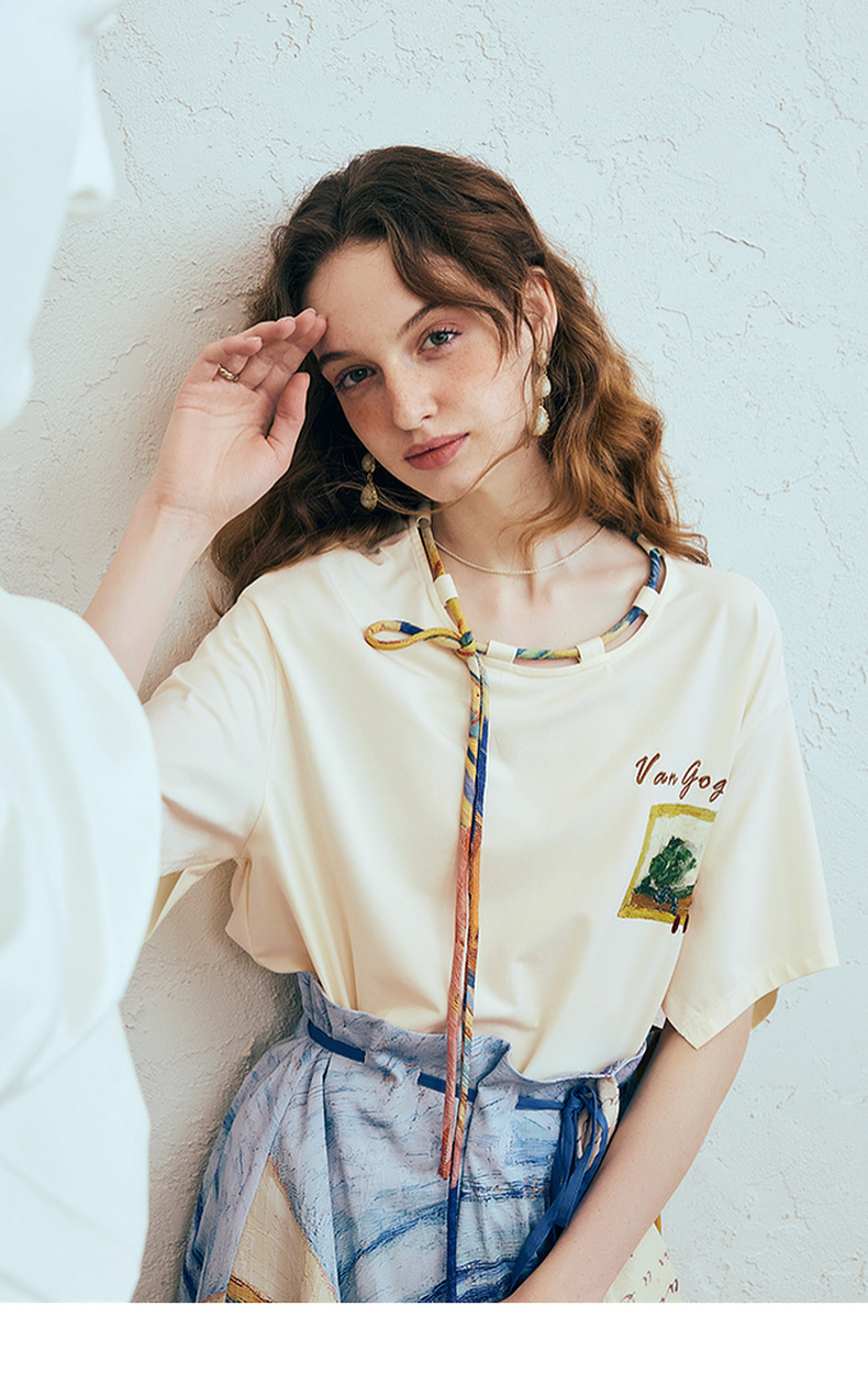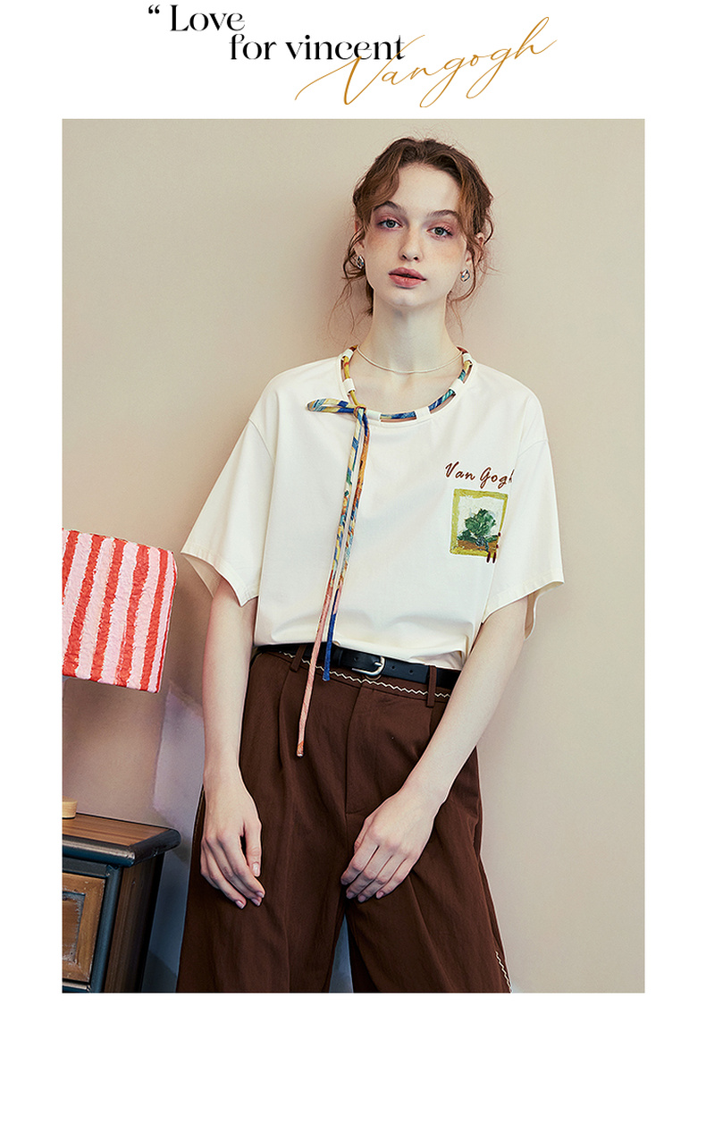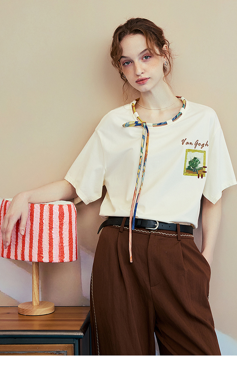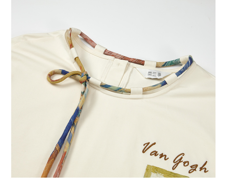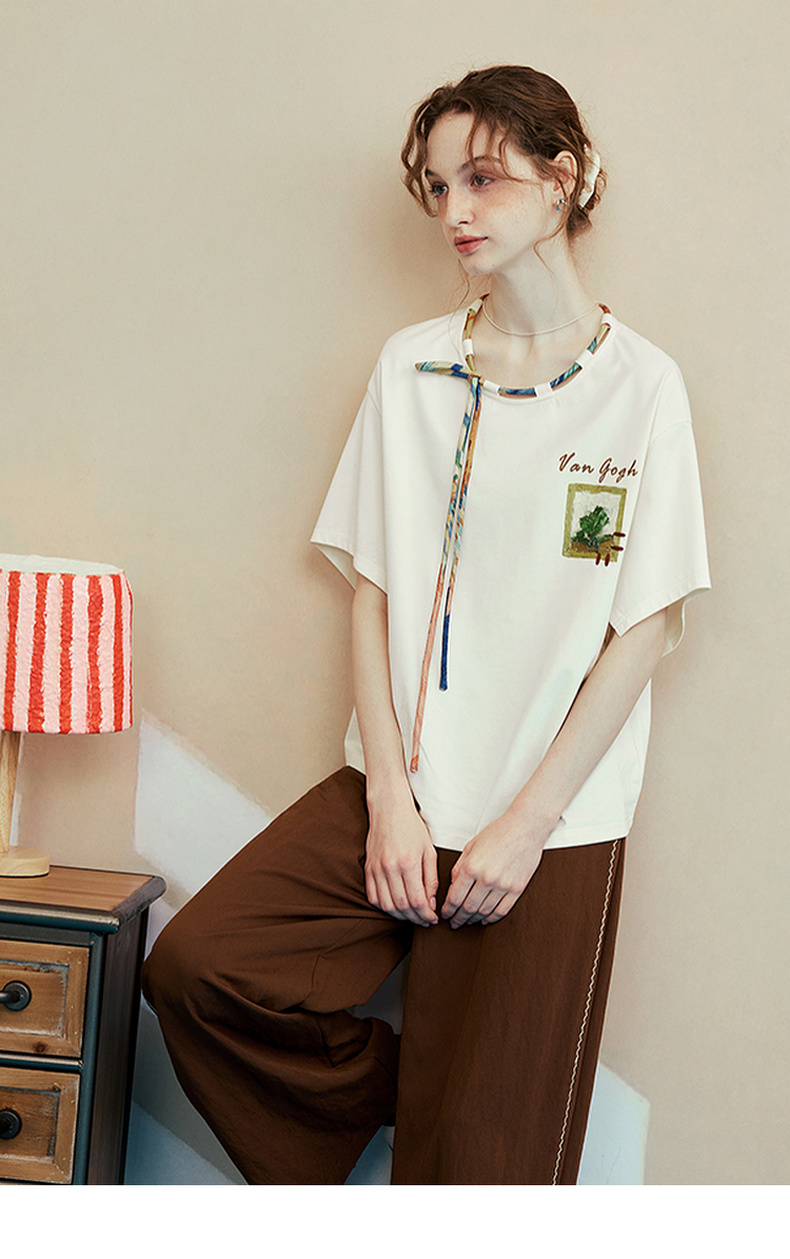 两三事梵高文艺 弦外智音 2025夏季新款彩绳绑带领印花短袖t恤女