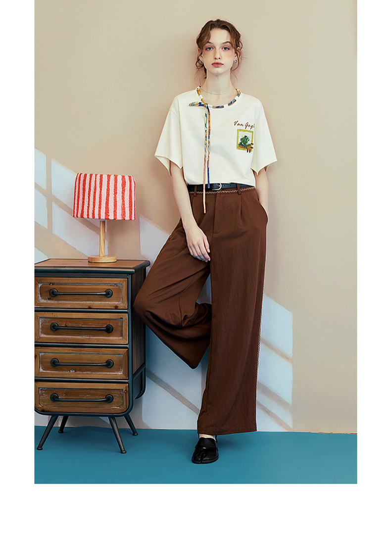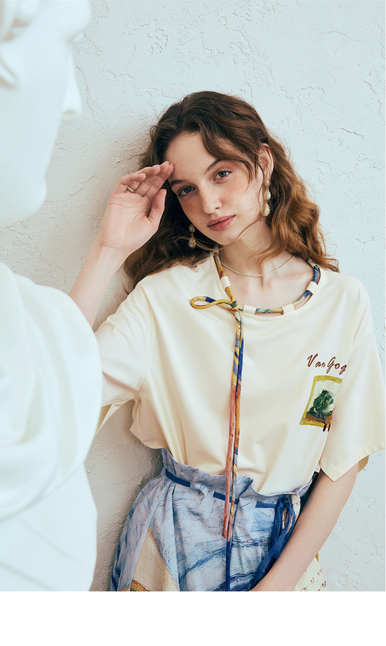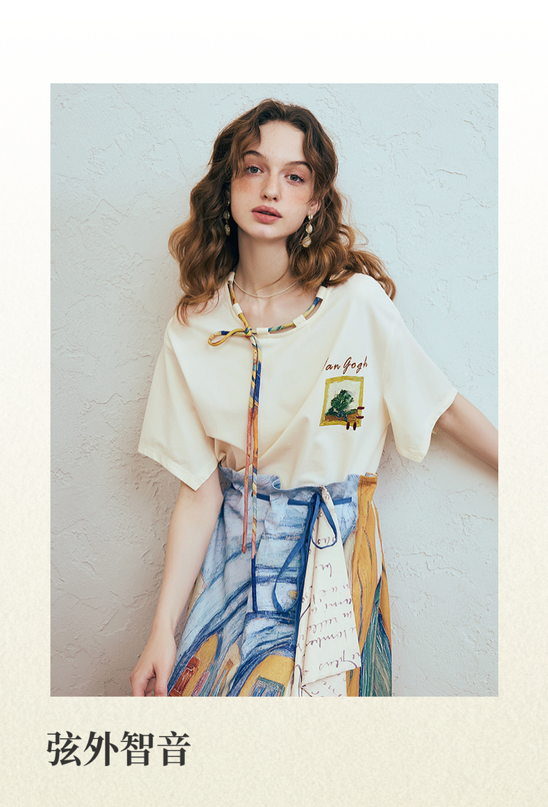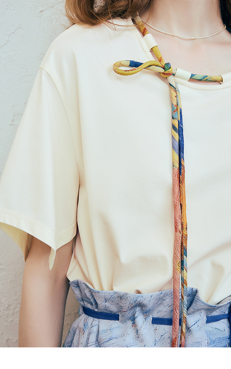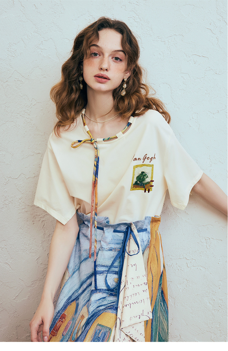 两三事梵高文艺 弦外智音 2025夏季新款彩绳绑带领印花短袖t恤女