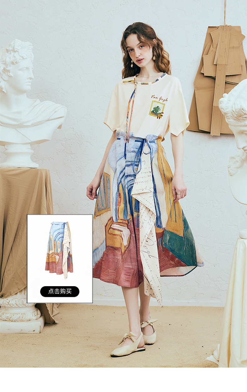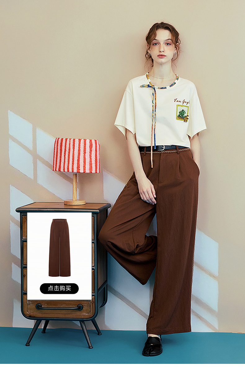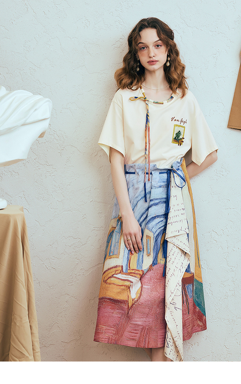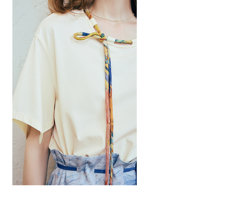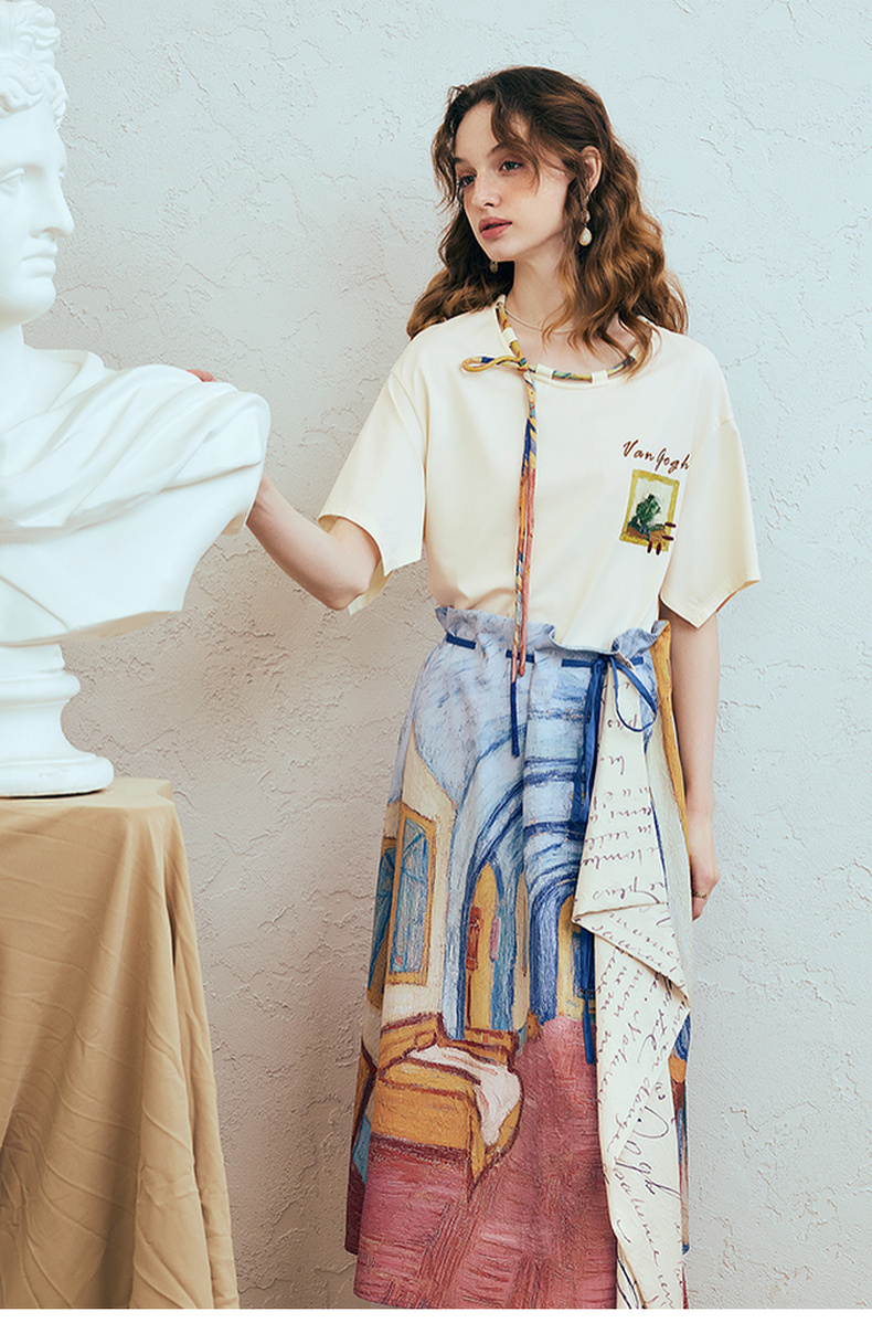 两三事梵高文艺 弦外智音 2025夏季新款彩绳绑带领印花短袖t恤女