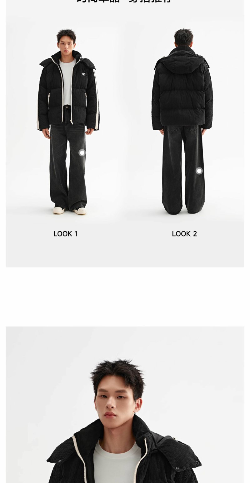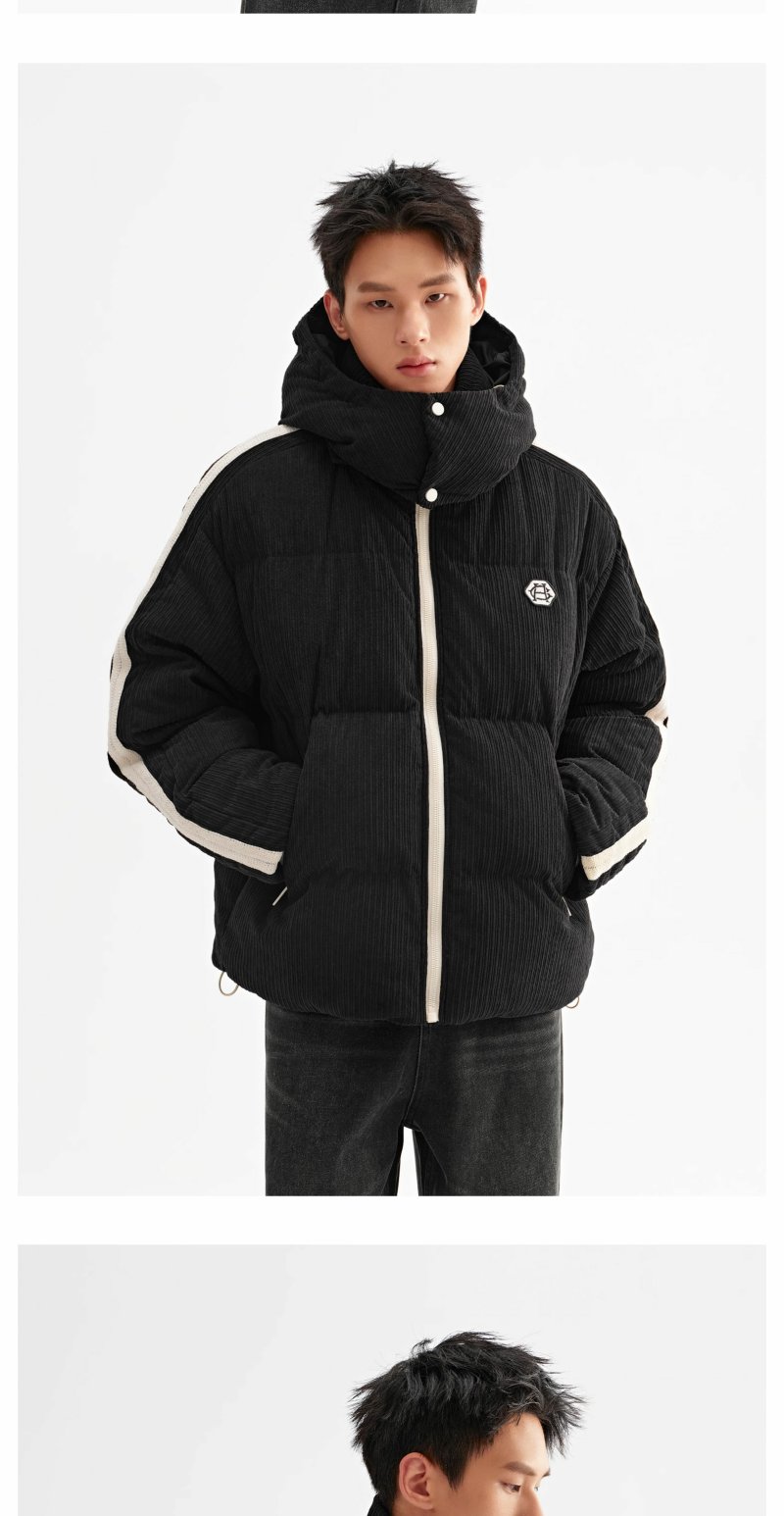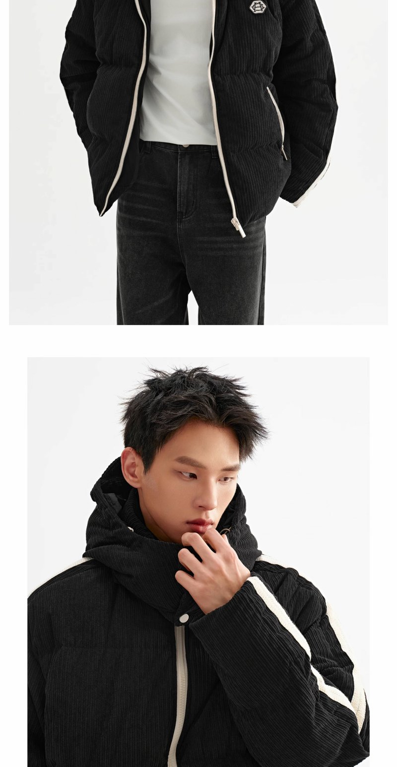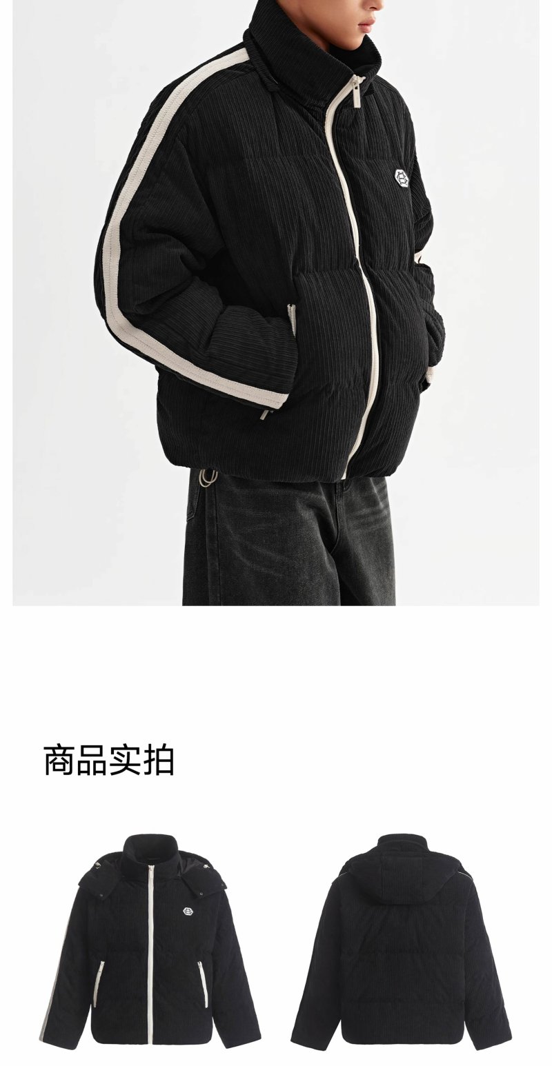 CHINISM赤尘 灯芯绒撞色连帽可拆卸羽绒服男冬季加厚黑色保暖外套