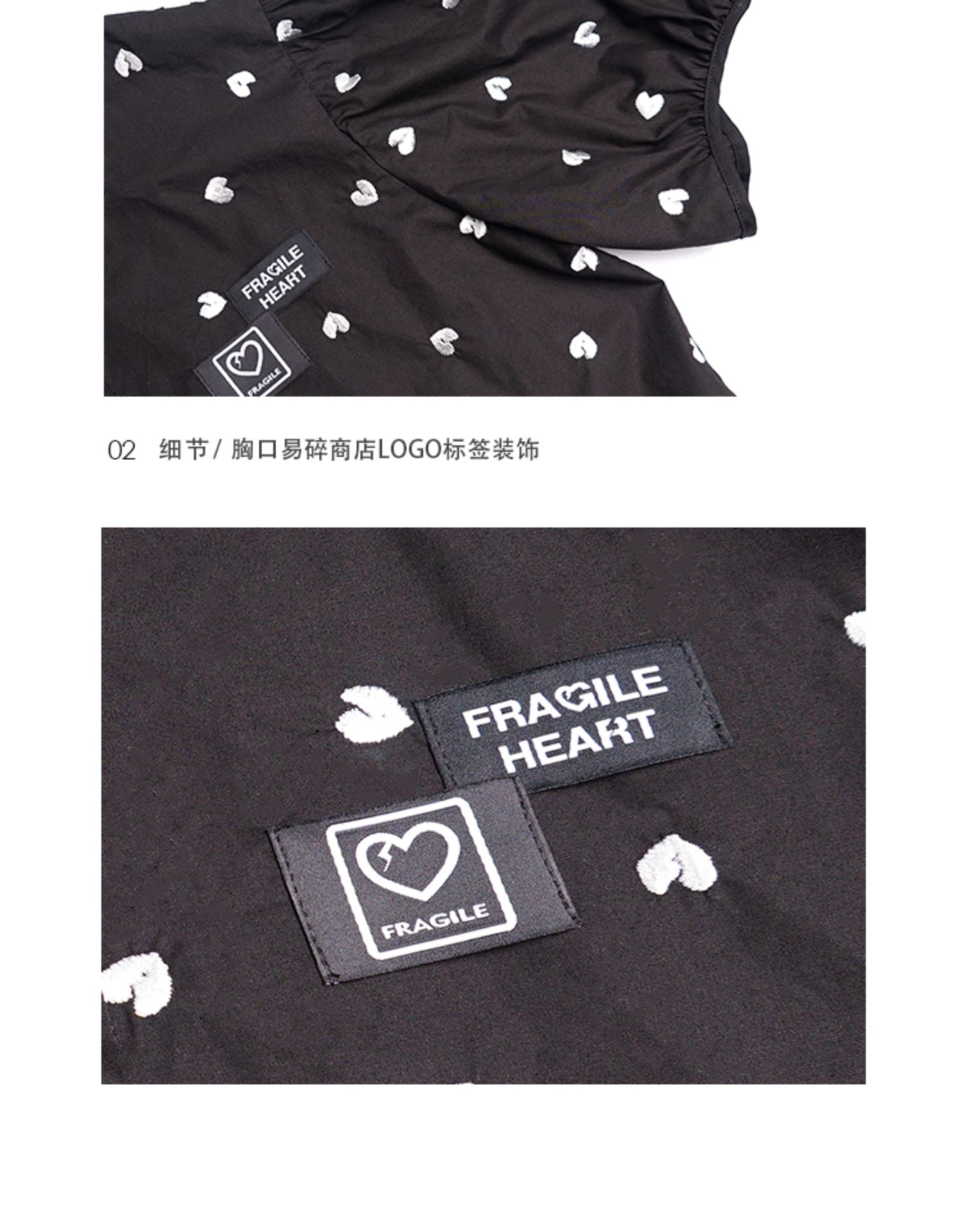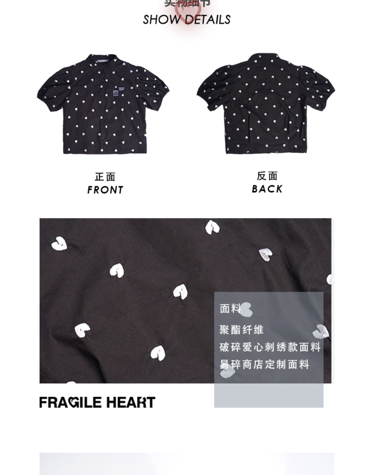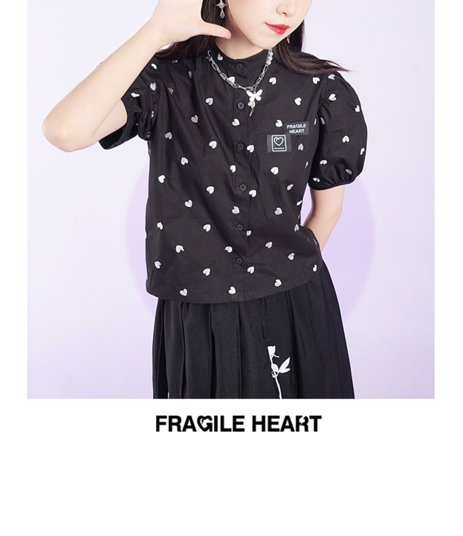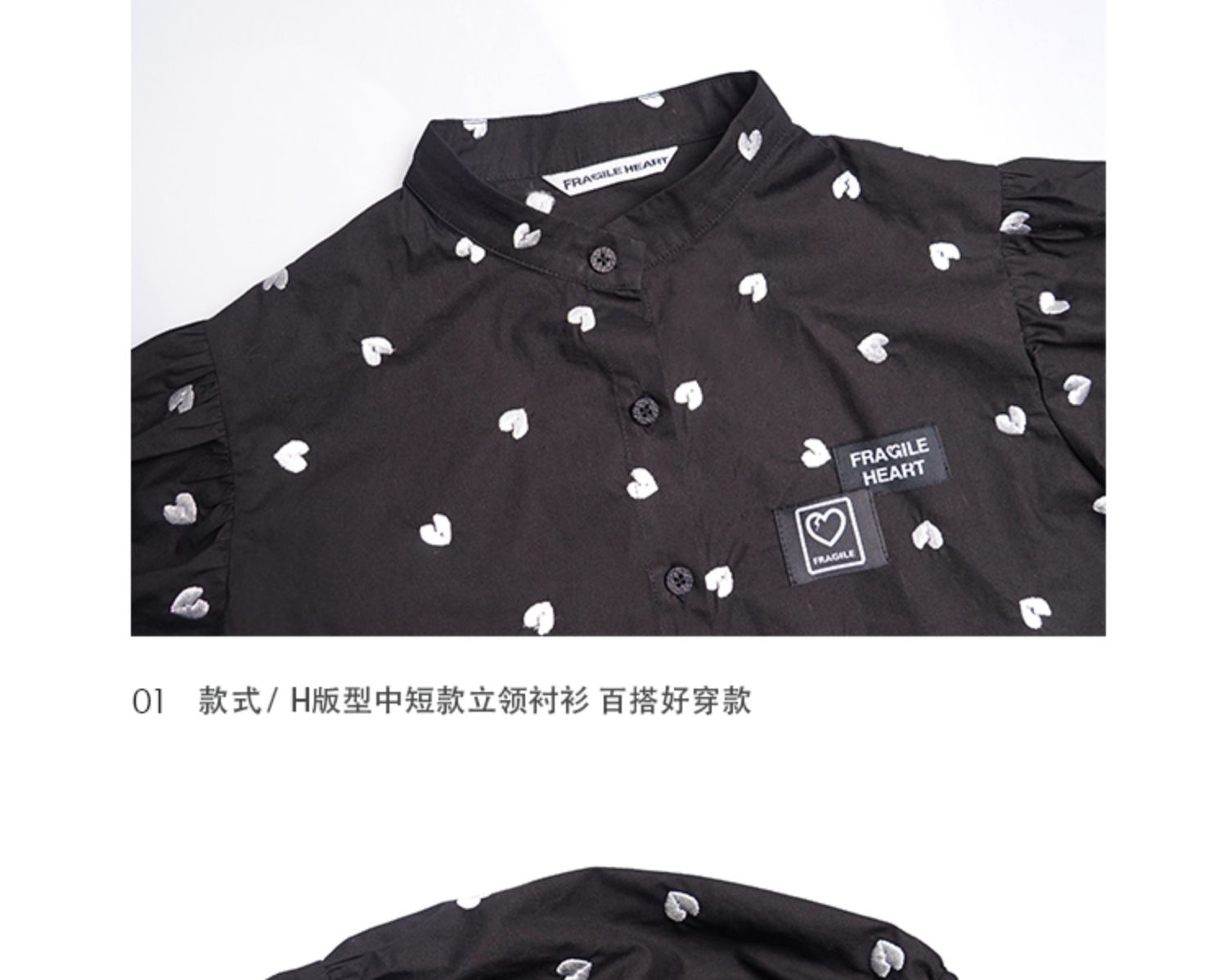 fragileheart易碎商店夏季立领原创设计小众爱心元素黑色衬衫女