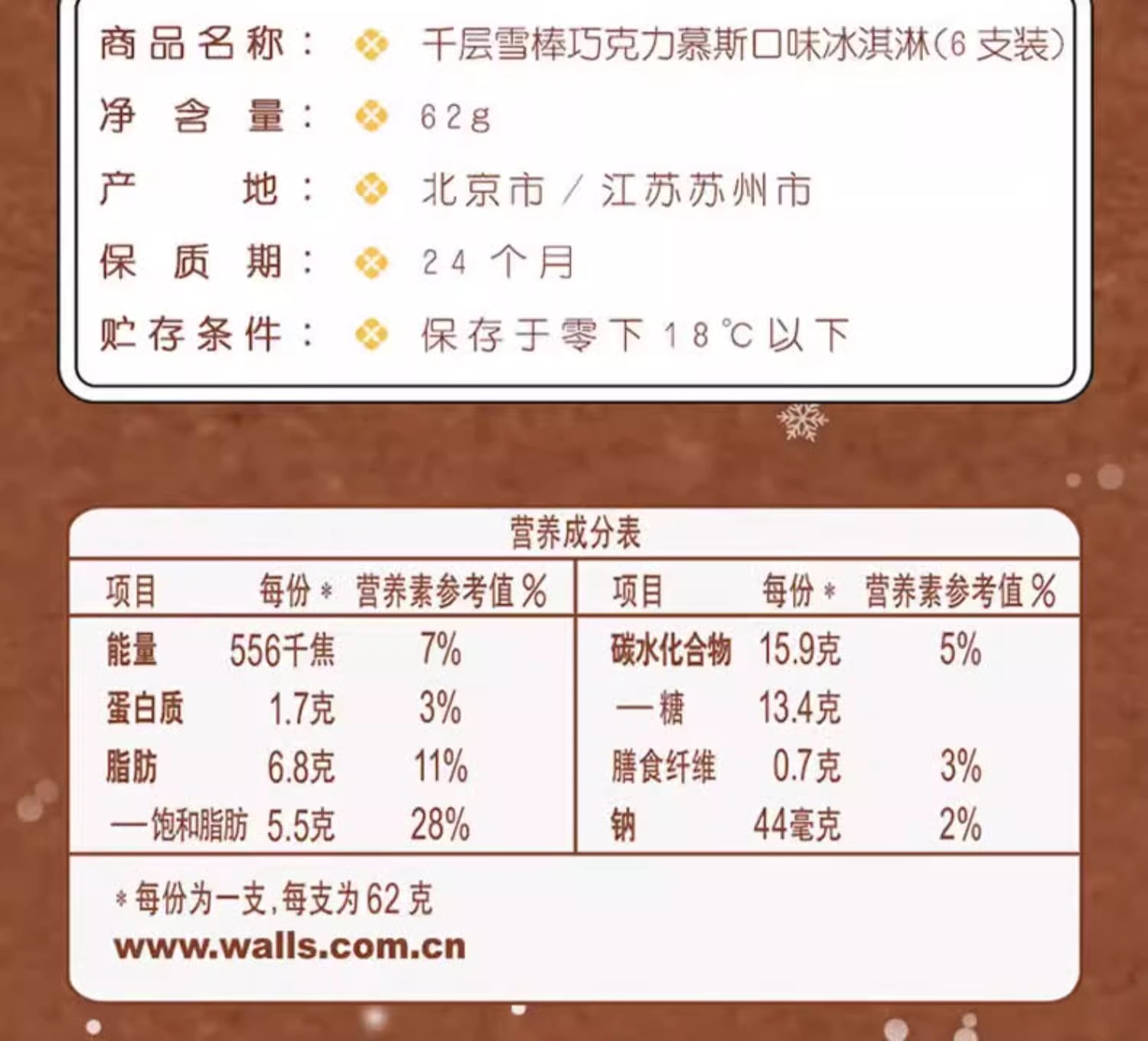 千层雪棒巧克力慕斯口味冰淇淋 18支