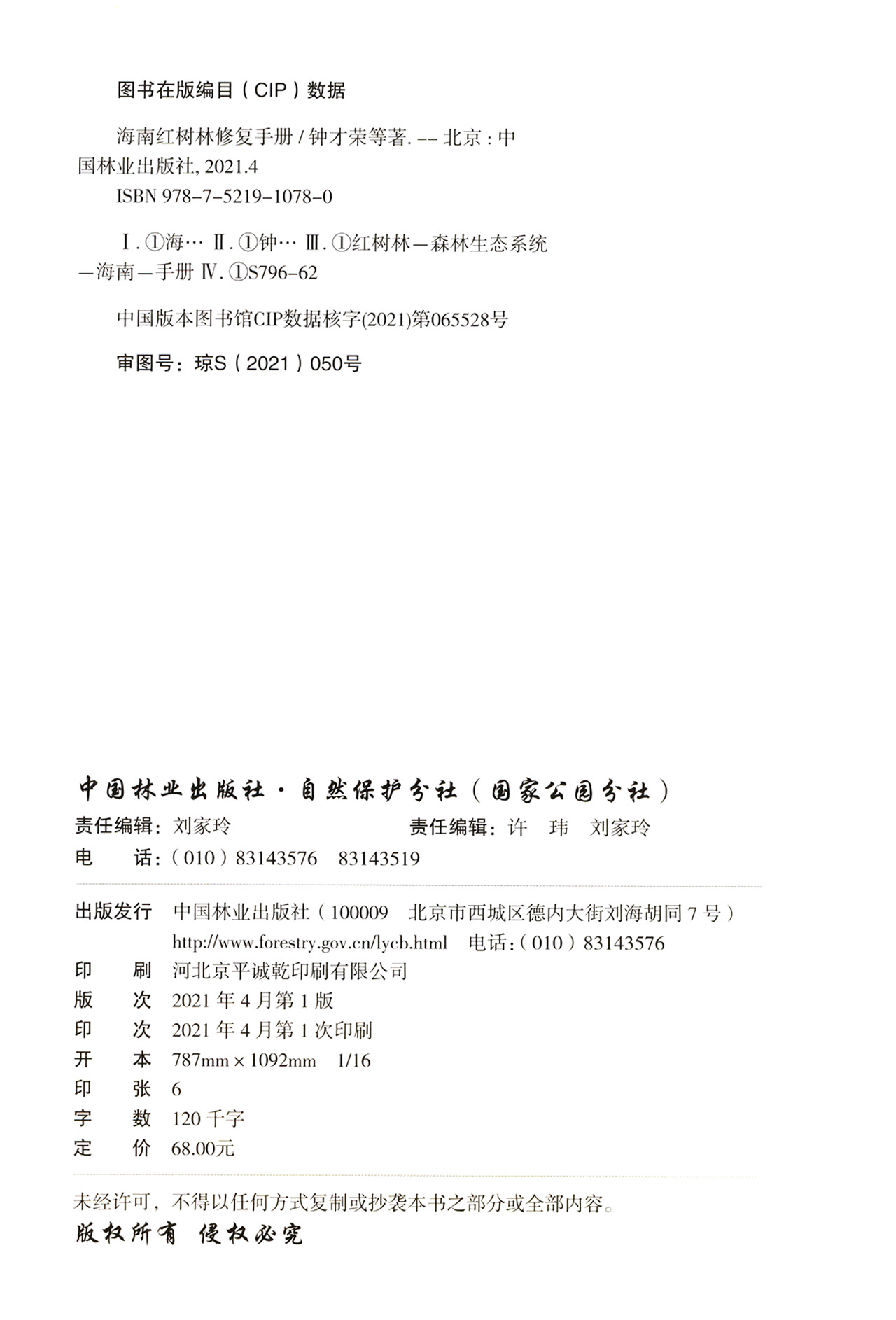 海南是我国主要的红树林分布区之一。海南红树林由于历史上围海造田、挖塘养殖、水体污染等不合理的开发利用和人为破坏,导致红树林面积减少、林分质量下降,亟需修复。本书介绍了海南省红树林湿地现状、红树林修复的主要目的及原则,在多年野外调查与研究基础上,结合红树林育苗、造林修复等经验,总结了红树林造林树种选择与育苗技术、红树林种植技术、滩涂造林整地与防护措施、退塘还林与退化红树林的修复技术、红树林生态修复的监测方法与评价指标。