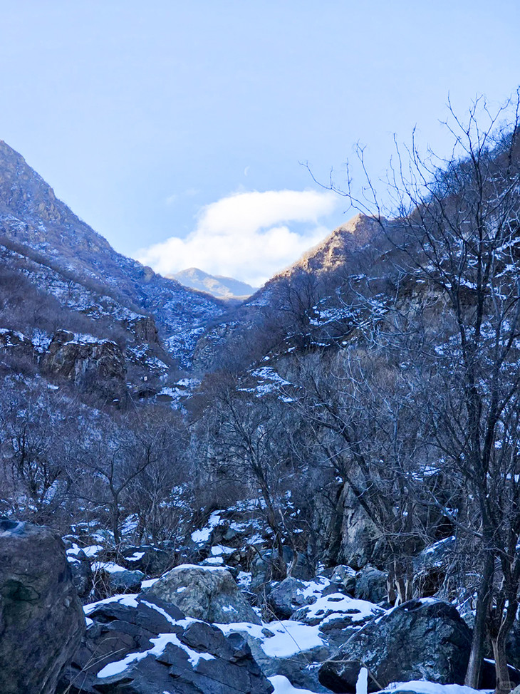 京西十八潭的冬日山谷,眼前便是那鬼斧神工的凌潭冰瀑——瀑布水流冻结,形成壮观的冰挂、冰柱和冰帘,宛如天然冰雕艺术馆。晶莹剔透的冰瀑在阳光下闪烁,适合摄影打卡,感受凝固的时间之美。冰封潭面的静谧景致。十八个潭水部分结冰,水面如镜,覆盖薄雪,与周围黑白相间的山岩构成水墨画意境。潭面冰层较薄,请勿踩踏,远观即可,安全第一。环顾四周,整个山谷已是一派雪覆山林的北国风光。
