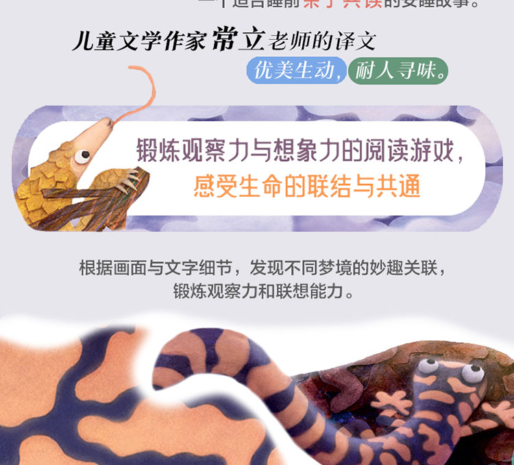 凯迪克银奖得主文策尔的这部作品,是对地球生命奇迹和复杂性充满活力与敬意的礼赞,带领读者了解不同动物体验世界的方式,培养同理心和想象力;叙事简洁而富有诗意,并引发思考:到底是谁在做梦?