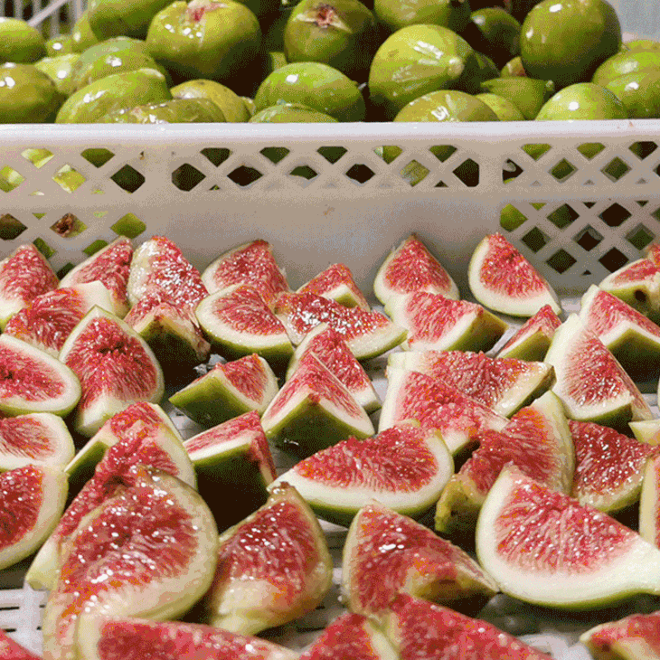 ✅ 抢鲜!大程度保护初下枝头的新鲜。 配料越简单。制作上就越考究花心思。 成熟的无花果采摘下来 送到生产车间,进行筛选和清洗。 筛选留下的好果,切除果柄, 然后分切成4-6小瓣,加大果肉的干燥面, 一方面节约干燥时间, 一方面减少果干营养和口感的损耗。