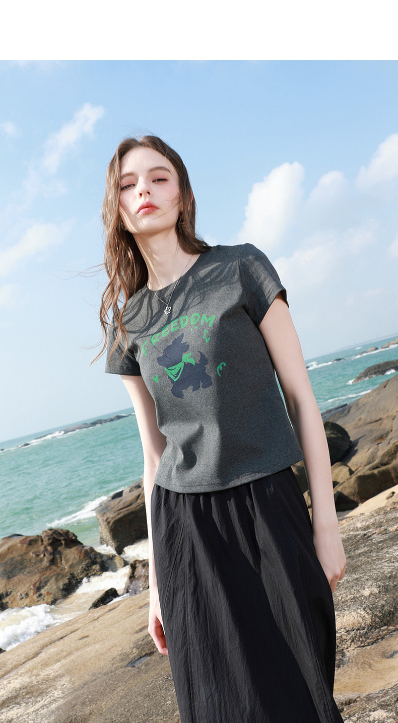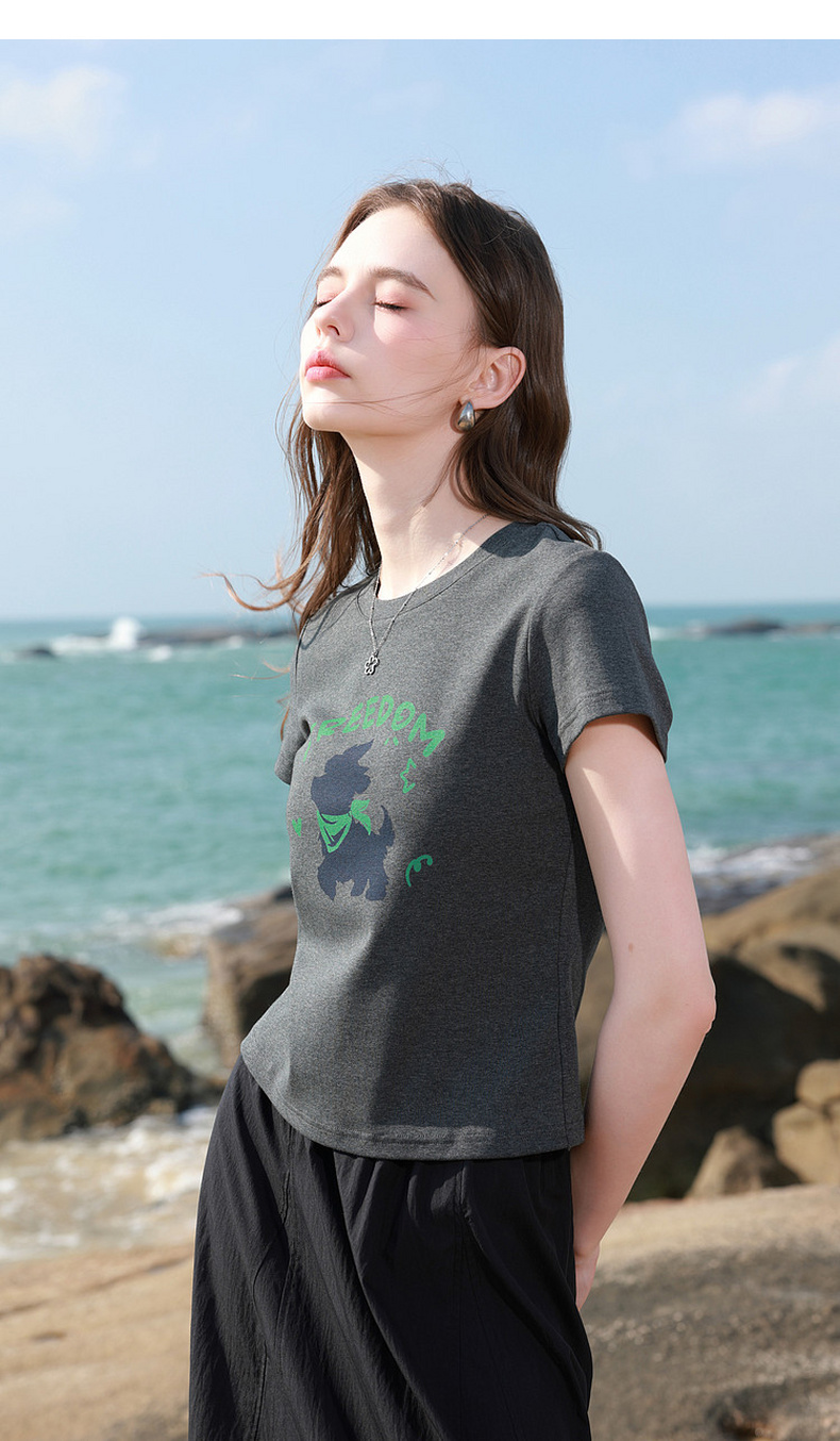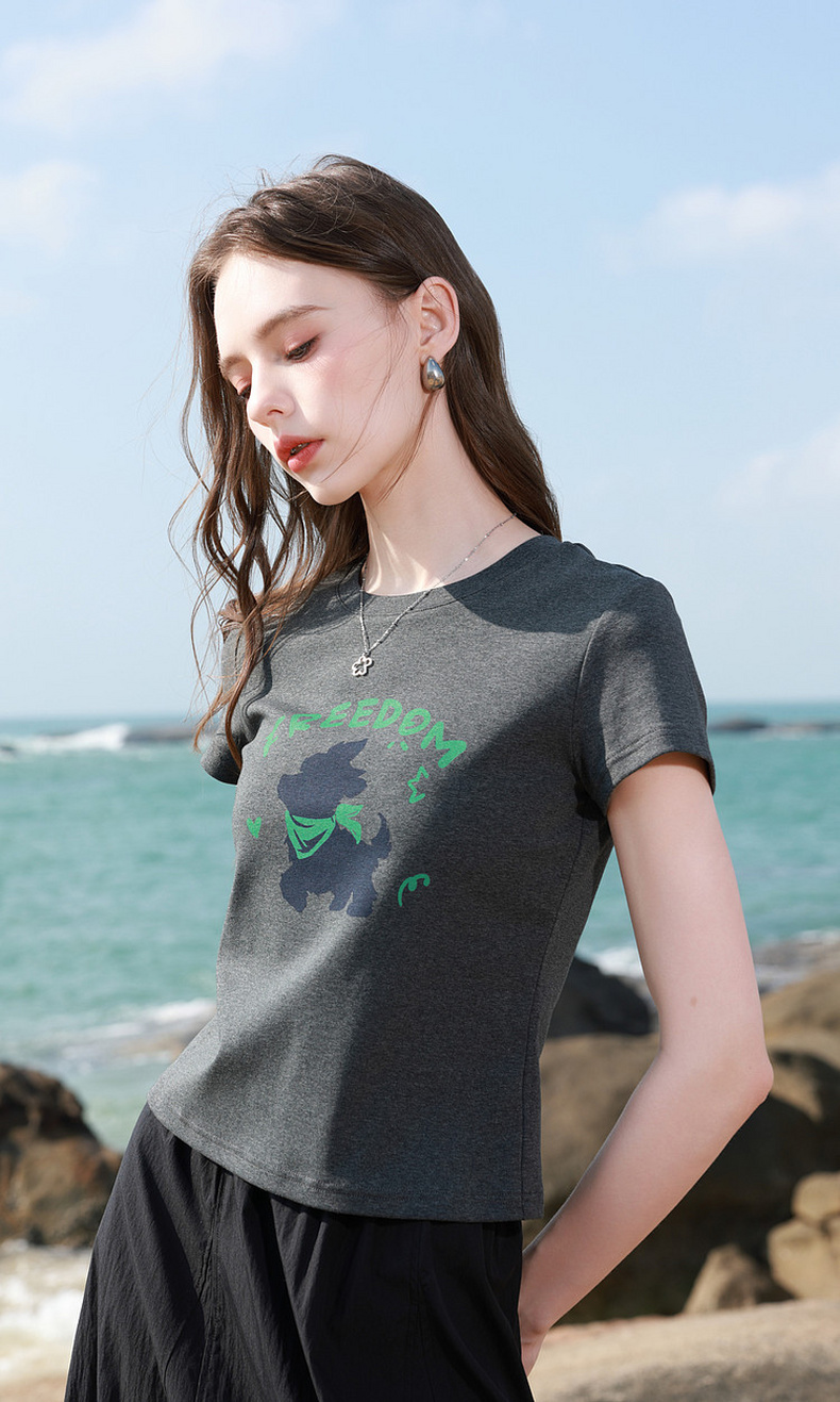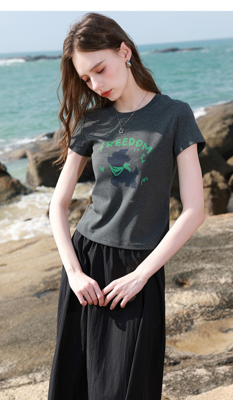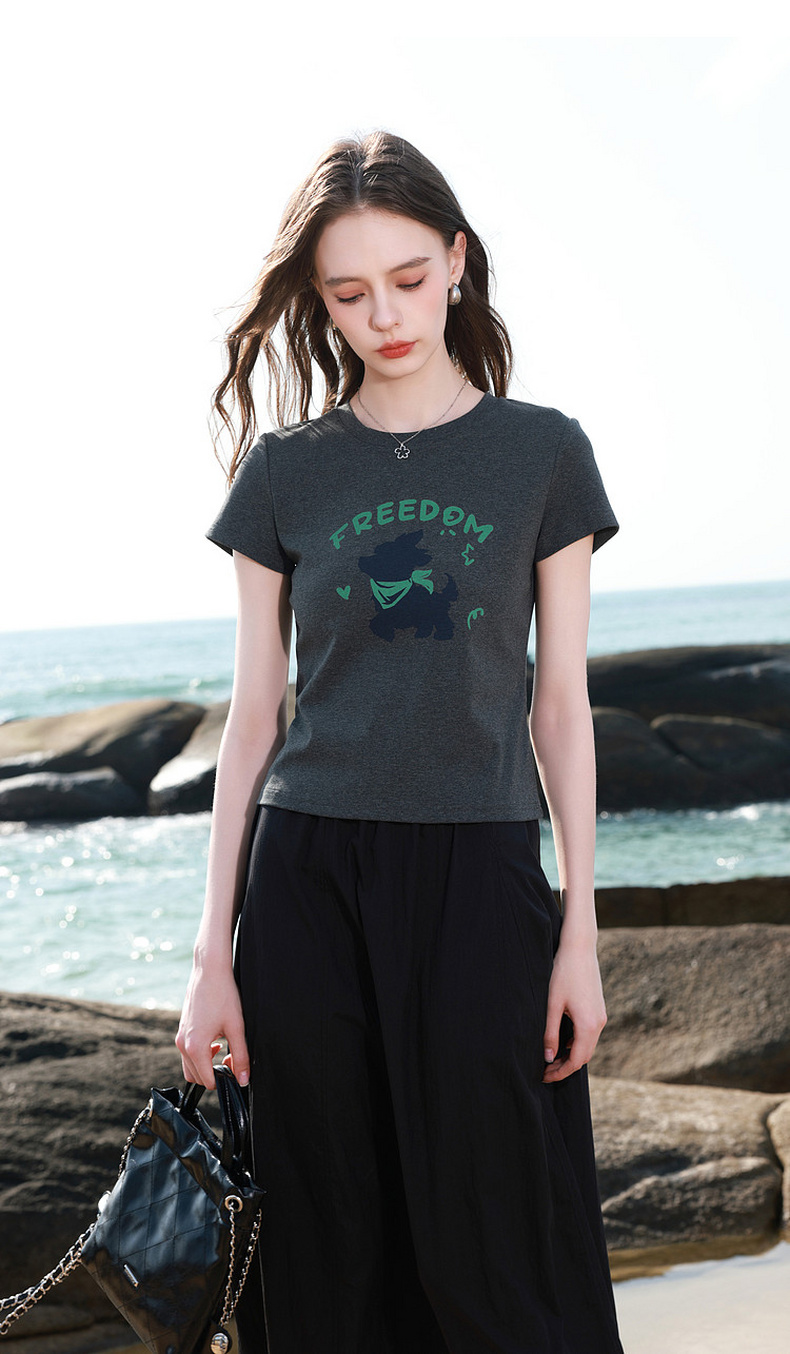 三彩2026夏季新款休闲字母印花T恤修身短款圆领短袖套头衫上衣M