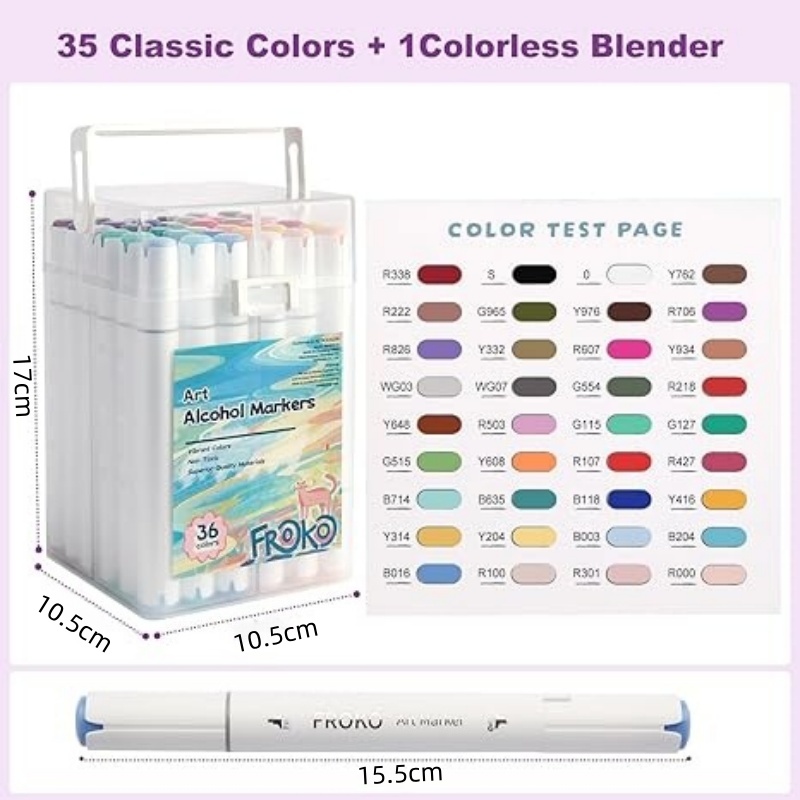 36种精心挑选的颜色:释放你内心的艺术家—马克笔,36种精心挑选的颜色(35种鲜艳色调+1款无色调色)。无论你是初学者还是专业人士,FROKO马克笔都能带来顺畅的墨水流动和无缝的混合效果,带来惊艳的效果。