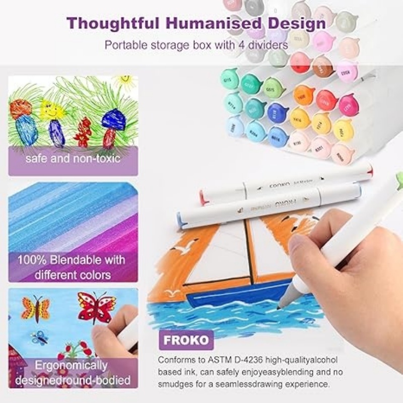 FROKO 马克笔无毒安全:高品质的墨水,易于混合,无污渍,绘画体验无缝。