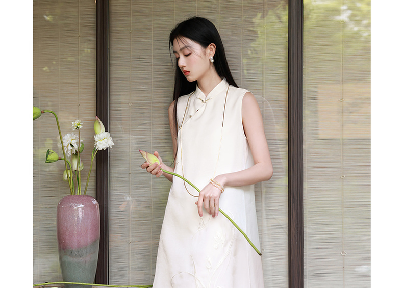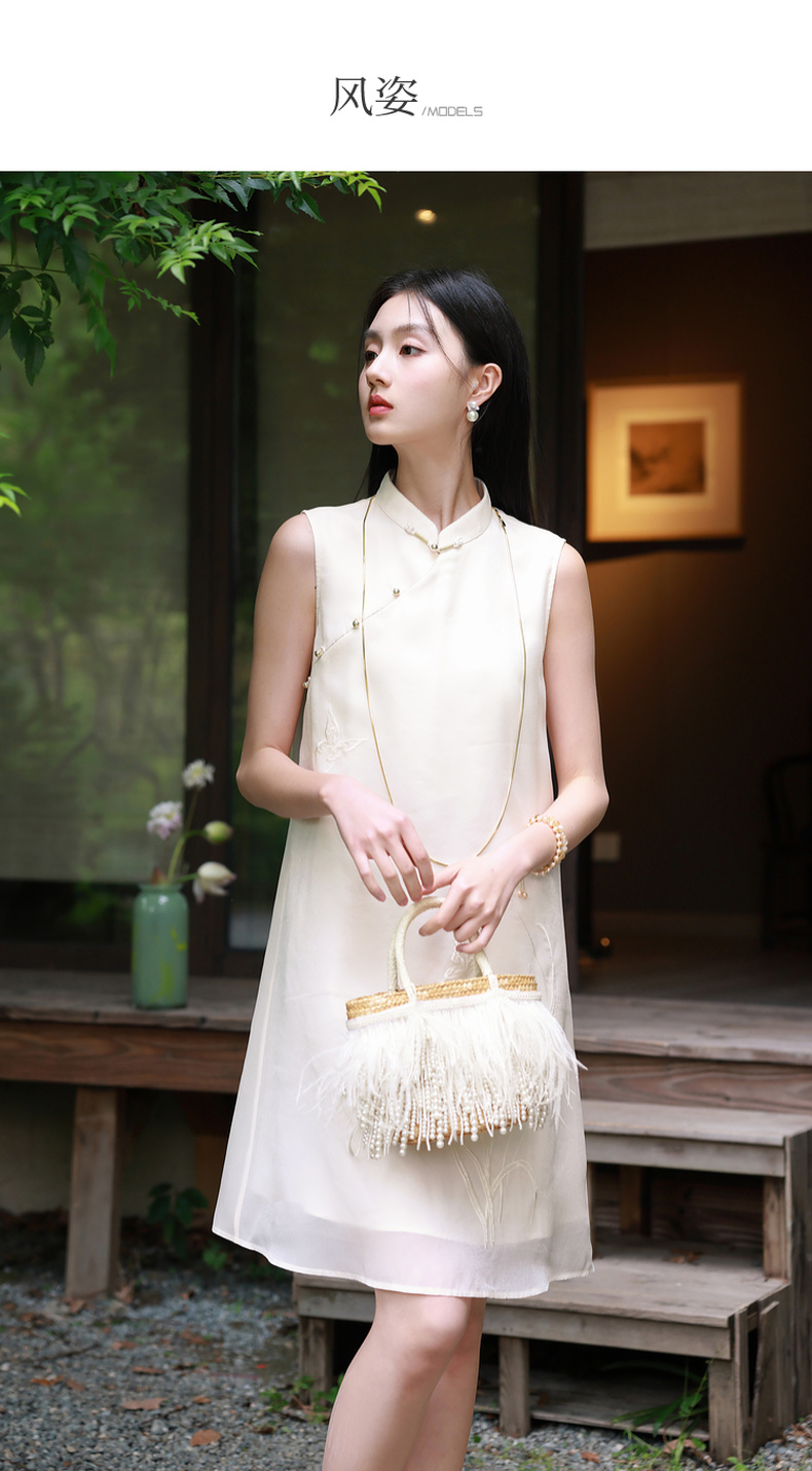 三彩【双影翩翩】2025秋季新款新中式连衣裙立领绣花无袖A字裙C