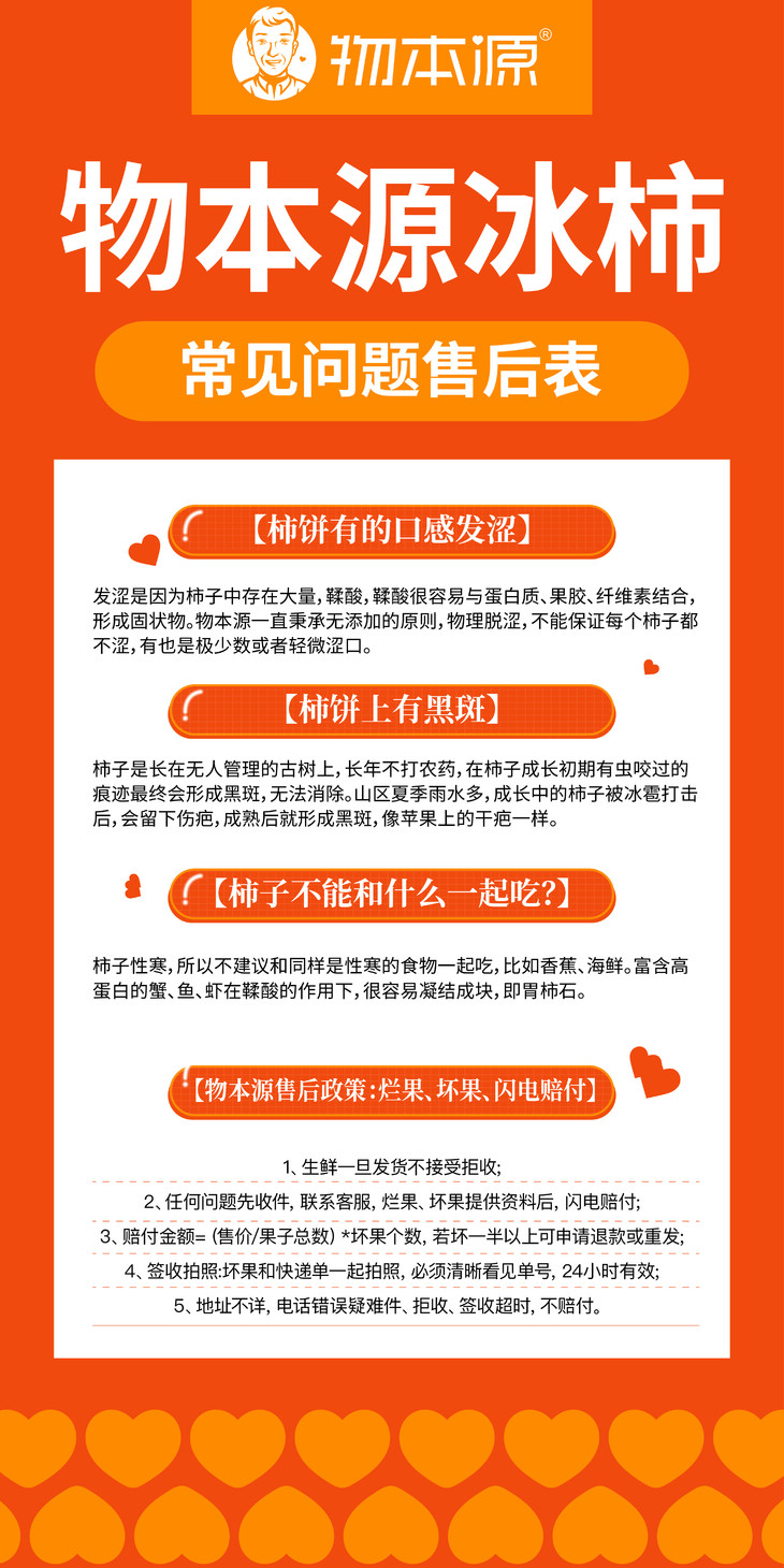 【品名】物本源微霜流心柿饼 【特点】软糯流心,干而不硬,甜而不腻 【产地】临朐县五井镇隐士村 【发货地】山东潍坊 【保质期】: 冷冻6个月 【发货时间】:下单后5天内发出 【发货快递】:顺丰冷运 【售后处理】: 请认真查看售后详情哦 1、客户收到货签收后24小时内检查产品,严重损坏,24小时内申请售后必须有快递面单号+坏果拍照,超时不予无理由退换货 2、损坏的果子跟面单放在一起拍照 3、个头大,个数少,个头小,个数多,甜度、软硬因不同阶段和个人味蕾差异,不做理赔依据 4、柿饼是纯天然无任何防腐剂的食品,且喜冷,收到后请第一时间放冰箱冷冻室! 5、如质疑重量不够(因前期水分大,运输过程有2-3两的损耗属于正常)请在开箱前称重(禁用体重秤,误差大)拍照理赔!拒收不受理售后! 6、产品发货不以个数为单位,按照实际重量为标准 7、在不影响二次销售的情况下支持七天无理由退回 8、不支持拒收,拦截 9、产品已经发出的情况下,不可更改地址,不拒收,下单前,一定要留对信息,如果一定要更改地址,改地址产生的运费我们不承担 后台会先出快递单号,代表进入排单状态,不代表已经发出。不用催,宝们耐心等待哈,只有有了实际物流产生,才代表已经发出