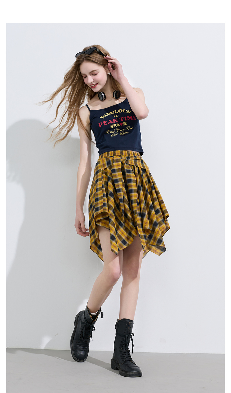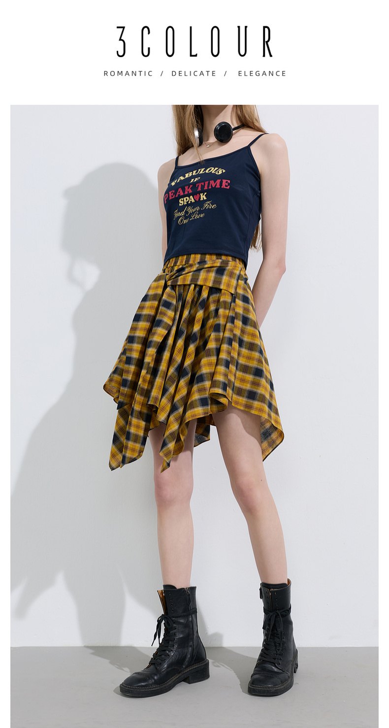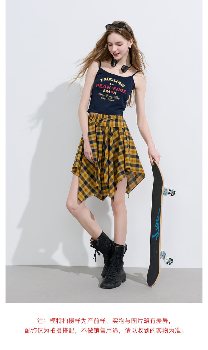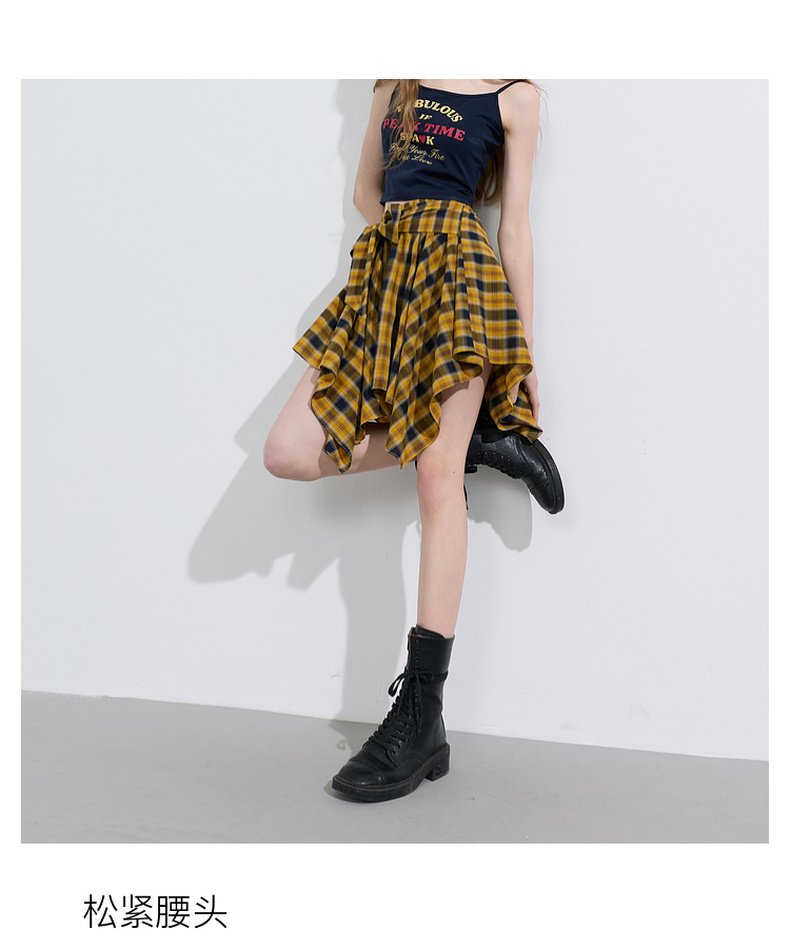 三彩独醒2025夏季新款格纹半身裙松紧高腰不对称A字裙短裙甜酷F