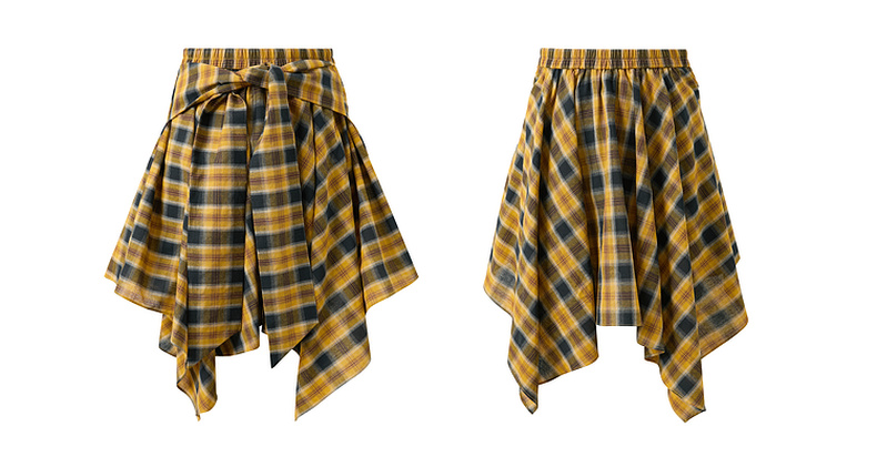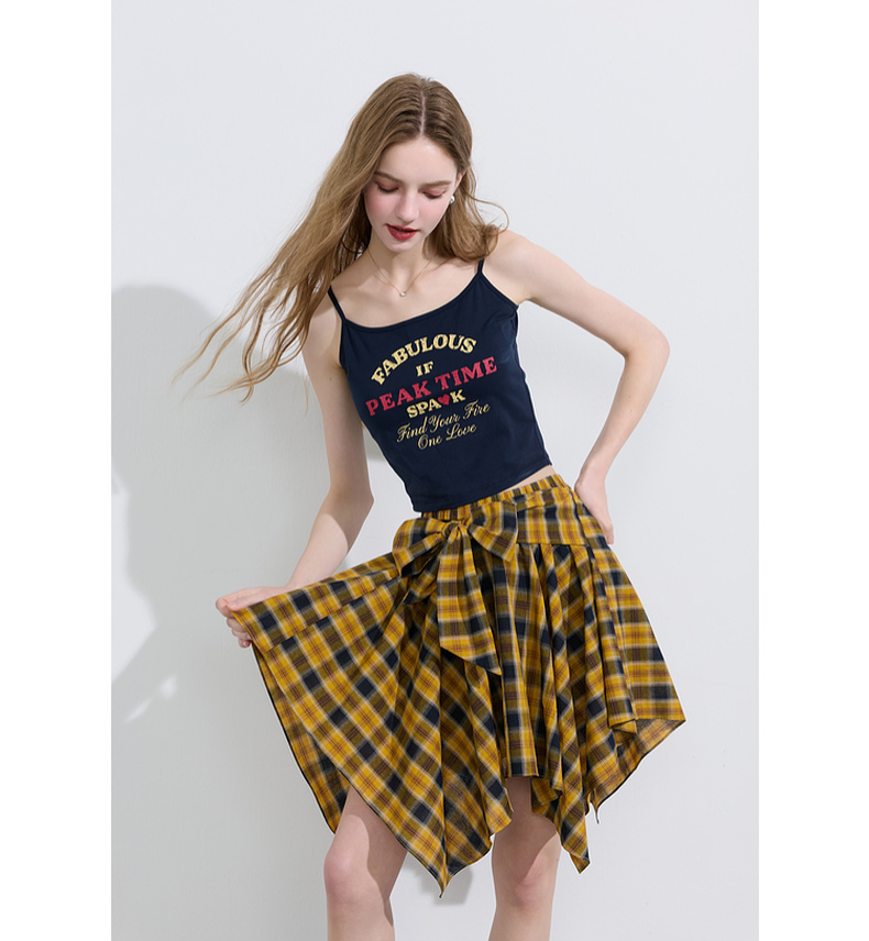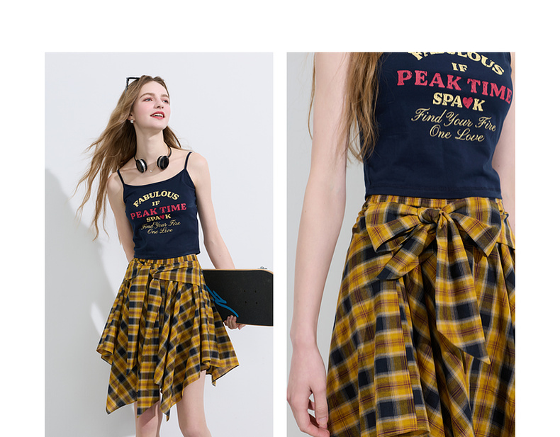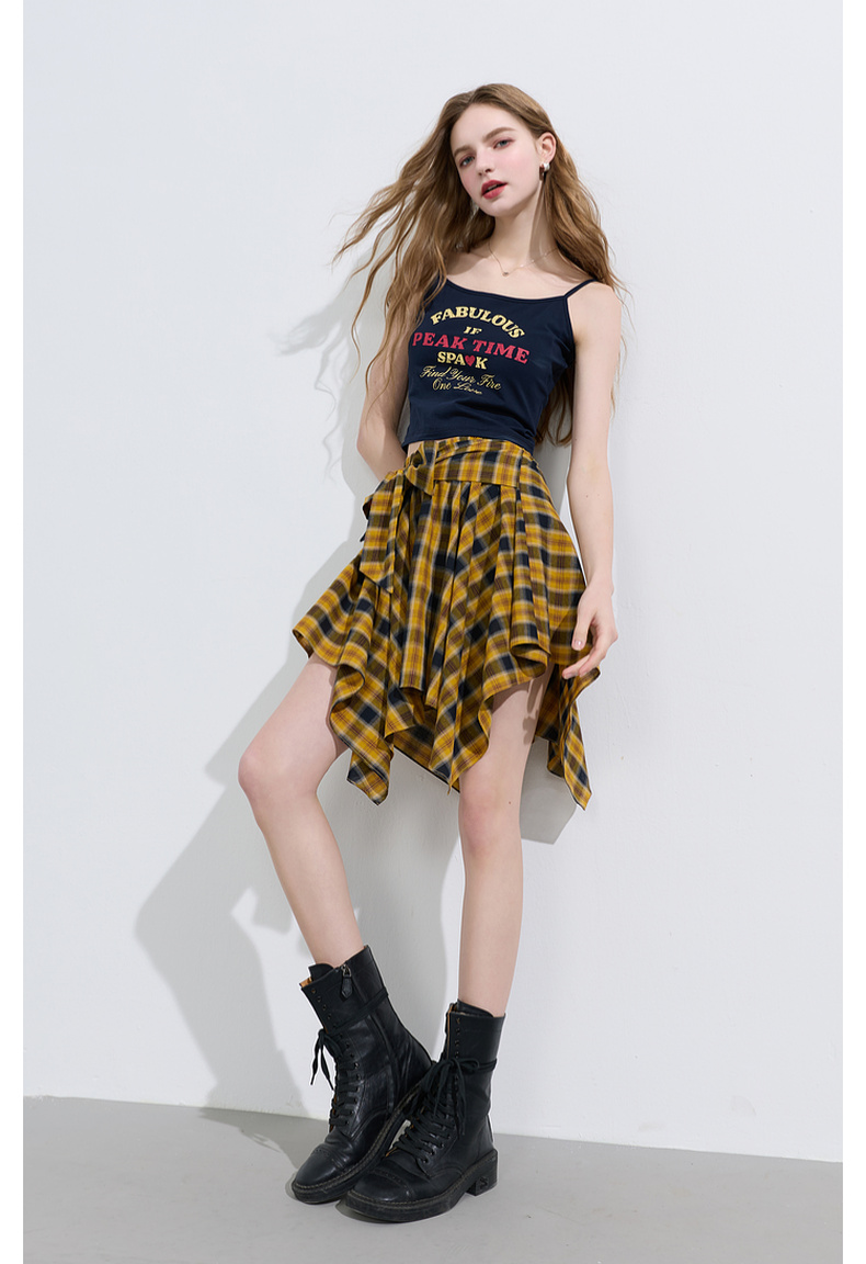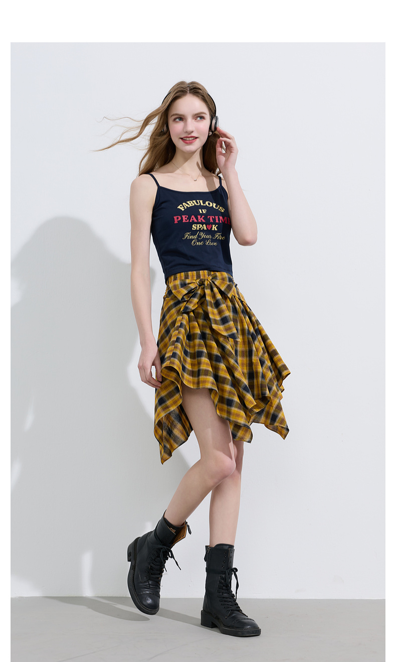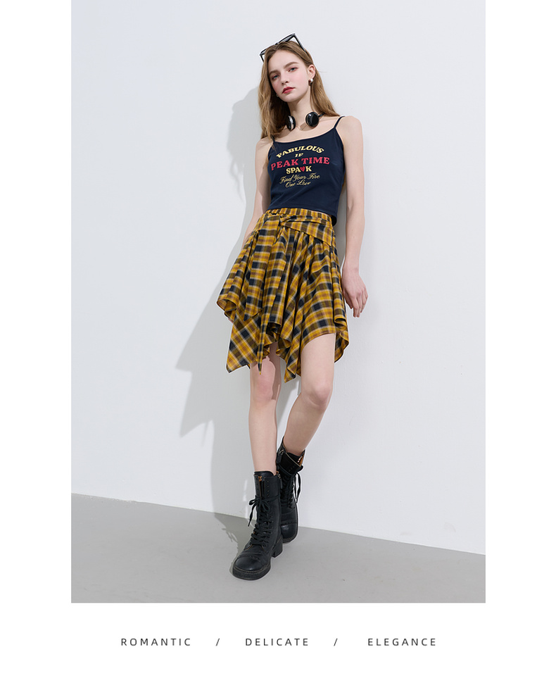 三彩独醒2025夏季新款格纹半身裙松紧高腰不对称A字裙短裙甜酷F