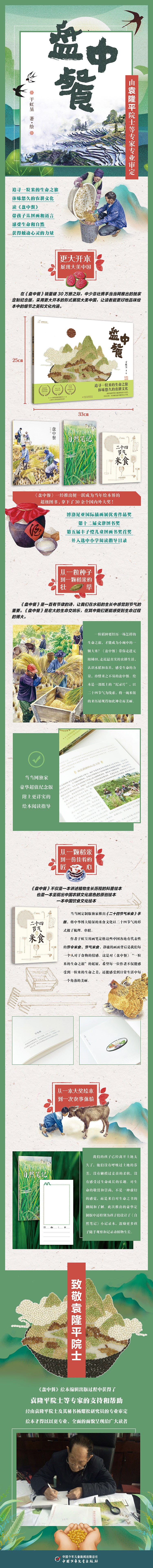 一粒稻种要经历一场怎样的生命之旅,才能成为小碗中的一颗大米?《盘中餐》带你走进元阳梯田,走近*真实的农耕生活,认识水稻和农具,感受生命的力量,珍惜来之不易的盘中餐。绘本是一部纸上的“纪录片”,以二十四节气为线索,将一碗米饭的来历展现得如此神奇而美丽。