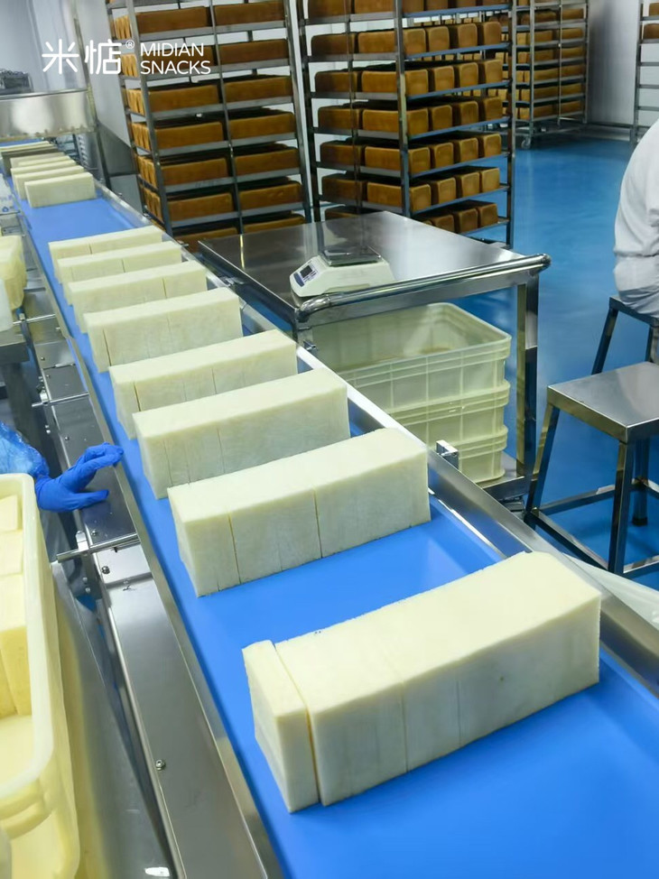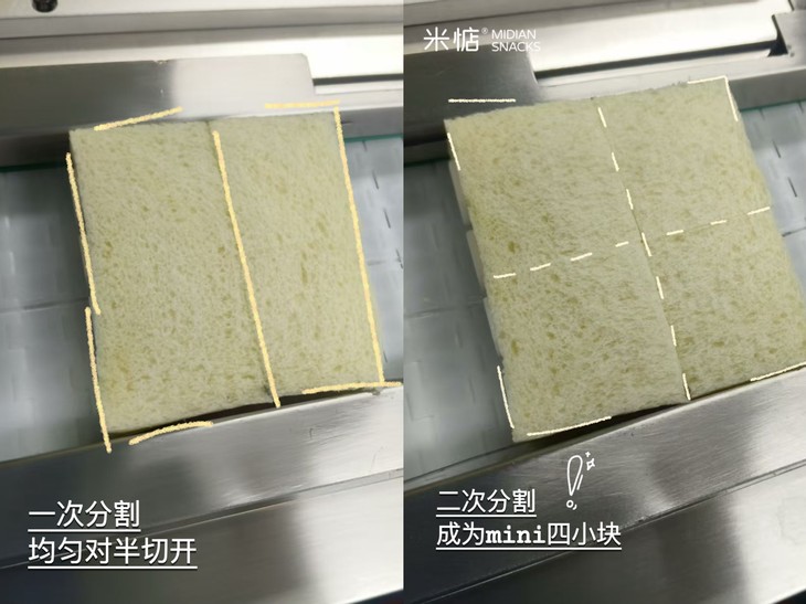 最后才到吐司蜕去外皮的时刻,每一块吐司先经机器利落剥去外皮,露出内里米白、气孔绵密的面包体🍞 而这只是开始,吐司前后还要经过3️⃣次精细切割,机器精准卡位,从长度到厚度确保每小块吐司大小均等、薄厚一致 从制作再到精细化切割,再到包装出库,每一道工序都严格把控!每一口软糯里都是看得见的用心