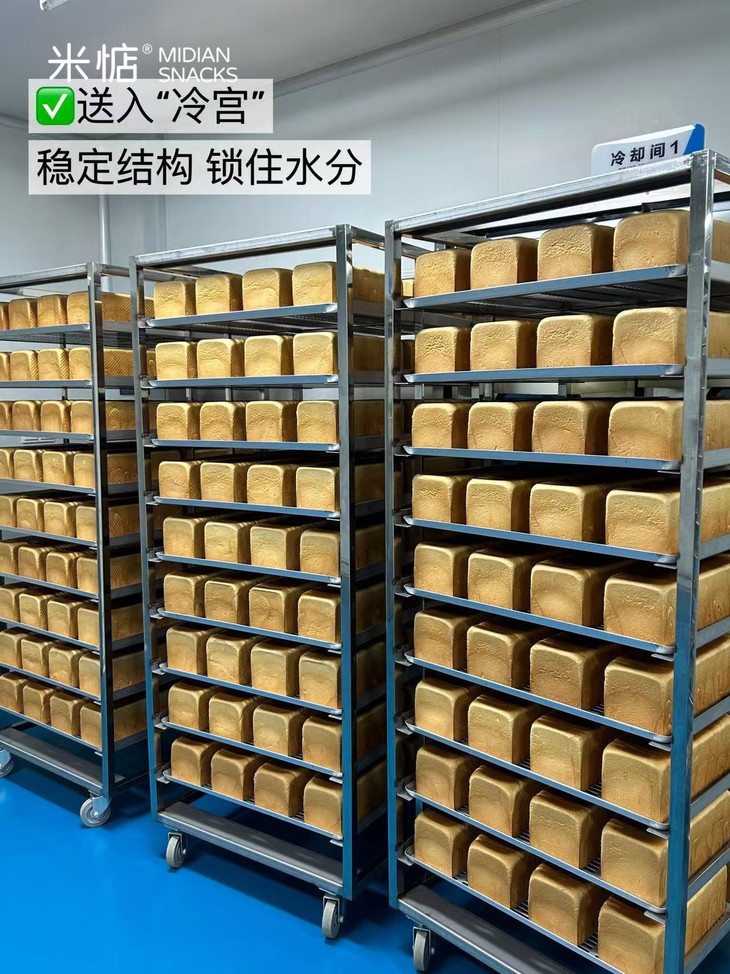 当吐司披上金黄战袍后,第一件事便是脱模,避免吐司娇嫩的底部被水汽浸湿,变得软塌无力 脱模后的吐司,需要安置在特制的冷却架,让热量缓慢散失,内在冷却,将吐司蓬松的肌理和完美的形状“定格”下来📷 这短短的个把小时,是一场从“好吃”到“惊艳”的进化,吐司真正的麦香与发酵的醇厚风味在此刻才被完美“锁住”🔒