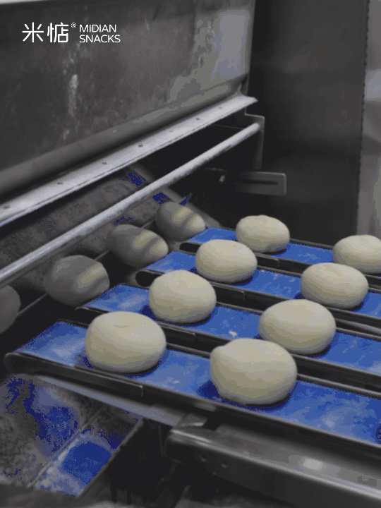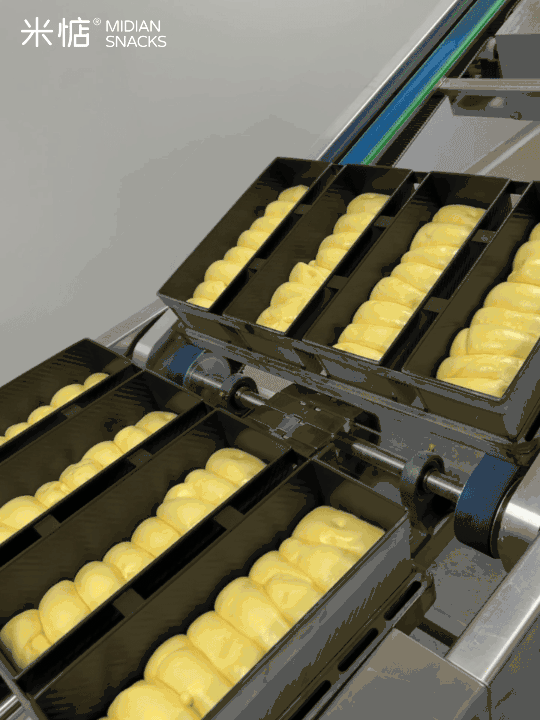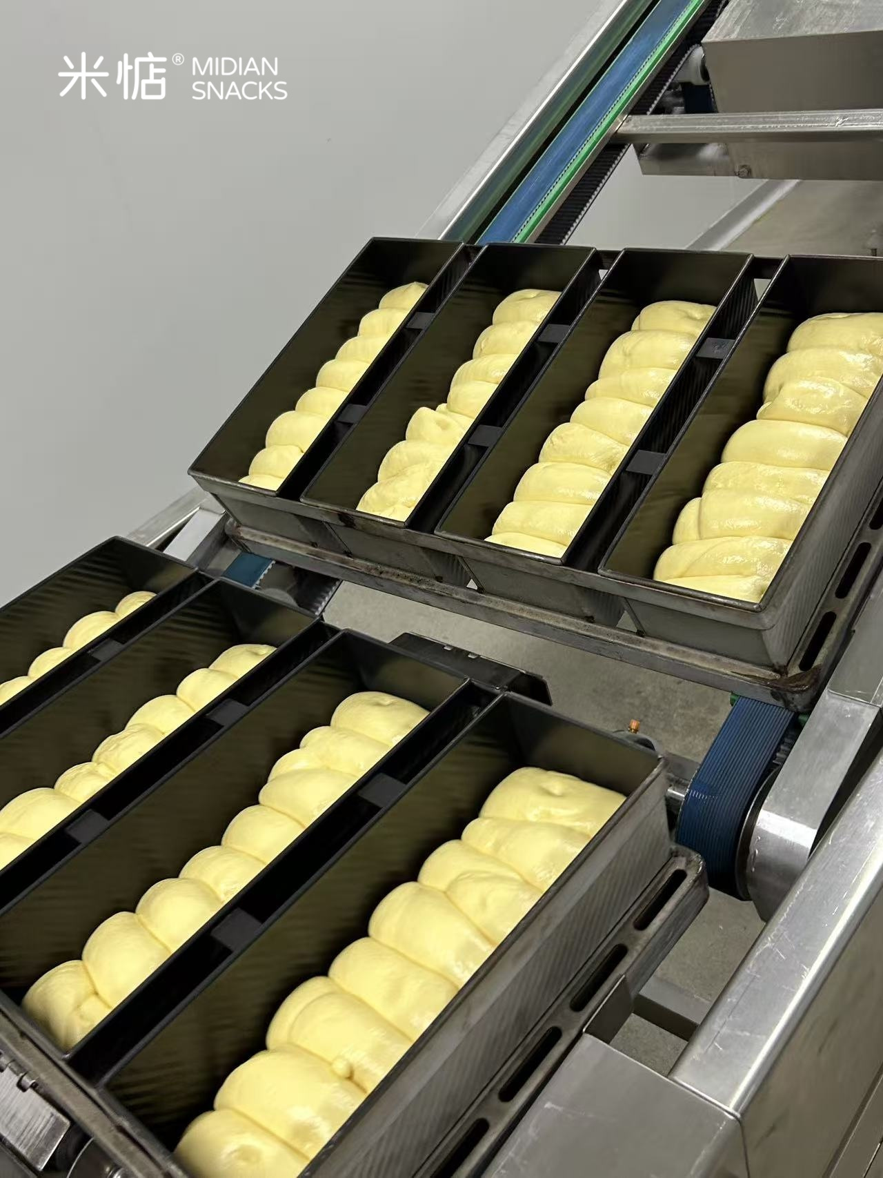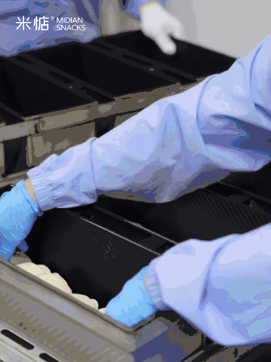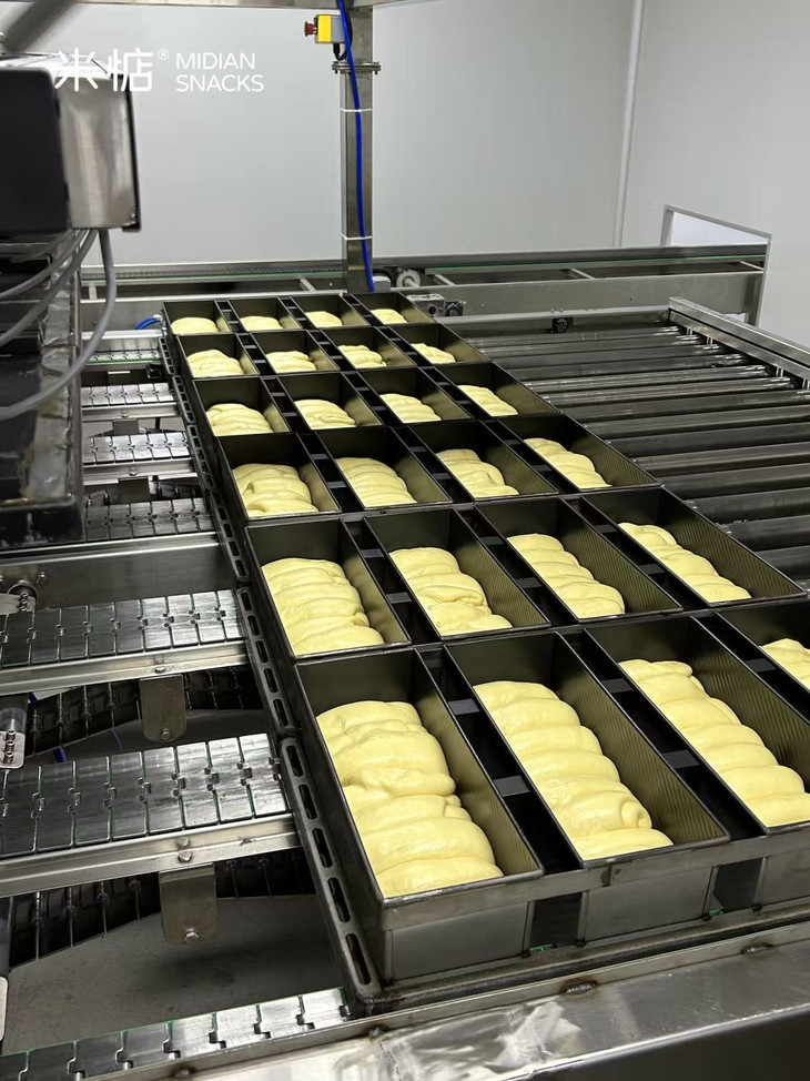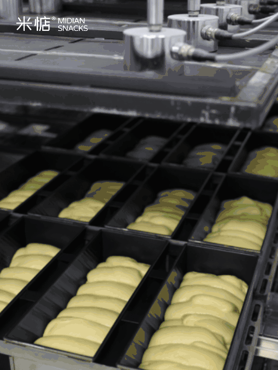 我们不选用市面上一次性成型的小模具 每块吐司都是从正儿八经的大吐司切出来的 大吐司模具给足了面团发酵空间 发酵过程中,人工定时巡视醒发湿度 最终发酵完成后进入进入隧道炉分区烘烤