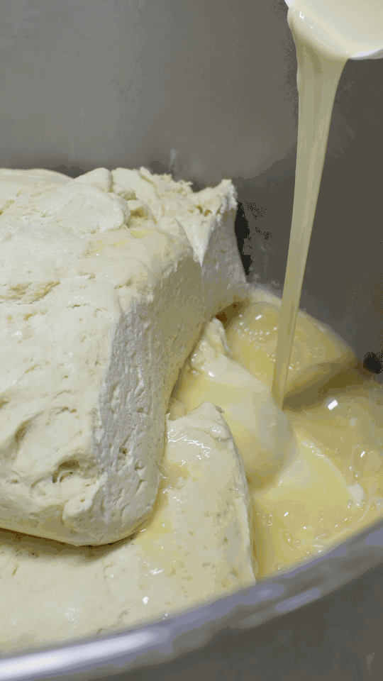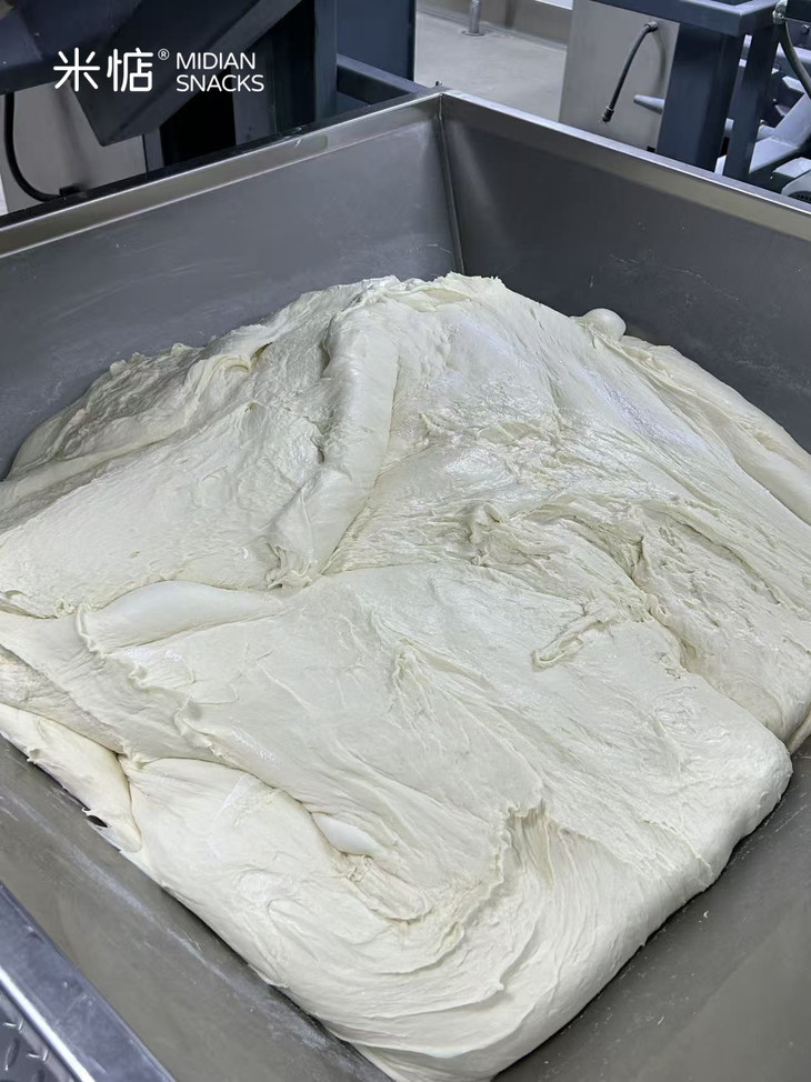 压过之后的面团需要通过摔打进行排气 排出吐司内部的不规则大孔洞 留下气泡核引导未来发酵的基础🌱 面团经过压面机的反复碾压,面筋处于紧张状态 适当的摔打和折叠可以帮助面筋网络松弛 恢复延展性,面团更容易塑形 就像在整理一床蓬松的羽绒被 让揉捏烤出的吐司更有弹性和支撑力🔝