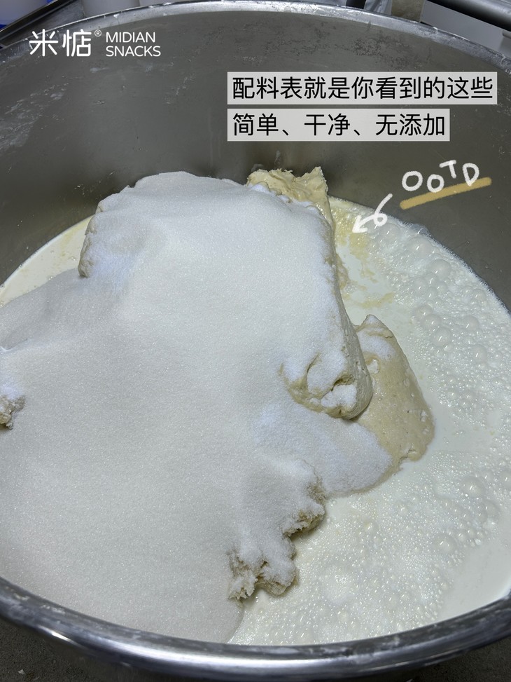 【配料表】:配 料 表: 小麦粉、巴氏杀菌乳≥28%、白砂糖、黄油≥6%鸡蛋、 炼乳、海藻糖、食品加工用酵母、食用盐、酸麦粉、调制乳粉