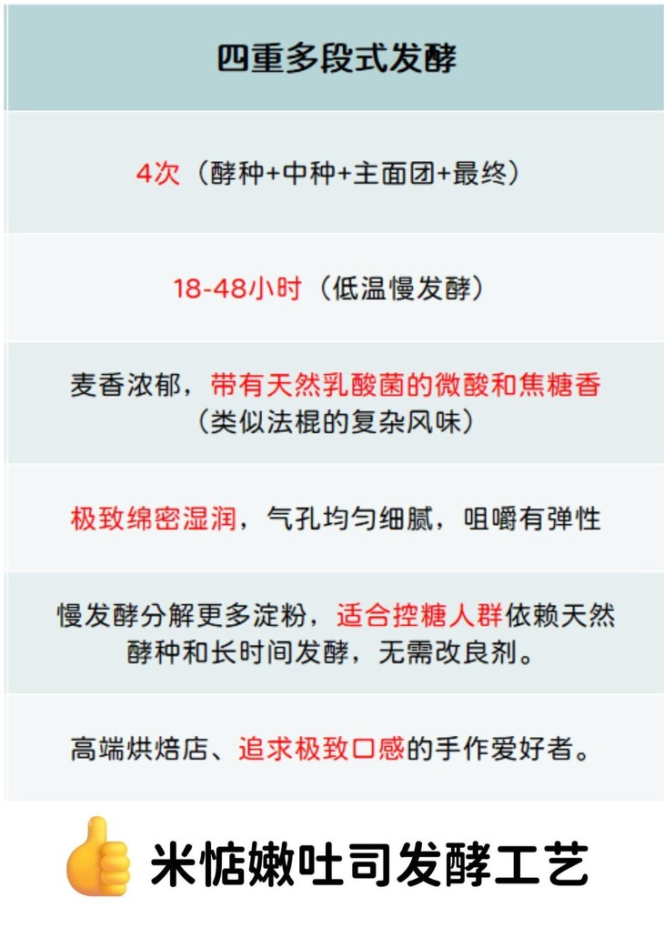 🔸四次等待,换一口有呼吸感的吐司 市面上风味单一,口感干巴的吐司 往往是选用1~2次速成发酵🙂↔️ 口感主要依赖面粉和酵母 手感蓬松但粗糙,还易老化(冷藏后易变干) 我们选用了更复杂繁琐的 ——“四重多段式发酵” (酵种+中种+主面团+最终) 相当于把面团“叫醒”四次