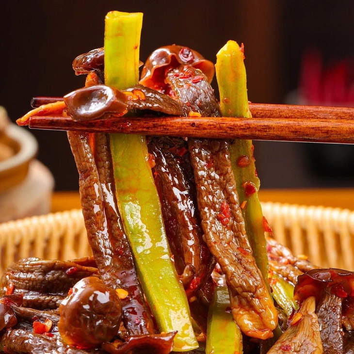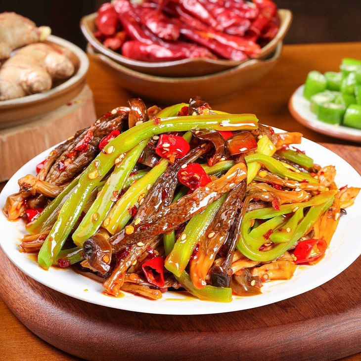 湖南秘制的辣椒油香裹着鹿茸菇贡菜,鲜不腻口,配酒解腻✨