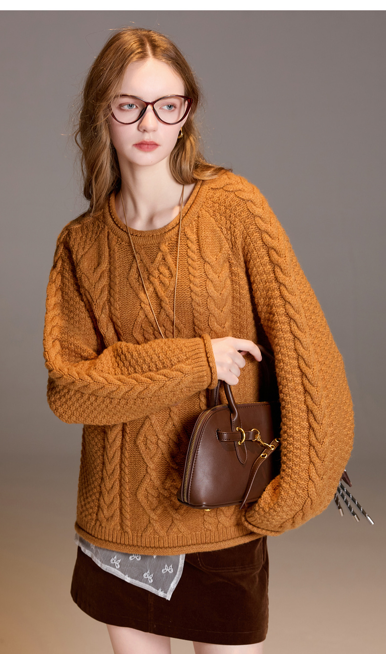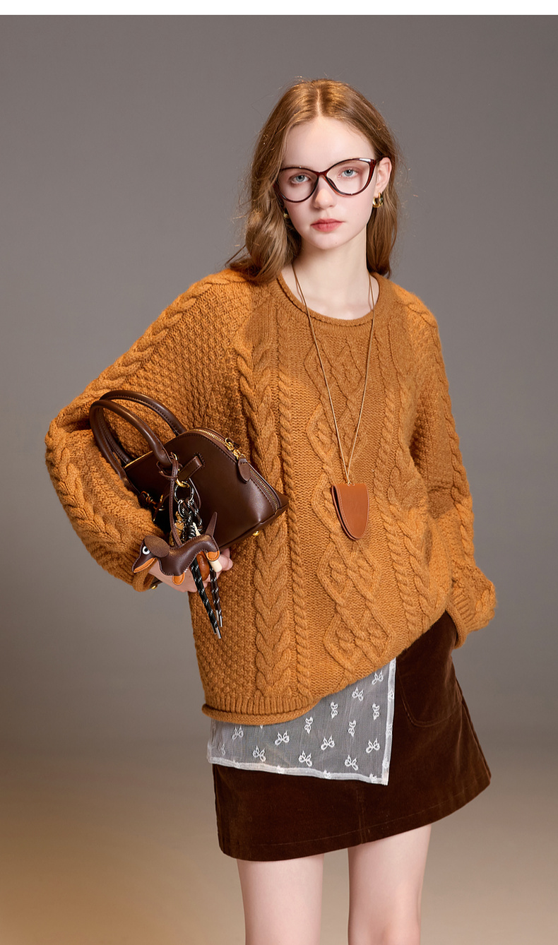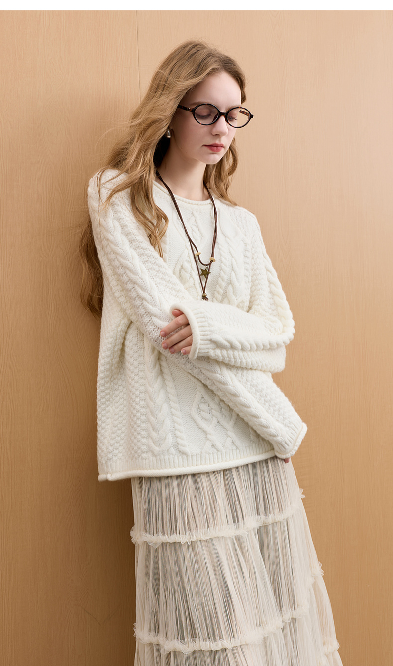 三彩2025冬季新款宽松圆领针织衫绞花肌理长袖套头衫百搭M