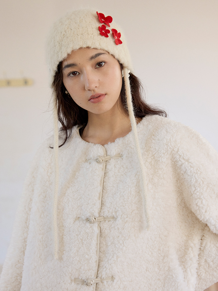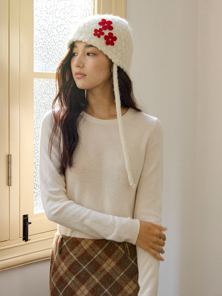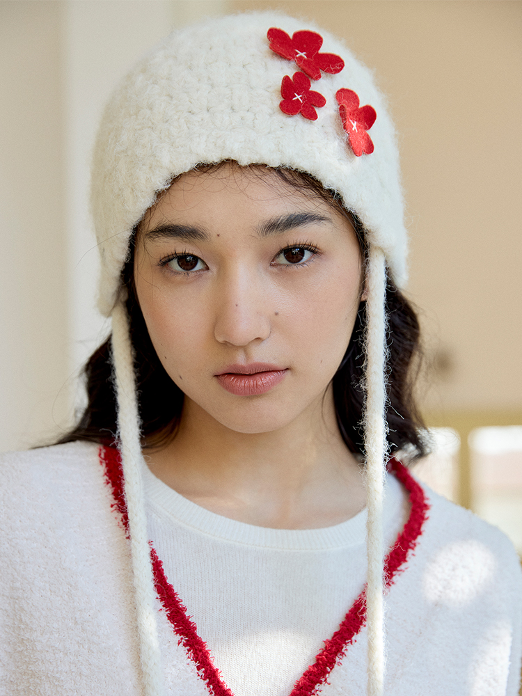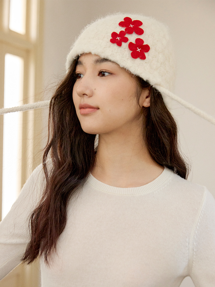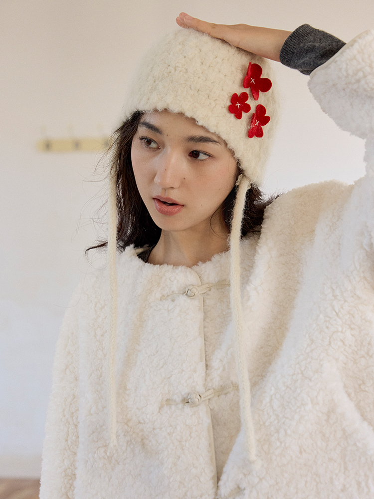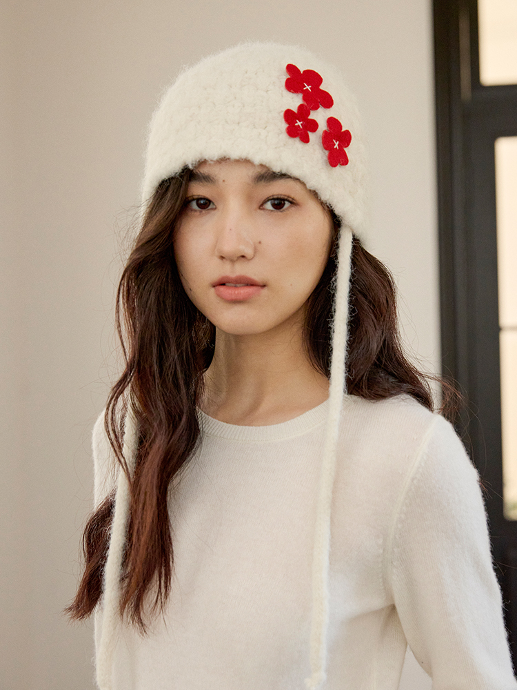 moreforPOEM 花朵毛毡羊毛针织小辫帽松软亲肤飞行毛线帽