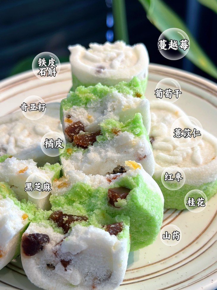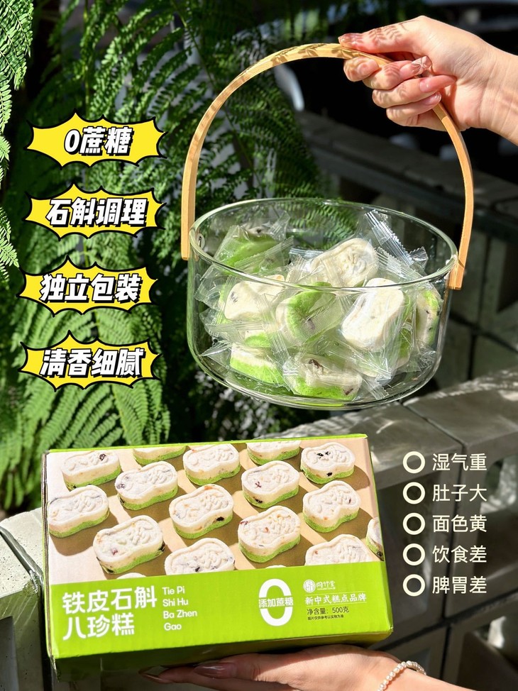 具有“清热、滋补、养生”的好处 且带有一股特殊的清香之味~ 不添加蔗糖,对于老人、戒糖人士来说很友好 轻食代餐增加饱腹感~( 吃起来醇香细腻,好吃不腻,健康营养美味 高颜值休闲小零食,给你贪吃解您的快乐感~ 铁皮石斛八珍糕有地方特色 出身于“烟火”,脱尘于“凡间” 咬上一口,甜而不腻 特有的“仙草”味,清香爽嘴,回味无穷