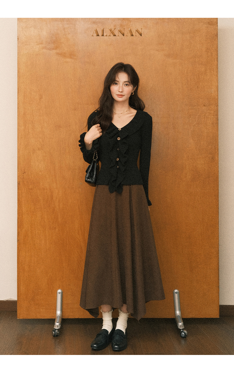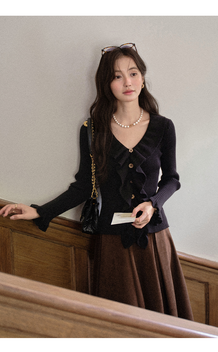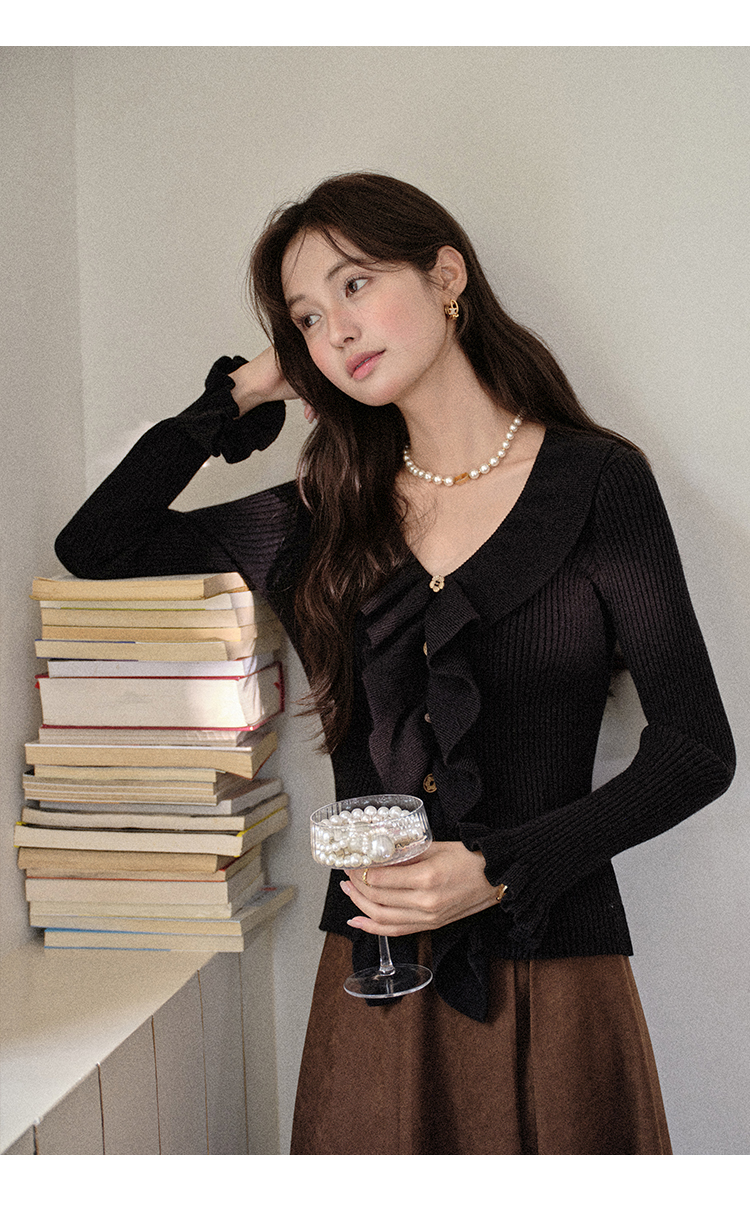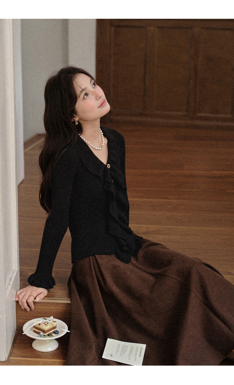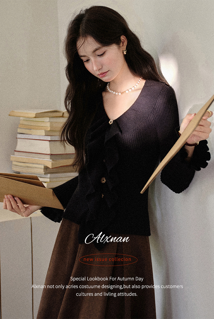 鹿向南「雪松与晚风」黑色长袖针织衫女秋新款设计感好看修身上衣L57006