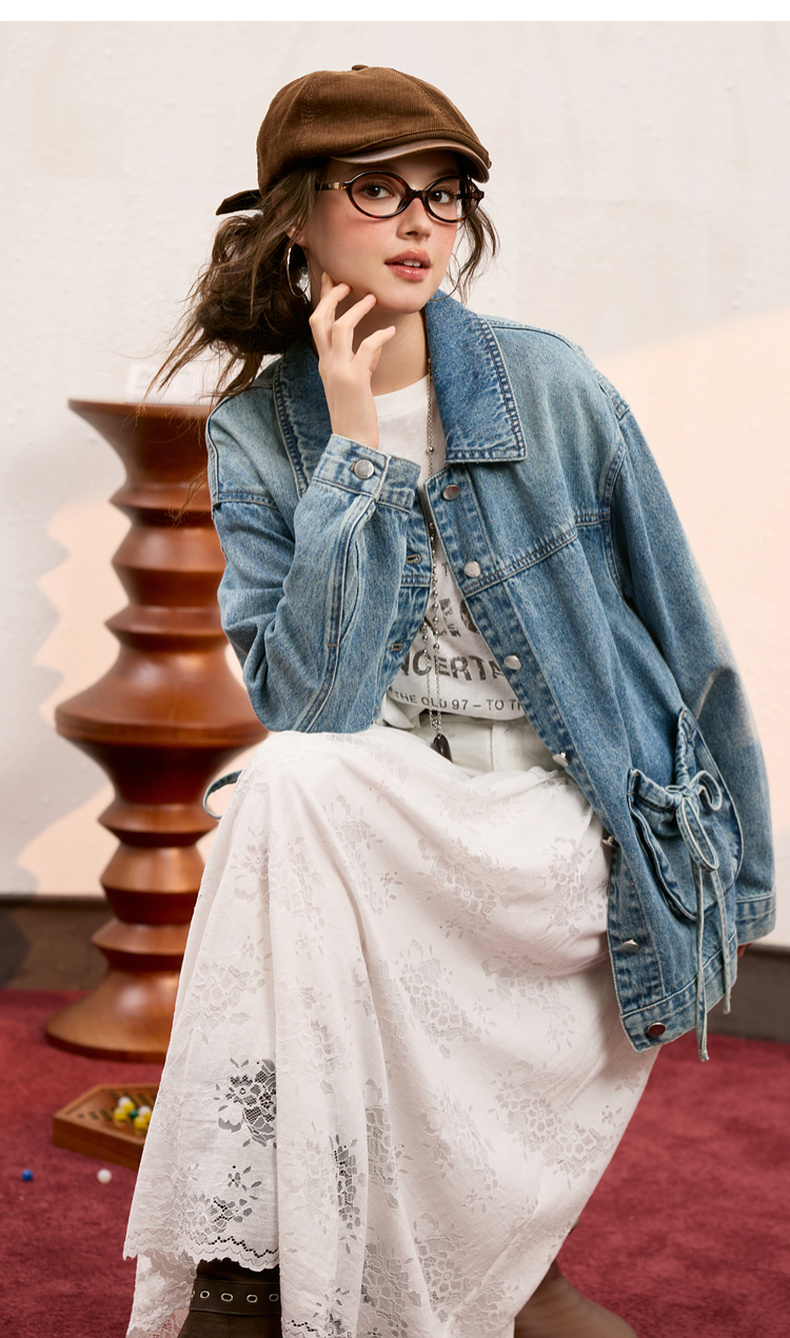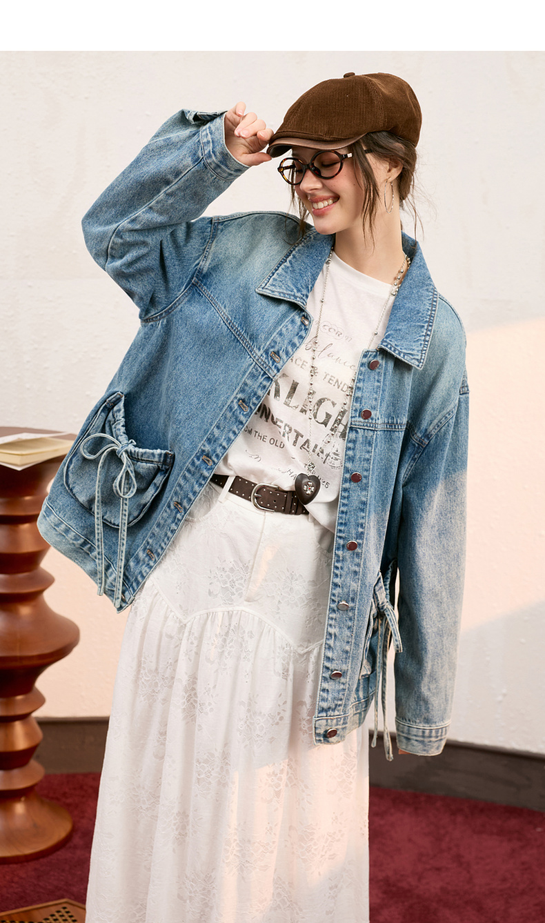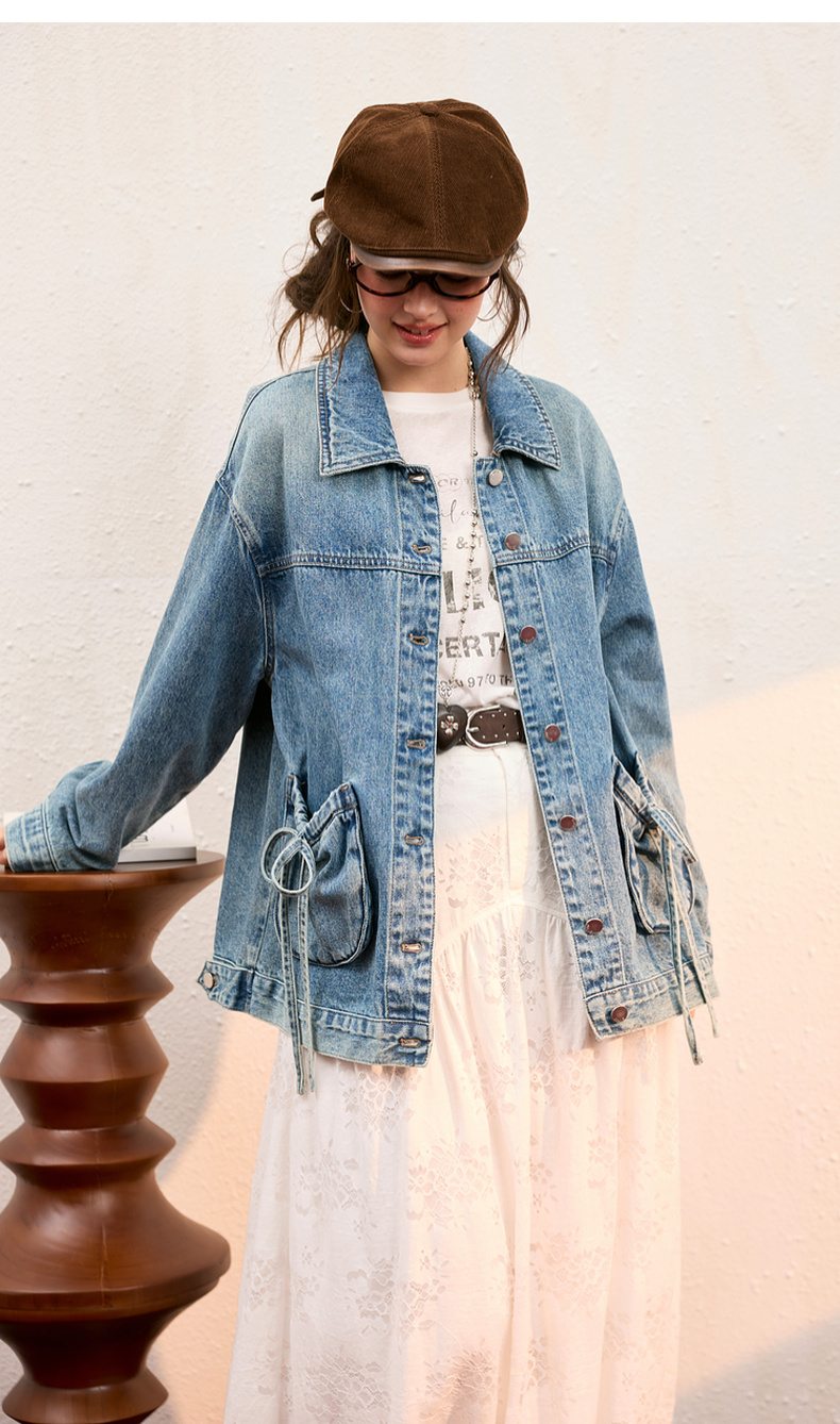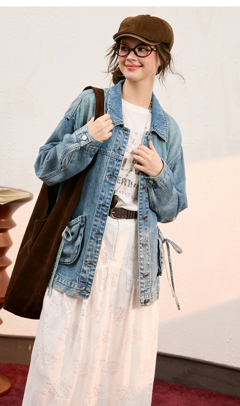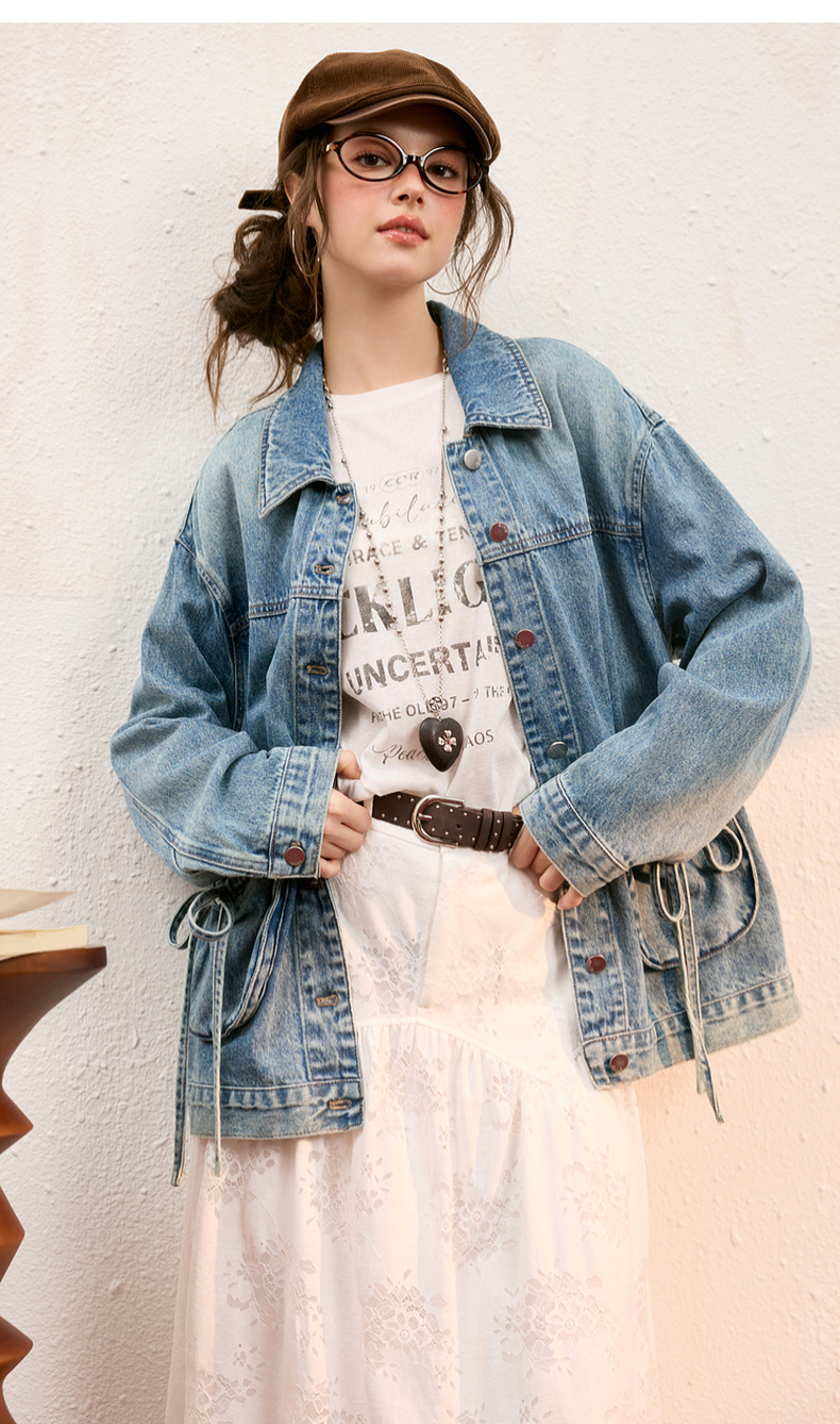 【100棉】三彩独醒2025秋季新款复古做旧宽松蝴蝶结牛仔服外套F