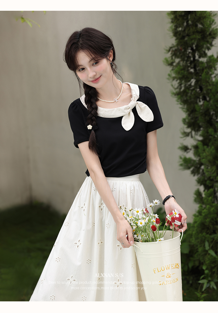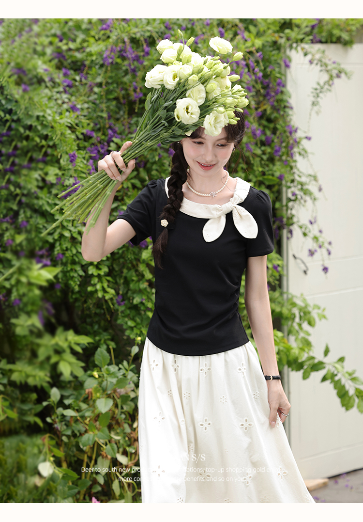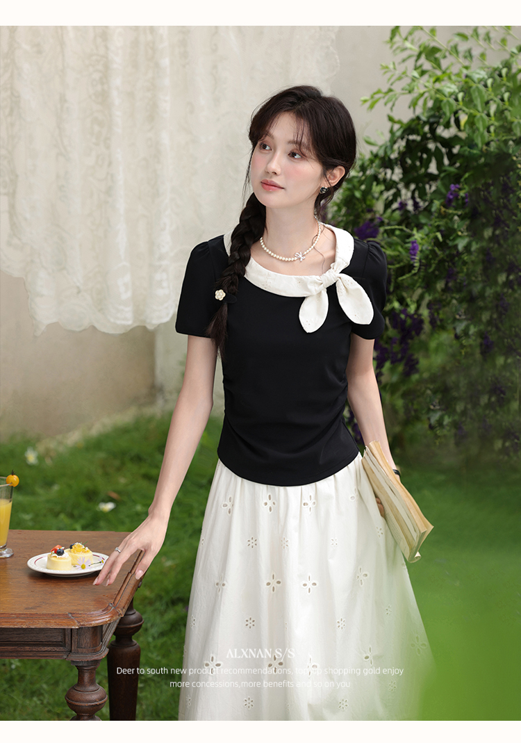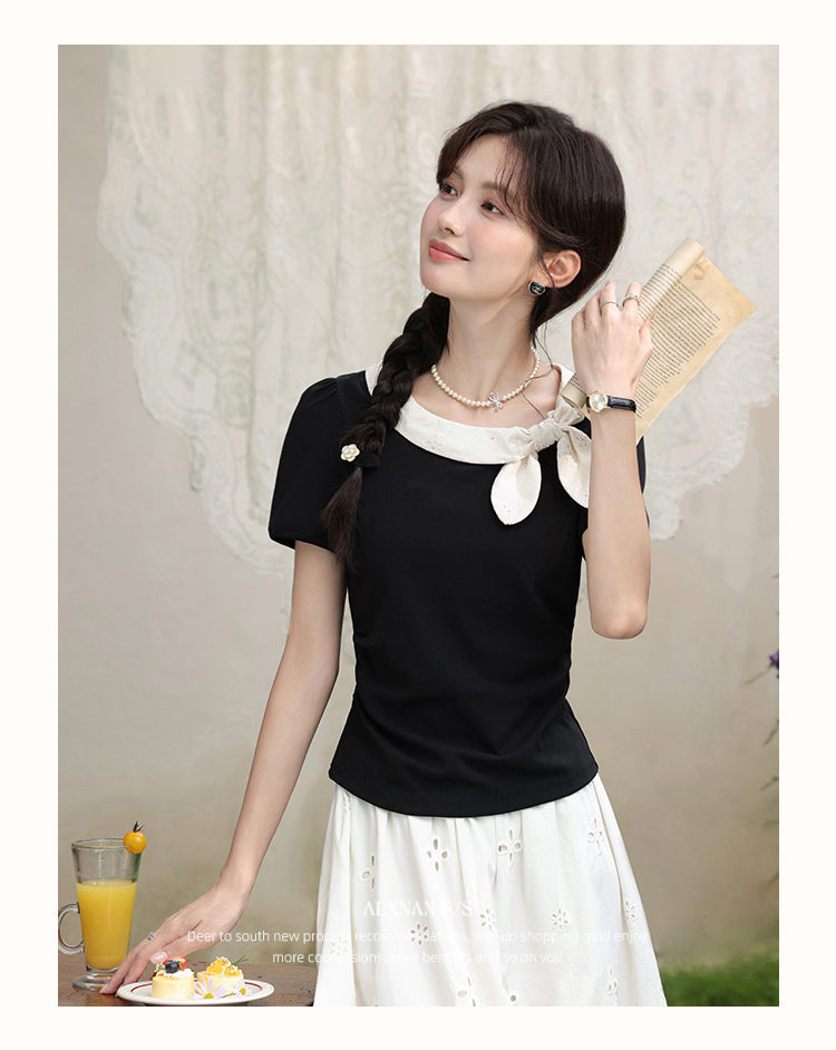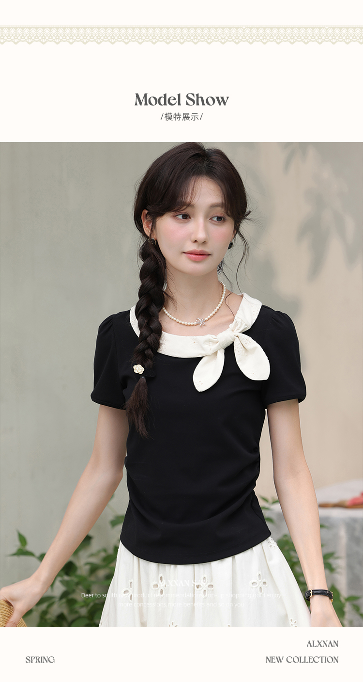 鹿向南「月光情诗」撞色蝴蝶结拼接黑色正肩短袖女夏T恤漂亮上衣