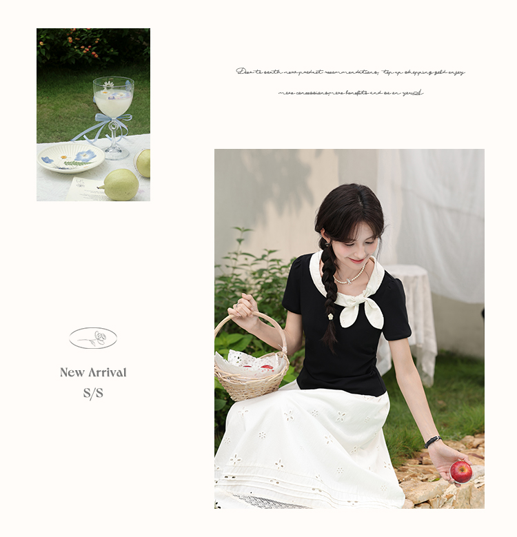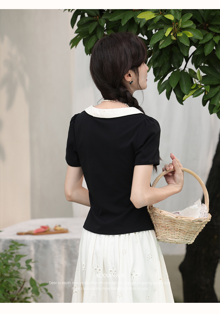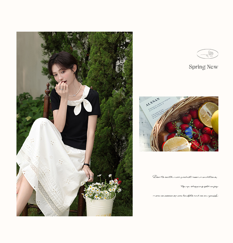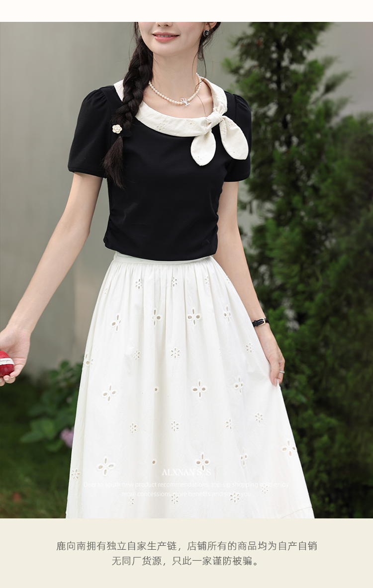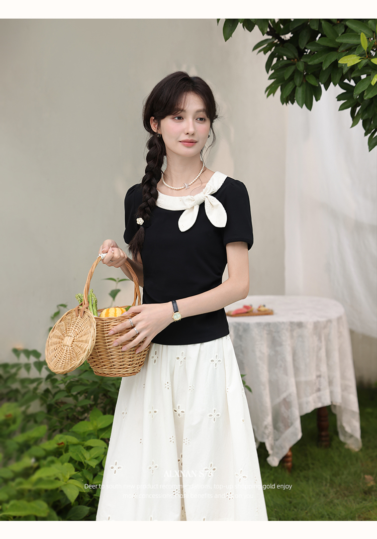 鹿向南「月光情诗」撞色蝴蝶结拼接黑色正肩短袖女夏T恤漂亮上衣