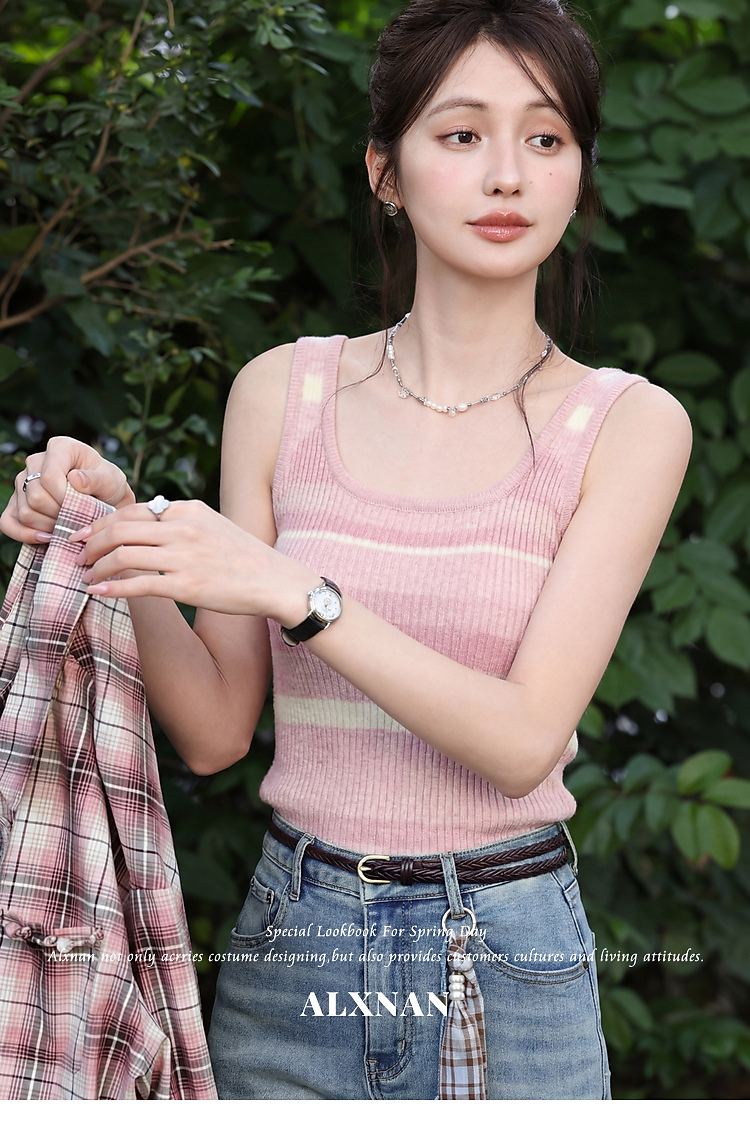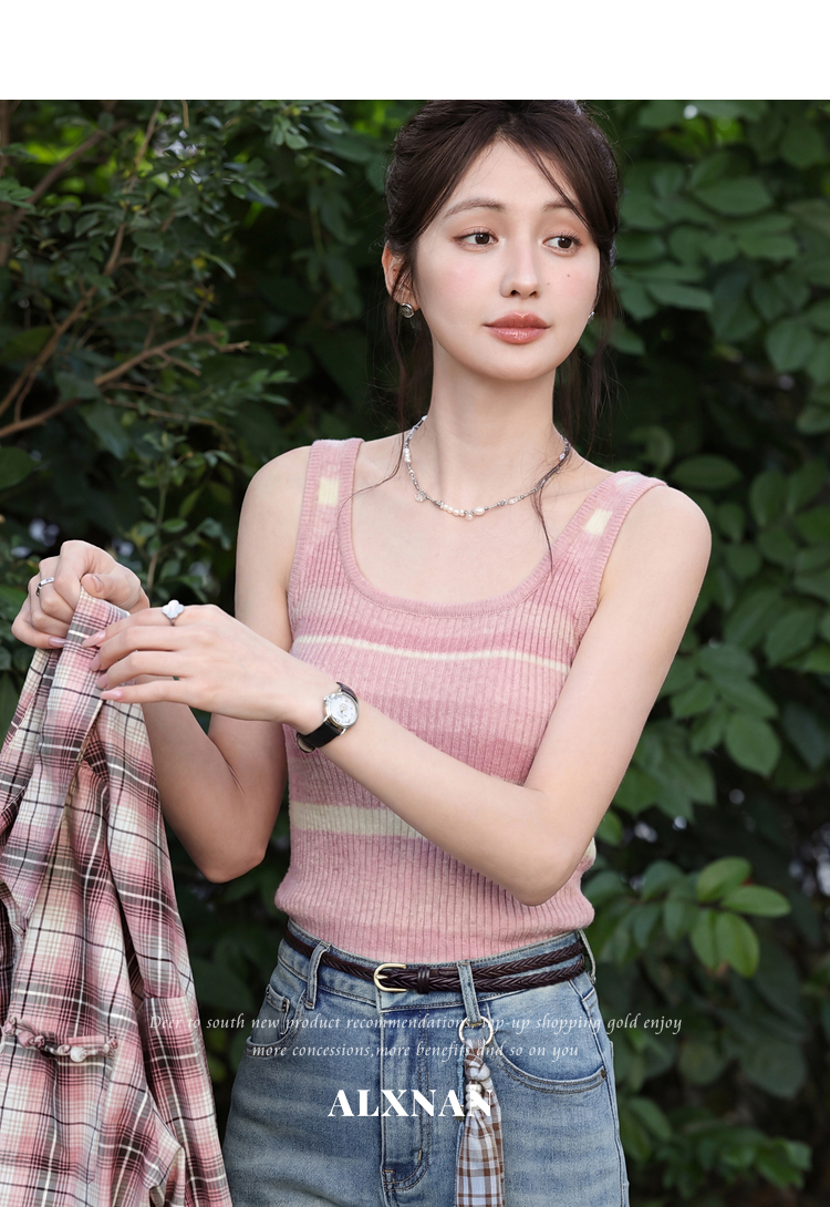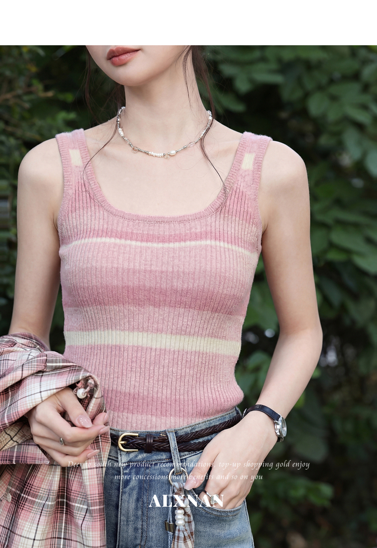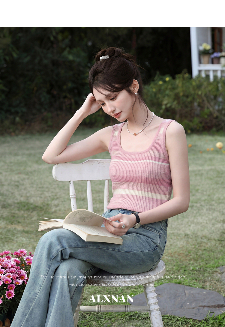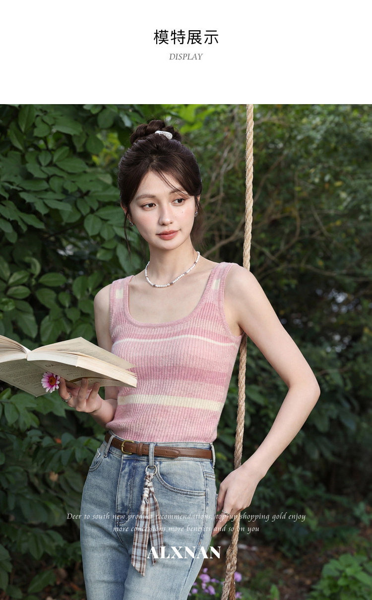 鹿向南「栖花浅影」粉色条纹吊带女夏季新款方领针织显瘦背心上衣