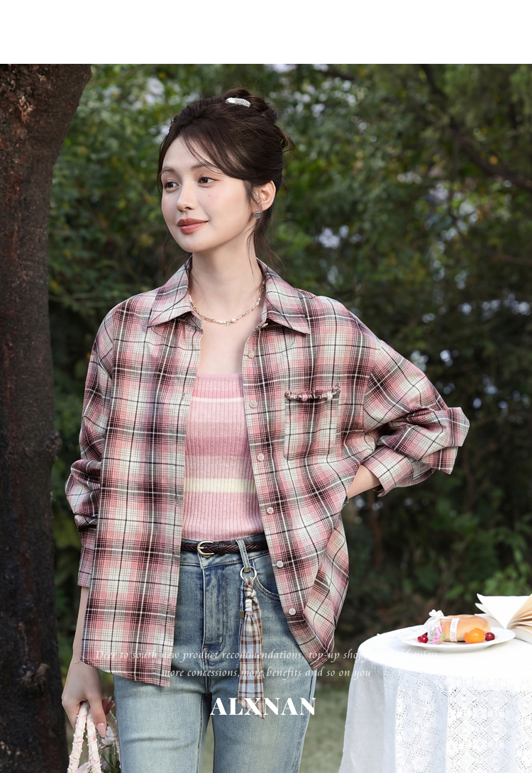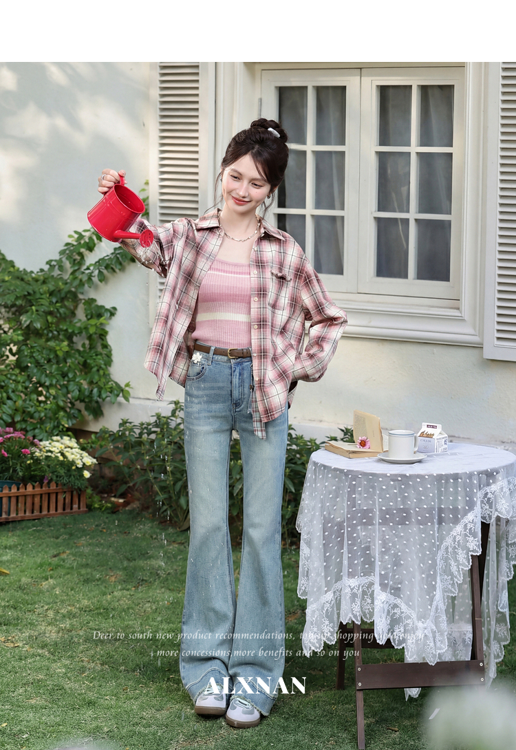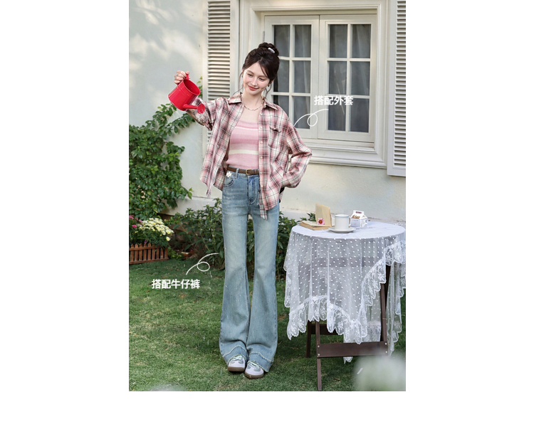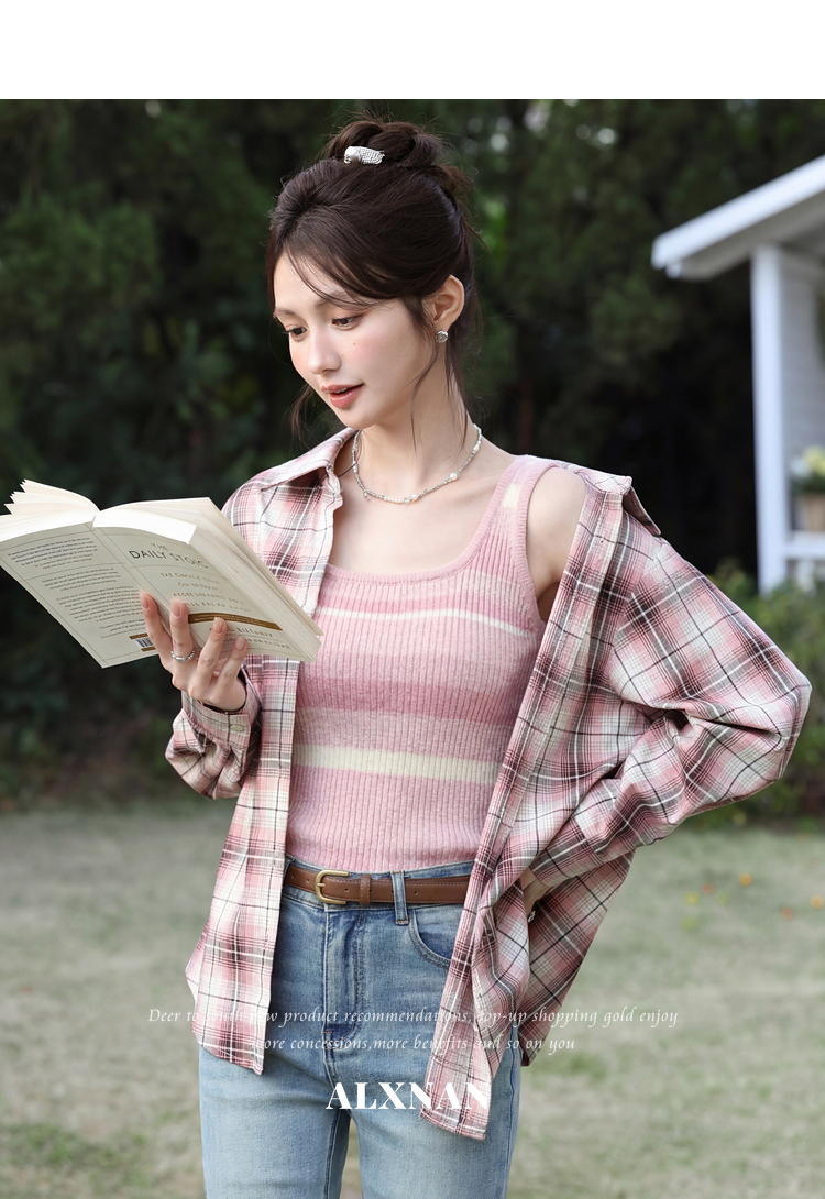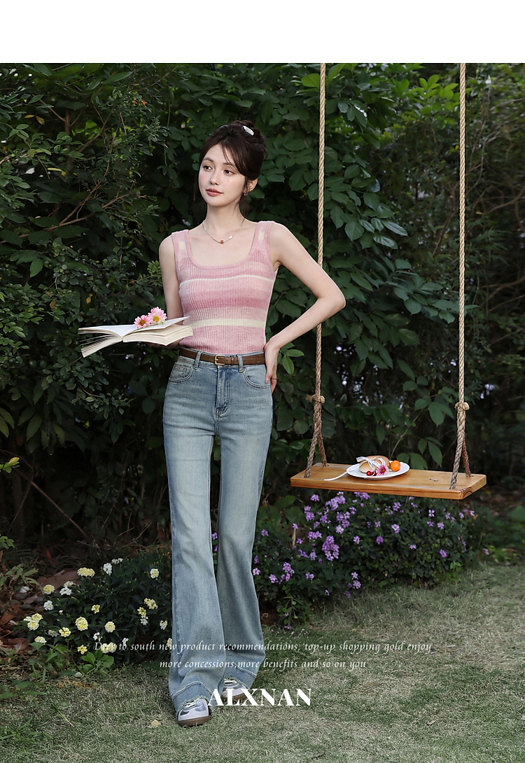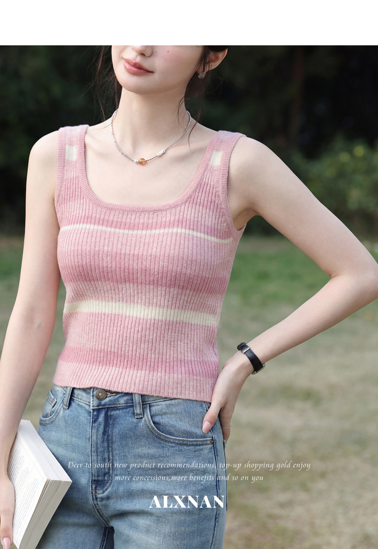 鹿向南「栖花浅影」粉色条纹吊带女夏季新款方领针织显瘦背心上衣